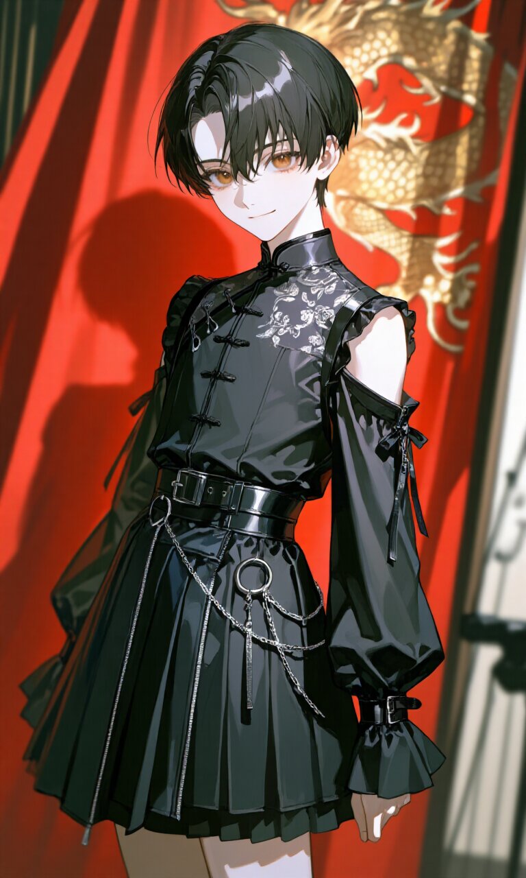 A masterpiece. High quality. A breathtakingly beautiful young man—a 19-year-old Japanese boy with an innocent expression. His soft black hair, revealing his forehead, falls gently to the sides, and his pale, almost luminous skin reacts vividly to the light. His warm brown eyes possess a quiet depth that draws you in; his irises are mesmerizing. A gentle smile He wears a mini-length Gothic Lolita-style dress made of black silk-like fabric featuring a delicate floral jacquard pattern. It features a Mandarin-style stand-up collar, an off-the-shoulder design, puff sleeves, and an asymmetrical pleated skirt. A wide leather belt cinches the waist, adorned with D-rings and chains. Zipper details also serve as accents. The background features a red cloth and a gold dragon tapestry. Fashion photography, Gothic Lolita, dark feminine, Captured from a slightly low angle. The depth of field is shallow, and the background is slightly blurred.