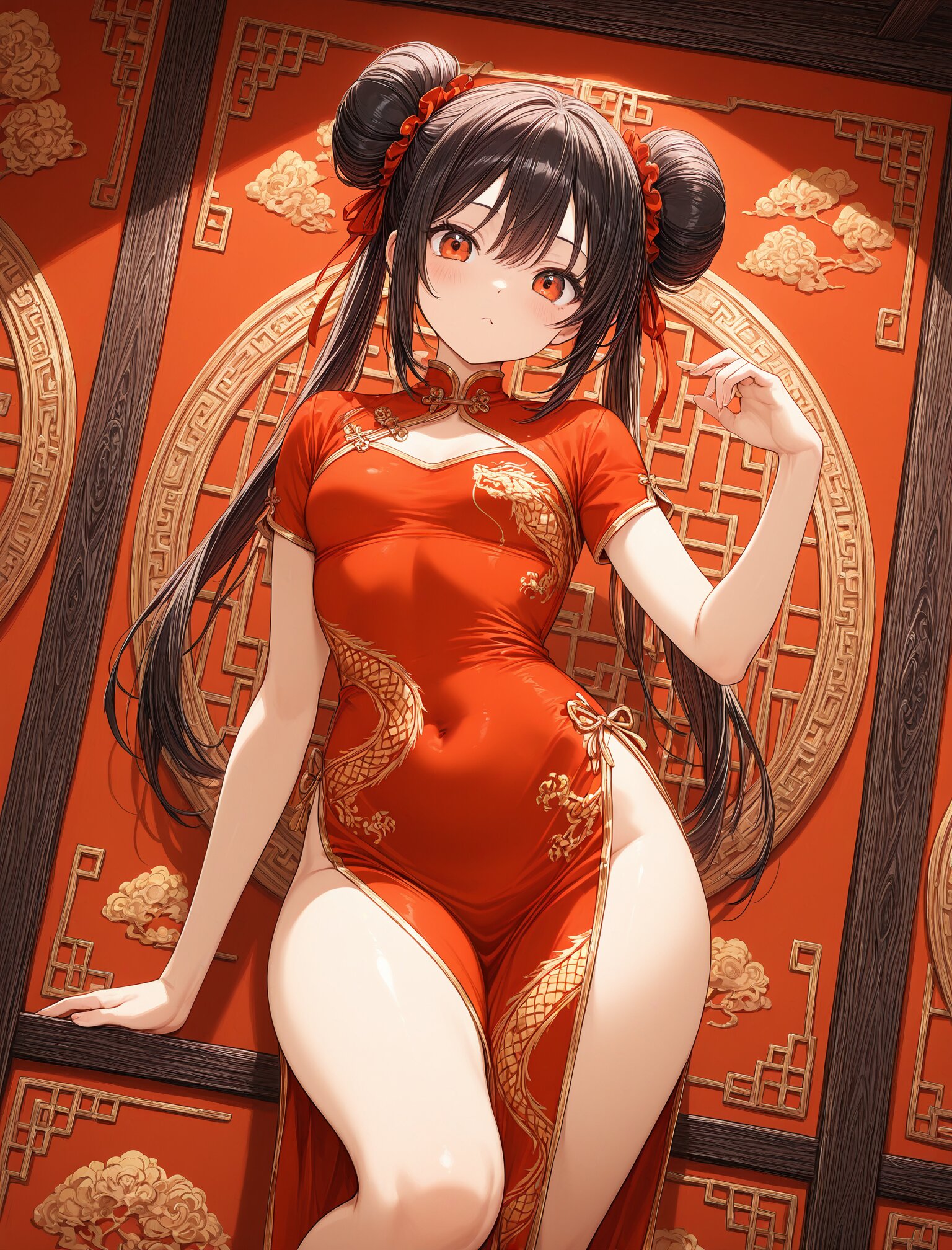 (great wall of china in background:1.3),traditional chinese atmosphere,red decorations, ,wearing a china dress,onepiece,short sleeves,curvy,small breasts,elegant pose,looking at viewer, dynamic angle,masterpiece,best quality,very aesthetic, <lora:StS-Illustrious-Detail-Slider-v1.0:2.> <lora:sdxl-hairdetailer_02:2>