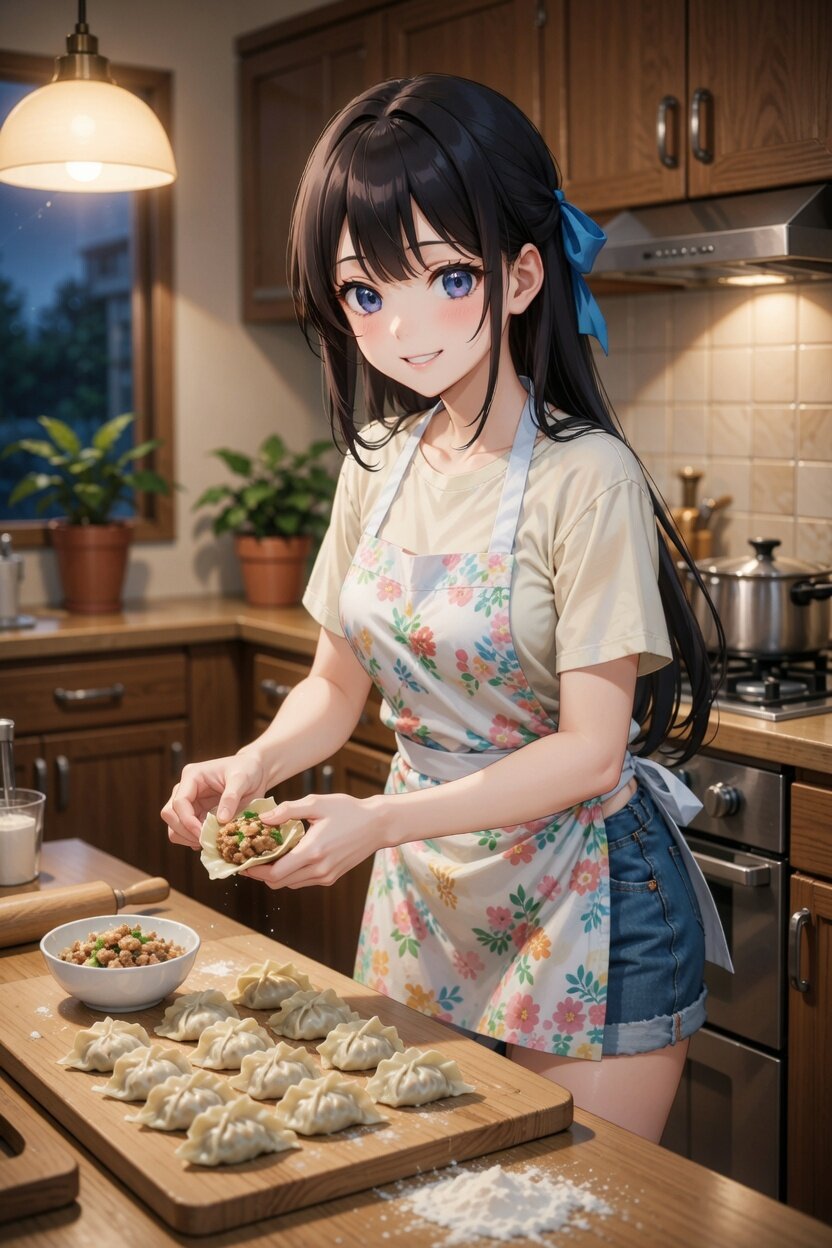 日本人女性24歳のデジタルイラスト。自宅のキッチンで夕食作り。餃子を作っている。カジュアルな服装をして、エプロンをつけている。