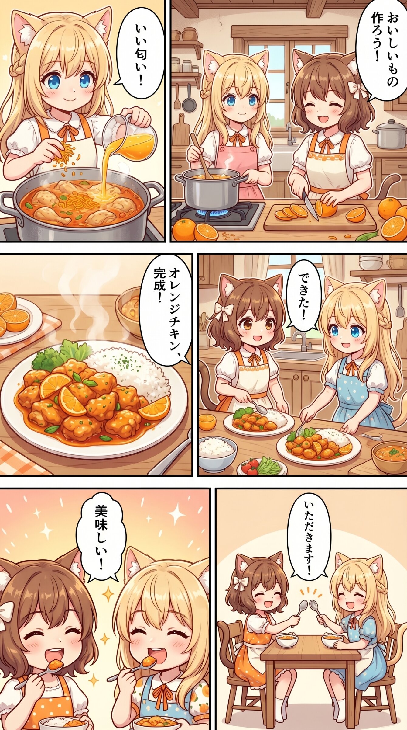 オレンジデーらしいふたりのエモいイラストにして。 ふたりともオレンジデーっぽい可愛い衣装。 ↓ このあとのシーンをカラー漫画にして。 ふたりでオレンジ料理を作って、仲良く食べる。 japanese manga page, multiple panels, manga layout, right-to-left reading order, top-right panel first, then left, then next row right to left, clear panel borders, dynamic composition, speech bubbles with japanese text, natural japanese dialogue placement, speech bubbles placed in correct reading order (right to left, top to bottom), panel flow guides eye movement naturally from right to left, no western comic layout,