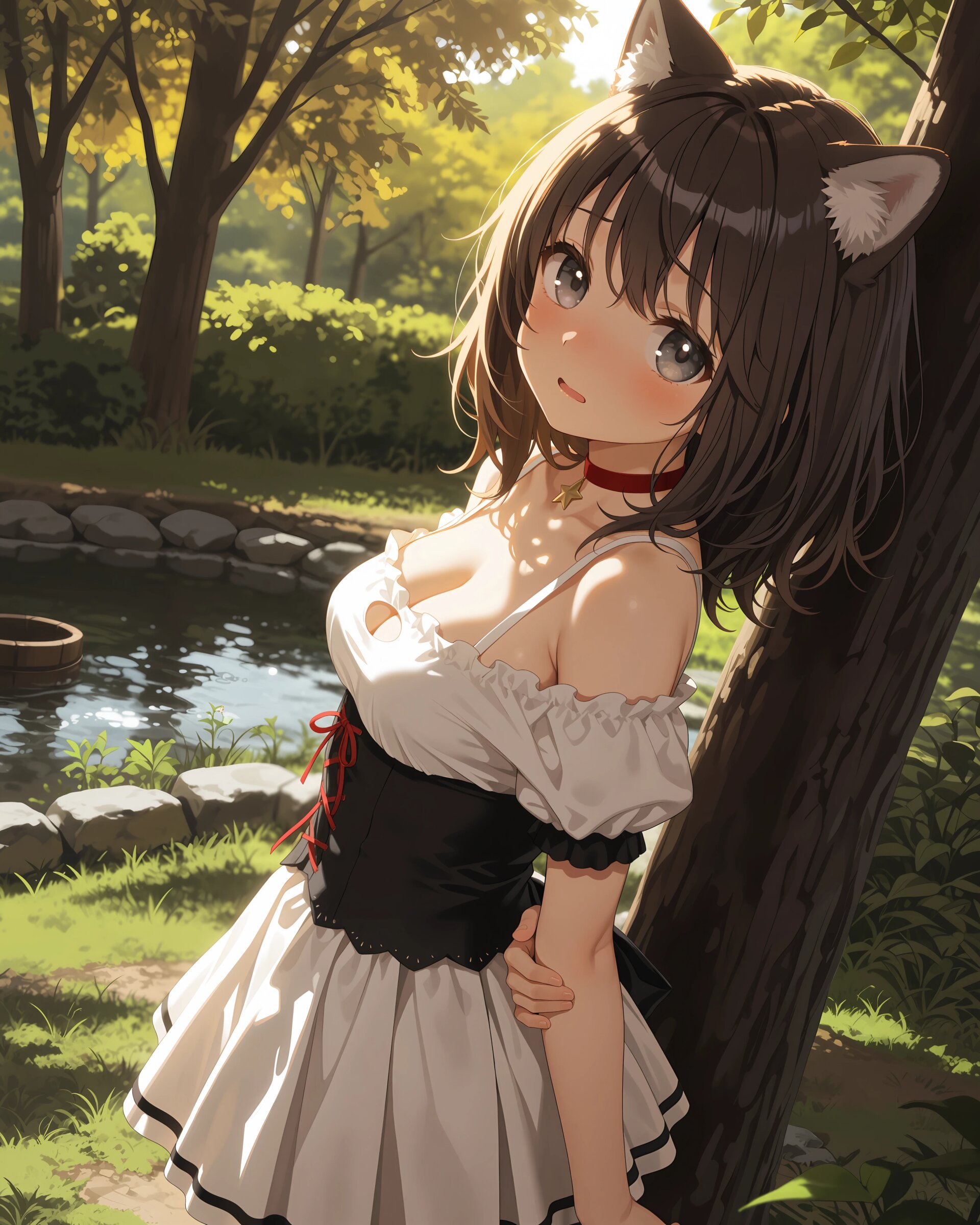 1girl, solo, colorfull, from side, portrait, looking at viewer, shiba inu girl, dark brown hair, (medium hair:1.2), (bob cut:0.9), slightly messy hair, hair_between_eyes, animal ears, dog ears, black ears, fluffy ears, grey eyes, soft eyes, tareme, jitome, large eyes, detailed eyes, light reflection in eyes, smooth skin, glossy skin, medium breasts, perky breasts, cleavage, white blouse, red ribbon, black maid dress, off shoulder, puffy short sleeves, black sleeves, black corset, pleated skirt, white skirt, red choker, star pendant, (blush:1.2), (shy:1.2), :>, knees up, hand on own leg, anime style, soft lighting, natural light, depth of field, soft shading, subsurface scattering, soft shadows, warm lighting, cinematic lighting, clean lineart clear silhouette, masterpiece, best quality, newest, absurdres, highres, very awa,
