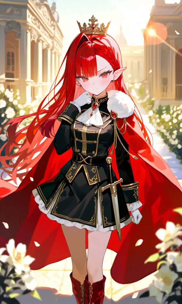 A stunning 18-year-old girl with vibrant red straight hair styled in asymmetrical bangs stands proudly in a grand palace courtyard. Her delicate features include V-shaped brows, slanted red eyes, pointed ears, and a (blush) on her cheeks that accentuates her shy yet confident expression. She wears an exquisite (Black luxurious Prince costume with gold trim:1.6) with long sleeves, paired with a (luxurious Red Cape:1.3) that billows dramatically behind her. The outfit is completed with a (luxurious Black mini skirt:1.4), (luxurious Red Boots:1.3), and (luxurious White gloves:1.3). A (dagger on waist:1.3) and (luxurious crown on head:1.4) signify her noble status. The background features intricate Rococo architecture with romantic and classic academic influences, surrounded by blooming flowers in the golden afternoon (sunlight). Sunbeams create lens flares that highlight her radiant presence. Every detail is meticulously rendered - from the texture of her costume's gold embroidery to the individual strands of her flowing hair and the delicate petals of surrounding flowers. The composition blends fantasy elegance with royal grandeur, capturing a moment of quiet confidence in the warm glow of daylight.