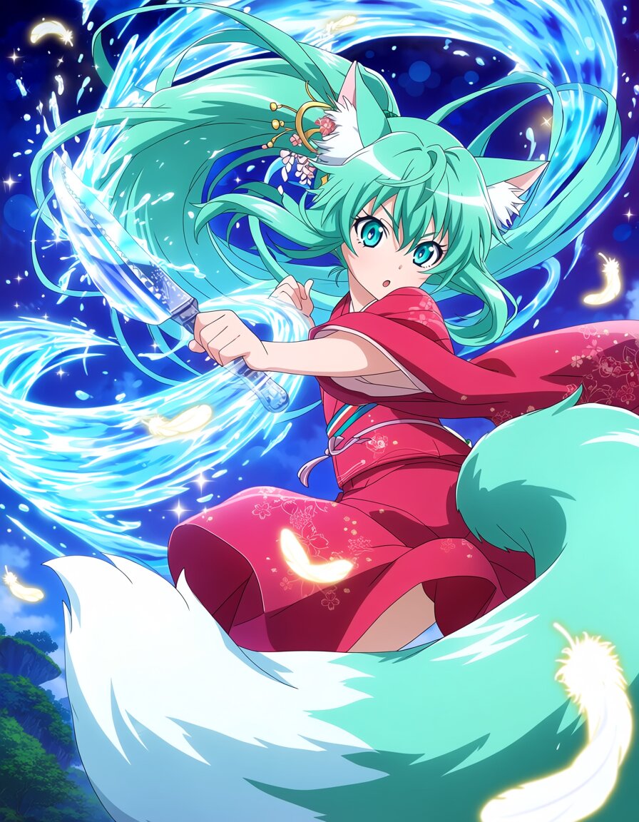 masterpiece, best quality, newest, (score_9, score_8, score_7:0.25), ultra-detailed, absurdres, beautiful anime illustration, vibrant anime style, clean lineart, sharp details, cel-shading with soft gradients, anime screencap, cute girl, 20 years old, youthful babyface, innocent-looking young face, large expressive anime eyes, mint green hair tied in a high ponytail with a delicate kanzashi hair ornament, hair flowing wildly and dynamically in strong wind with beautiful anime motion lines, bright emerald blue eyes with strong iridescent highlights and captivating sparkle, flat chest, slender athletic build, casual red kimono with small floral patterns, elegant flowing folds and fabric highlights, (fluffy fox ears:1.35), (fluffy fox tail spreading naturally behind her:1.35), extreme low angle, knife tip perspective, from the point of the ordinary ice knife looking back at viewer, swinging a normal-sized ice kitchen knife made of beautiful transparent ice, dynamic swing motion, ice blade reflecting light beautifully with sparkling refractions and crystalline shine, intense concentration, expressive eyes full of determination and focus, powerful water stream effect, water bursting and splashing violently from the ice knife, swirling glowing blue water currents with anime speed lines, sparkling water droplets flying toward camera, white feathers and water mist dancing in the wind, cinematic anime lighting, strong rim-lighting from behind making hair and silhouette glow intensely, volumetric god rays, soft atmospheric haze, beautiful bokeh background, intricate details on fabric and accessories, flowing dynamic movement in hair, kimono and fox tail, motes of glowing magic particles and sparkling water droplets floating in the air, fantasy otherworld background, magical floating islands and ancient forest seen from below, dramatic perspective, depth of field