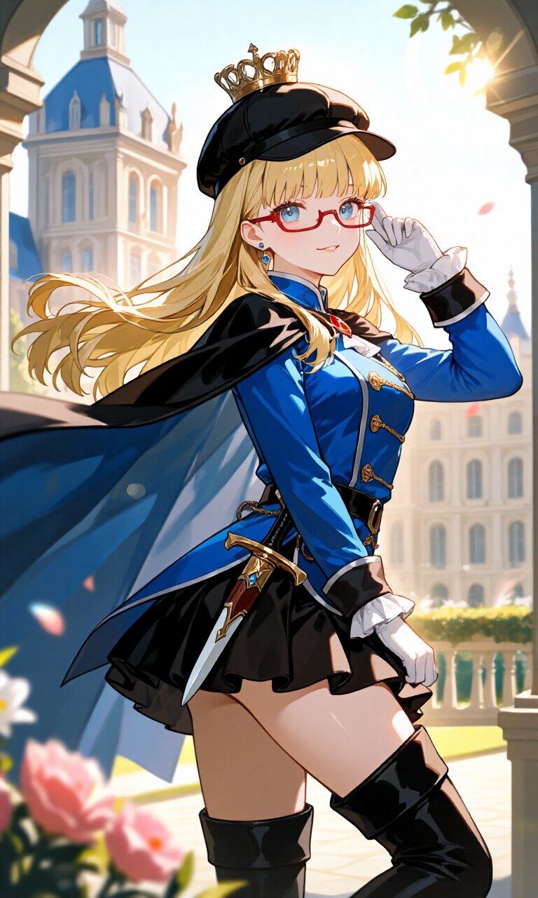 a 15-year-old girl with long blonde hair and bangs framing her delicate face, wears a black newsboy hat and semi-rimless red-framed eyewear. Her blue eyes sparkle behind the glasses, and she sports small earrings. She is dressed in a (Blue luxurious Prince costume:1.6) with long sleeves, paired with a (luxurious Black mini skirt:1.4) and (luxurious Black Boots:1.3). A (luxurious Black Cape:1.3) flows behind her, and she wears (luxurious White gloves:1.3). At her waist rests a (dagger on waist:1.3), and atop her head sits a (luxurious crown:1.4). She strikes a cute pose with a light smile and parted lips, exuding charm. The background features a grand Palace with Baroque architecture, surrounded by flowers in the soft afternoon light. Sunlight creates lens flares and a hazy, romantic atmosphere with bloom effects, enhancing the dreamy, academic-inspired setting. The image is rendered in insanely detailed 16k quality, showcasing intricate textures in her hair, skin, and luxurious clothing.