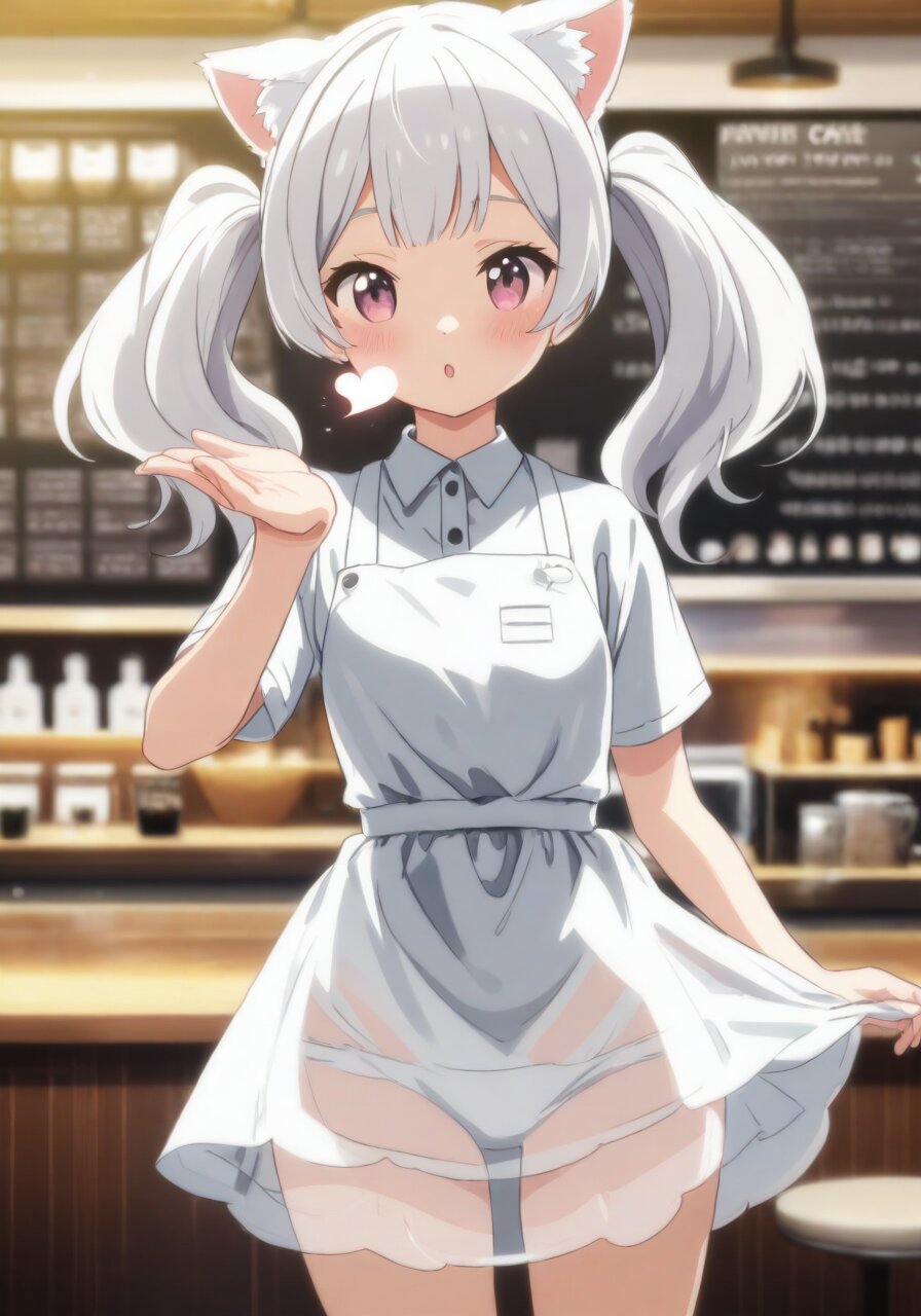 アニメ調の絵、1人の女の子、17歳、かわいい、タレ目、白猫のコスプレ、猫耳、白髪、ツインテール、きらきらしている、投げキス、ハートが飛ぶ、透けたスカートをはく、エプロン、喫茶店内、,((8k,Ultra HD,Best quality:1.2)), (two hands per person), ((Fix hands,fix fingers)), ((Anti-disabled hands)), ((Detailed hands,Ultra Detailed,Realistic hands,Natural hands)), (Very nice hands)