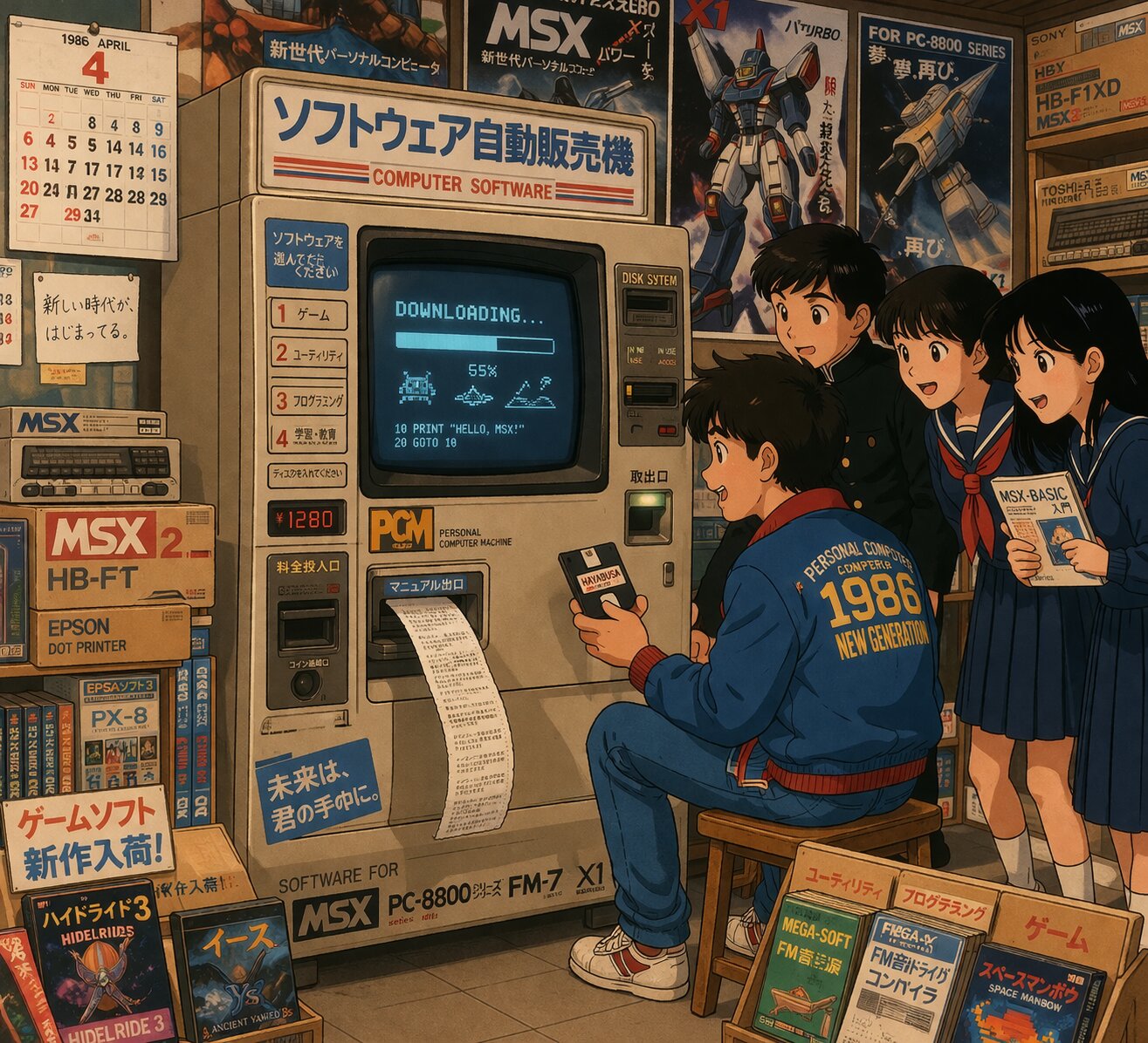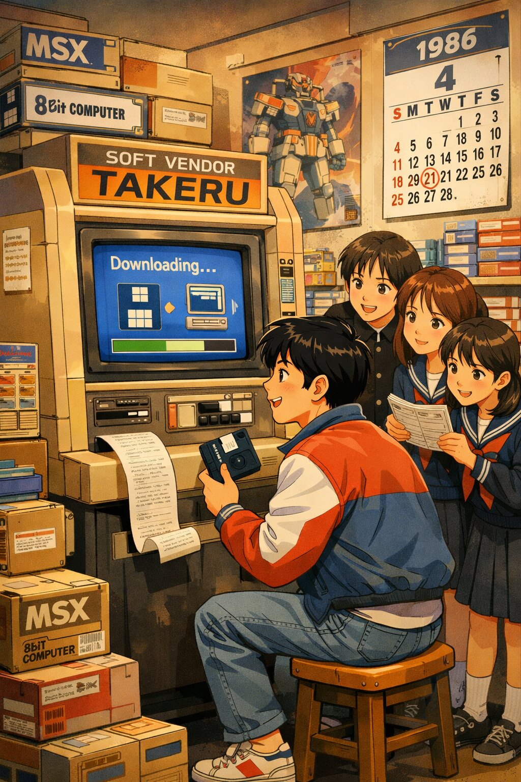 A nostalgic, 1980s Japanese "City Pop" style anime illustration. The scene is set inside a cluttered, cozy Japanese personal computer shop in 1986. In the center is a large, retro-futuristic vending machine for computer software with a tan-colored industrial chassis, resembling a cross between an ATM and a jukebox. A CRT monitor on the machine displays a simple "Downloading..." progress bar and pixel art icons. A teenage boy in a 80s casual jacket sits on a wooden stool in front of the machine, holding a 3.5-inch floppy disk and watching the screen with excitement. A long strip of thermal paper (a manual) is being printed from a slot in the machine. To the side, a group of curious high school students in classic school uniforms are peeking over, holding a thin, stapled paper booklet. The background is filled with stacked cardboard boxes of "MSX" and "8nd-generation" vintage computers, posters with robot illustrations, and a wall calendar showing "April 1986". The lighting is warm and slightly grainy, capturing the analog-to-digital transition era. Clean lines, cel-shaded, vibrant yet slightly muted retro color palette.