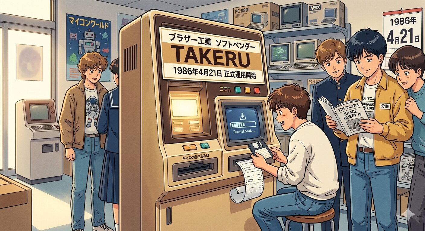 ブラザー工業が開発した世界初のパソコンソフト自動販売機「ソフトベンダーTAKERU(当初の名称は『武尊』)」の運用史において、1986年4月21日は試験運用期間を経て本サービス(正式運用)へと移行した重要な転換点として位置づけられる。以下にその概説を記す。