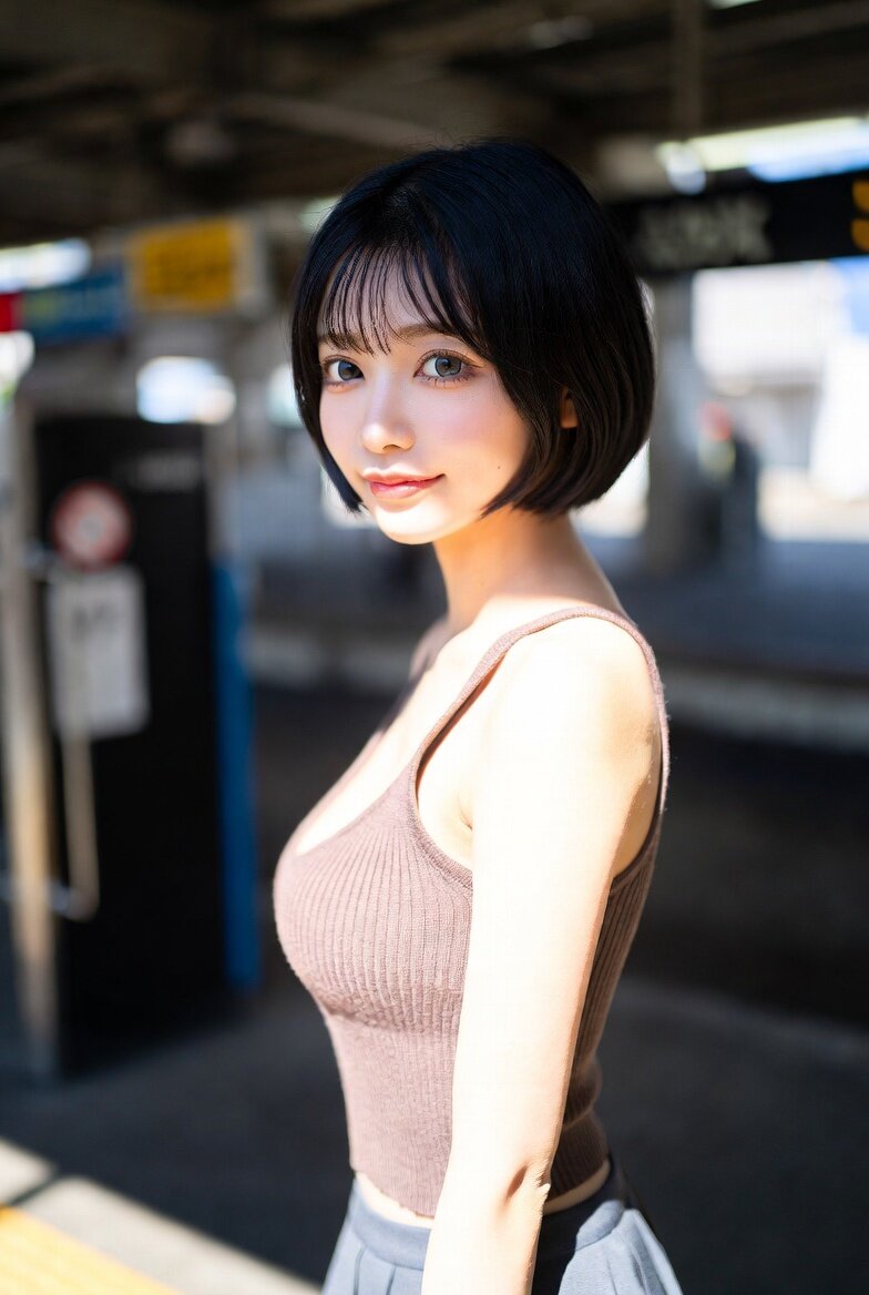 日本人女性20歳のリアルな写真。プロのカメラマンが撮影。 short bob haircut with bangs, black hair, large sparkling eyes, gentle smile, soft expression, looking at viewer。ライトブラウンのノースリーブのニットを着ている。グレーのミニスカート。横からの構図。駅のタクシー乗り場が背景。自然光。