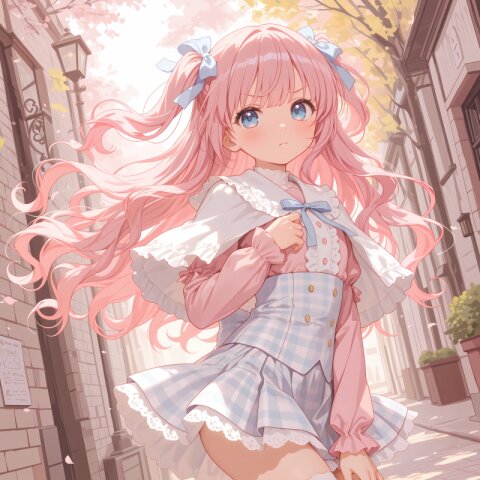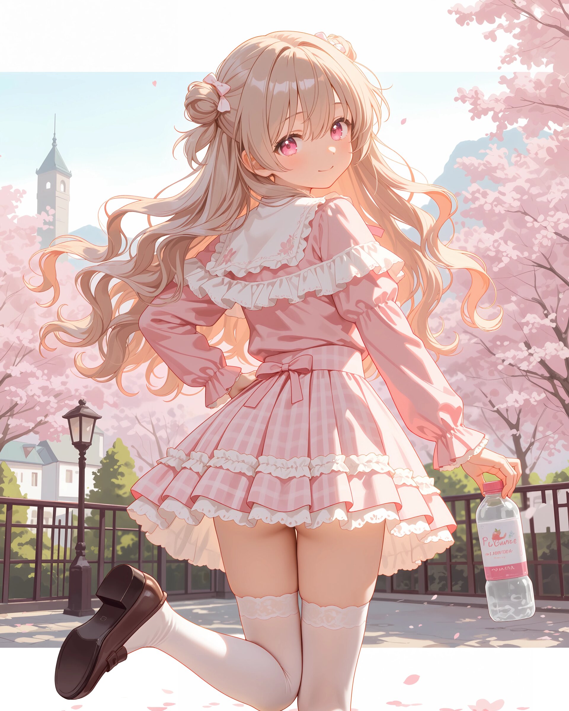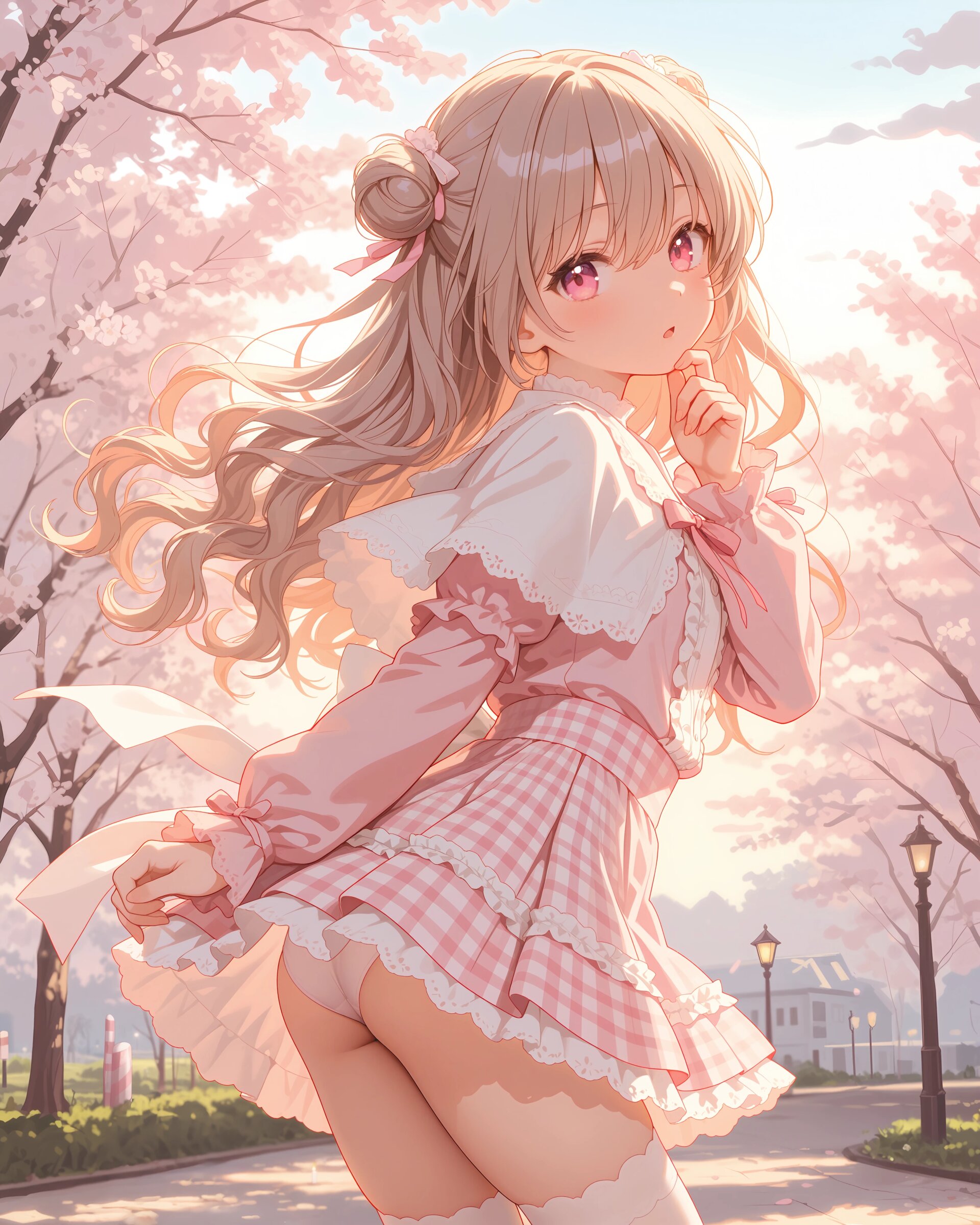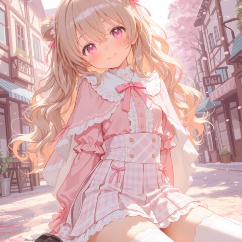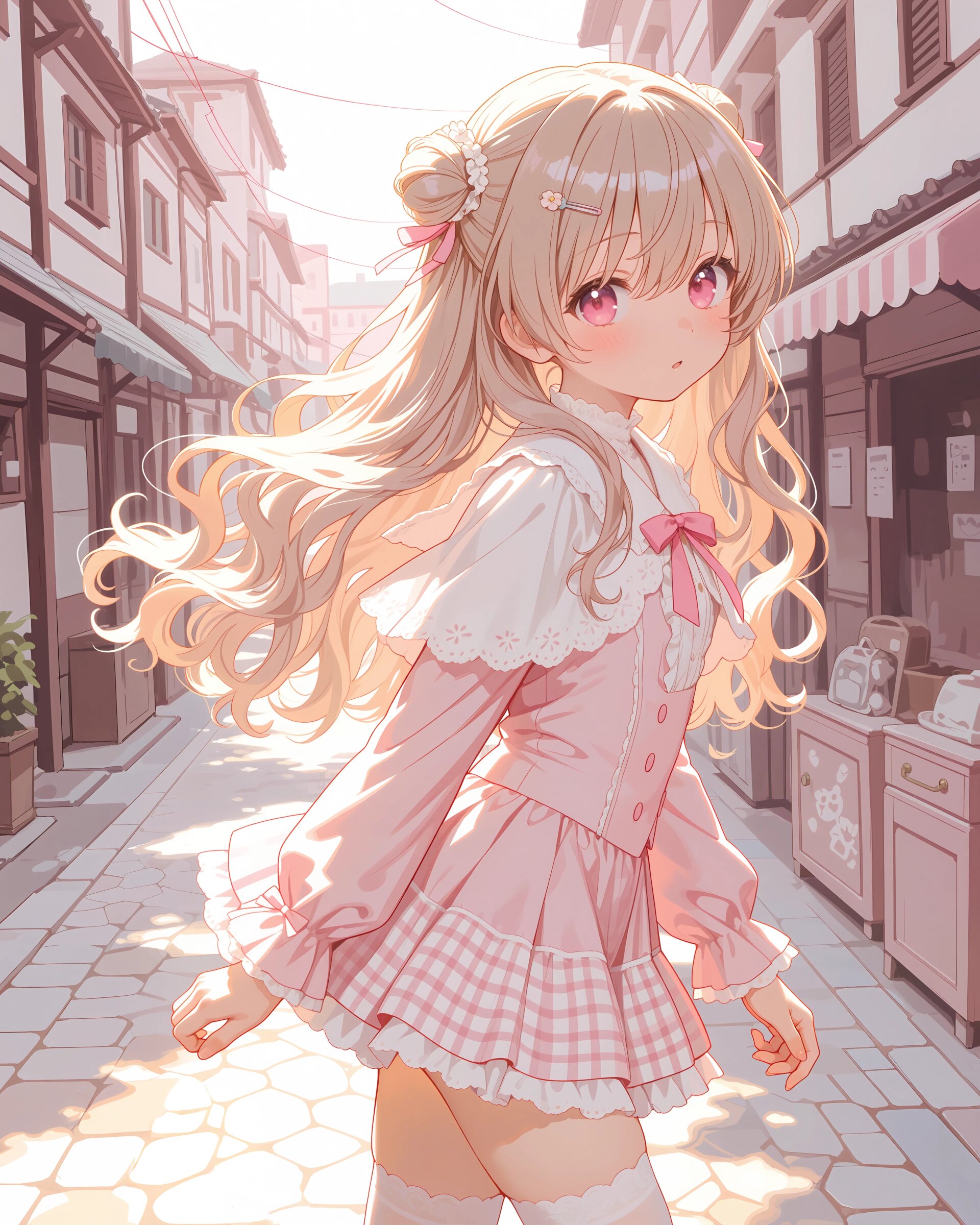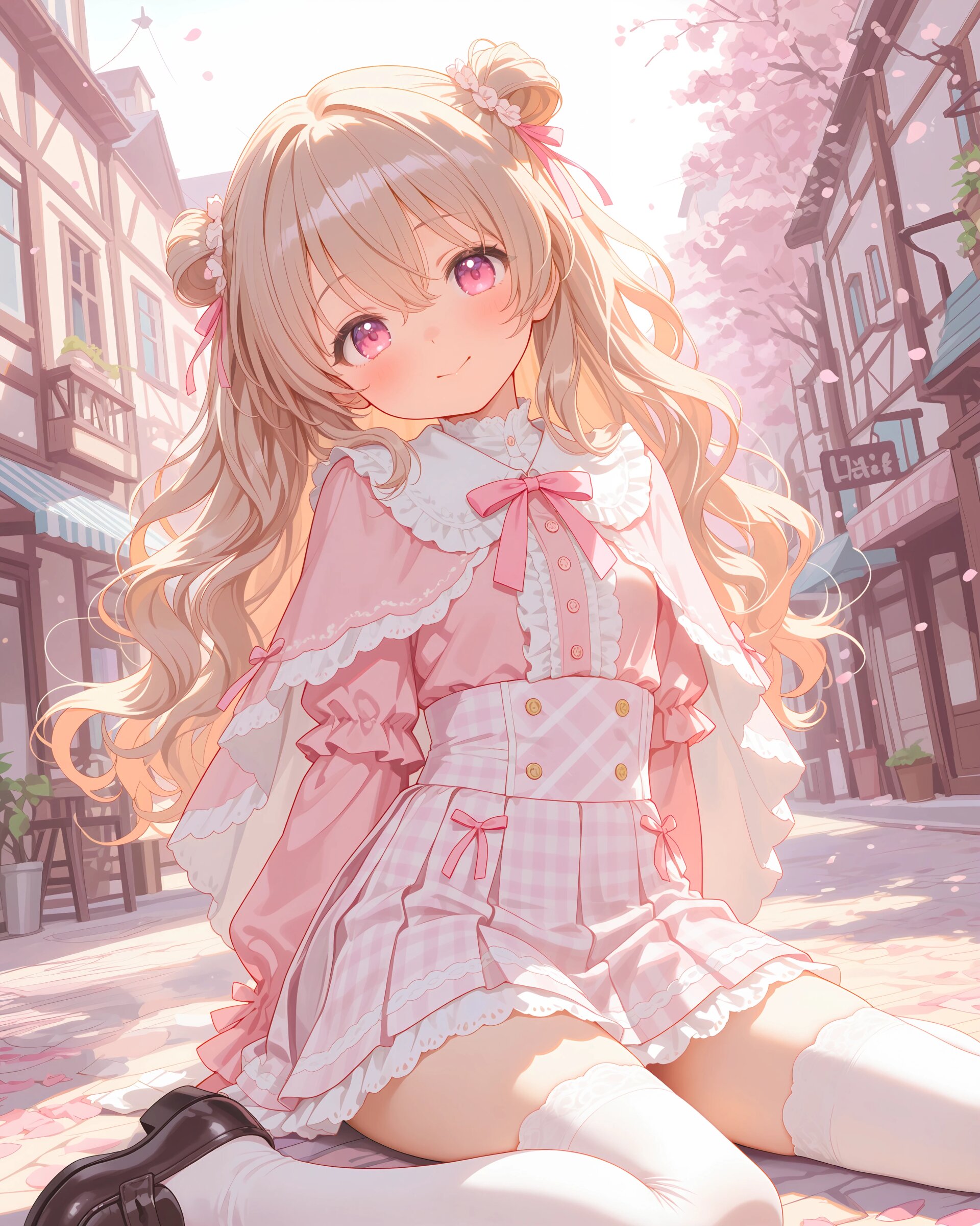 1girl, solo, colorful, from behind, cropped shoulders, town, pastel colors, soft lighting, detailed background, outdoor cafe street, spring day, wearing: frilled blouse, pastel pink frilled blouse with lace collar and puff sleeves, short capelet OR shoulder cape in matching pastel lavender, checkered mini skirt in soft pastel pink and white plaid, pleated check mini skirt, white knee socks OR pastel thighhighs, brown loafers OR penny loafers, kawaii lolita fashion, sweet lolita inspired, girly, innocent look, detailed frills, lace trim, ribbon details, (cute girl, pink eyes, cute eyes, large eyes, pink ribbon, light brown hair, medium long wavy hair, two small buns, bangs between eyes, bobby pin, flat chest), blush, :>, wariza, arms behind back, thighs, book, clean lineart, clear silhouette, masterpiece, best quality, newest, absurdres, highres, very awa,