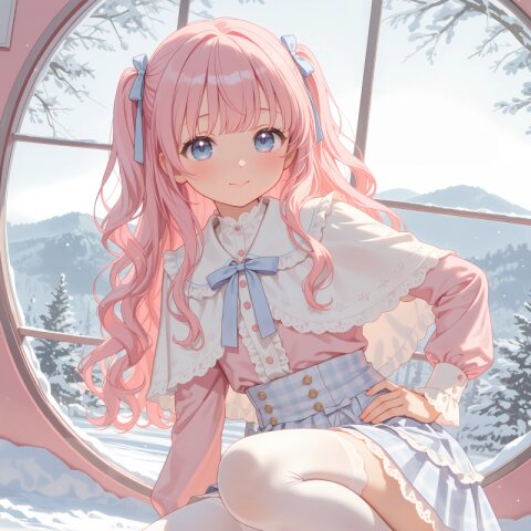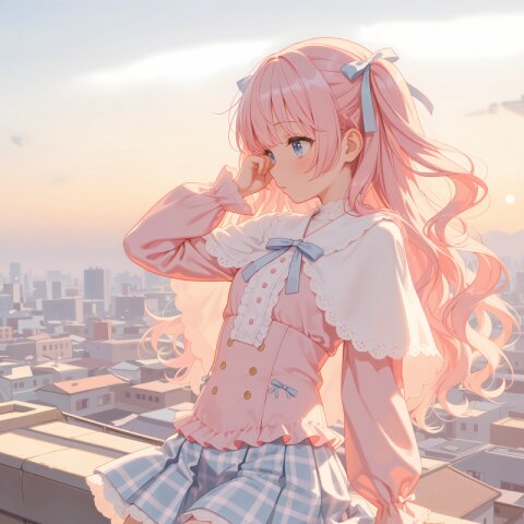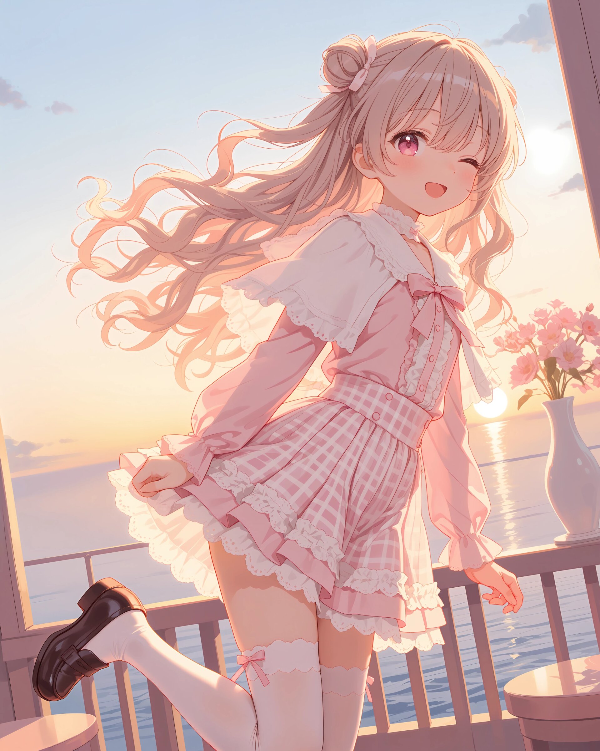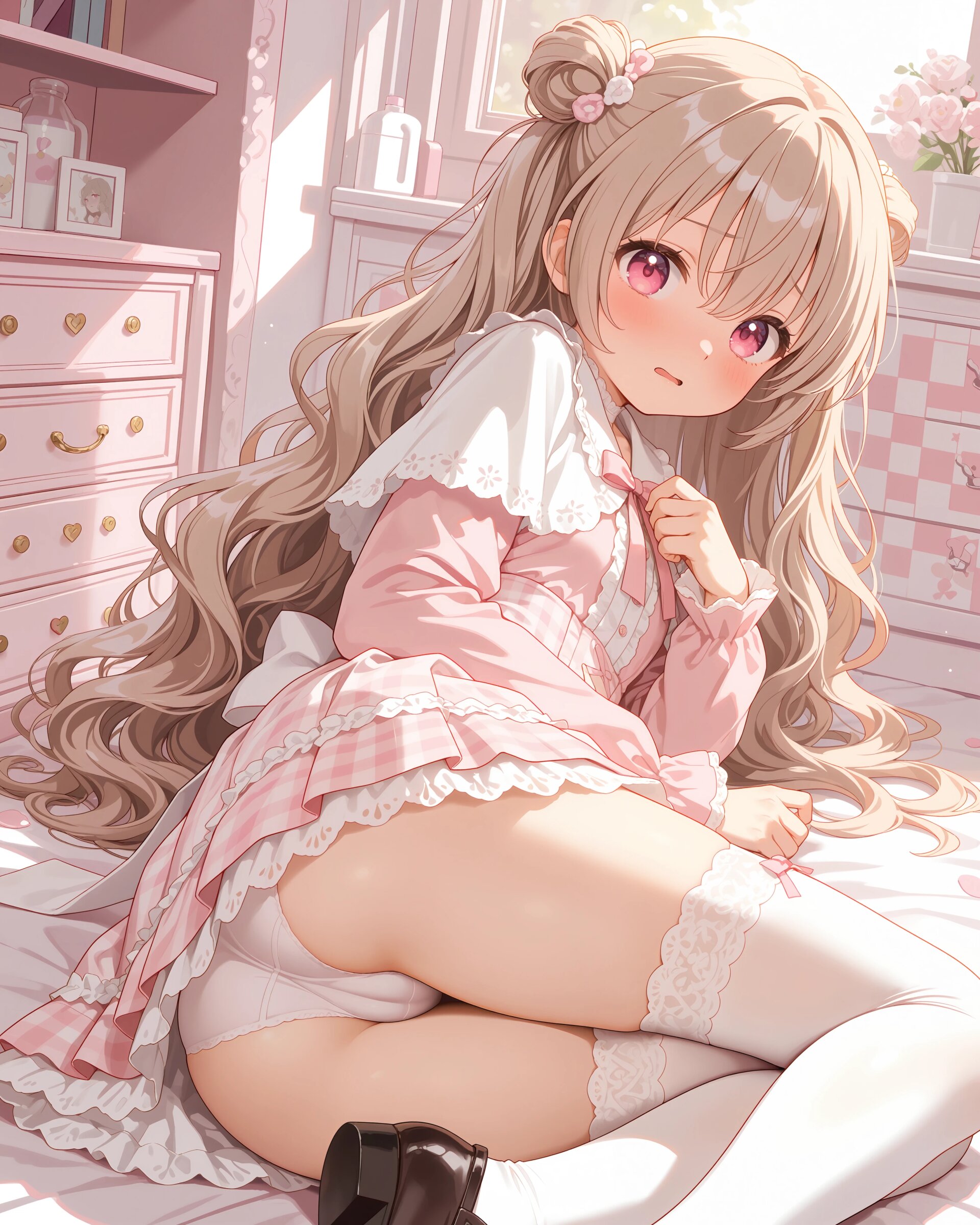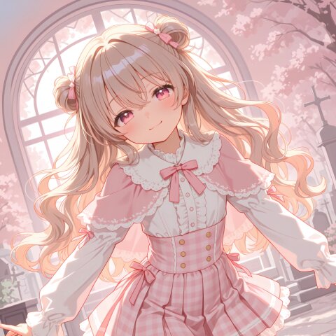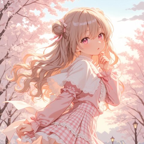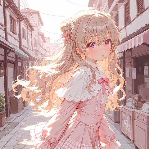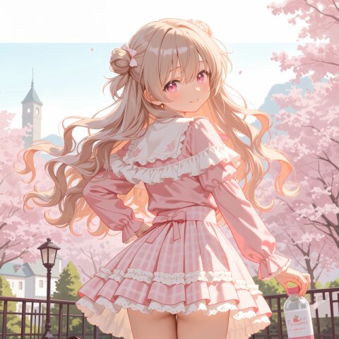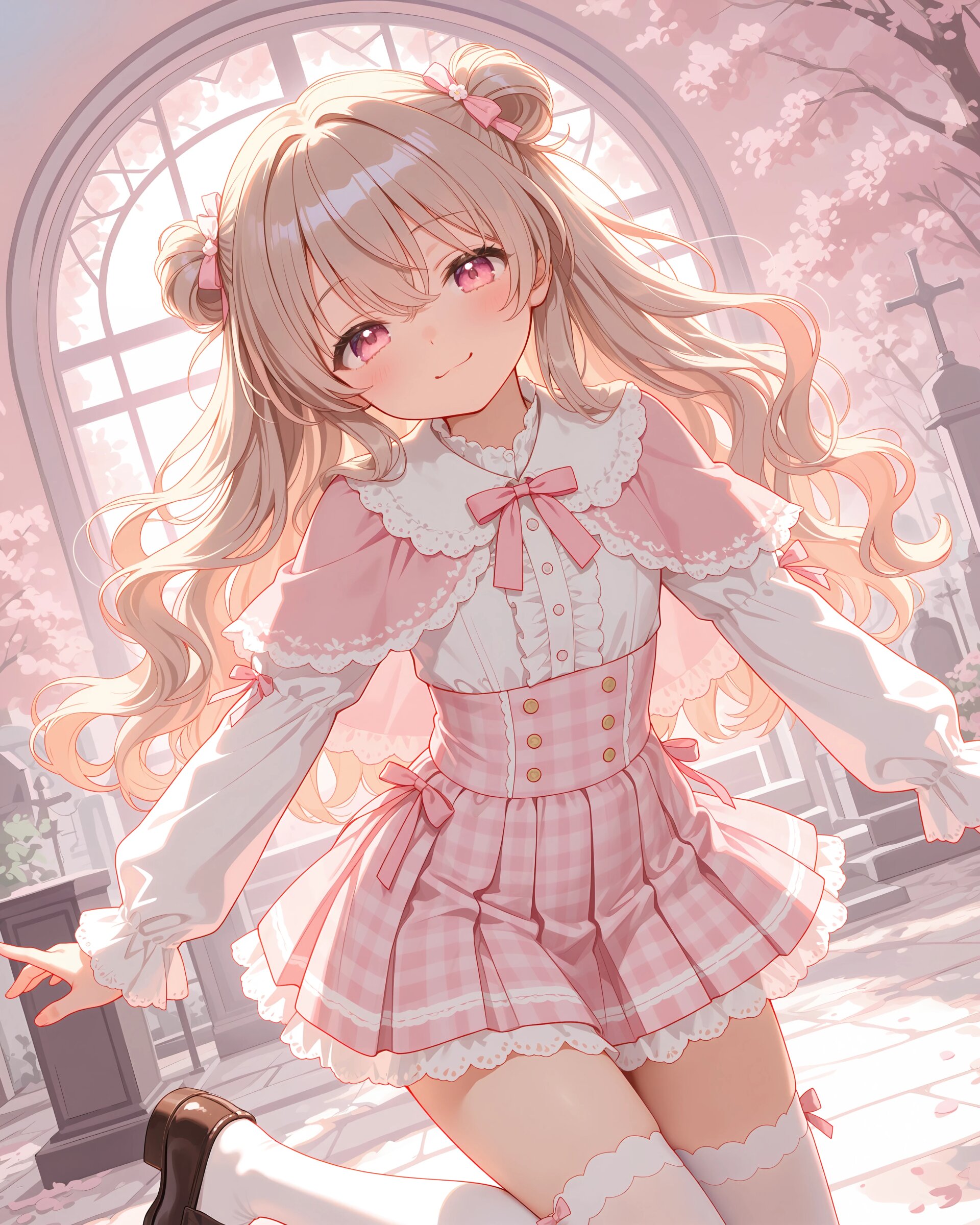 1girl, solo, colorful, from behind, cropped shoulders, town, pastel colors, soft lighting, detailed background, outdoor cafe street, spring day, wearing: frilled blouse, pastel pink frilled blouse with lace collar and puff sleeves, short capelet OR shoulder cape in matching pastel lavender, checkered mini skirt in soft pastel pink and white plaid, pleated check mini skirt, white knee socks OR pastel thighhighs, brown loafers OR penny loafers, kawaii lolita fashion, sweet lolita inspired, girly, innocent look, detailed frills, lace trim, ribbon details, (cute girl, pink eyes, cute eyes, large eyes, pink ribbon, light brown hair, medium long wavy hair, two small buns, bangs between eyes, bobby pin, flat chest), blush, :>, wariza, arms behind back, thighs, book, clean lineart, clear silhouette, masterpiece, best quality, newest, absurdres, highres, very awa,