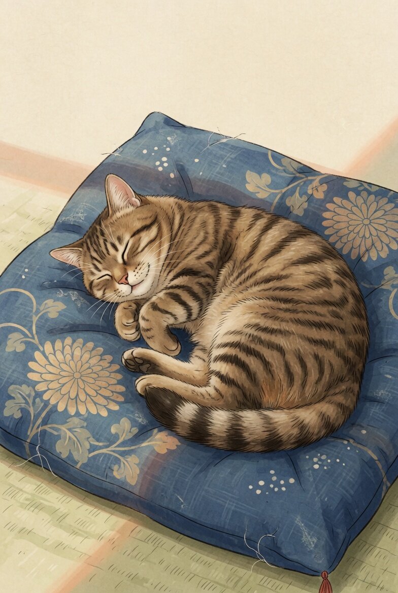 猫のイラスト。キジトラ柄。座布団の上で眠っている。毛並みの柔らかさが伝わってくる。