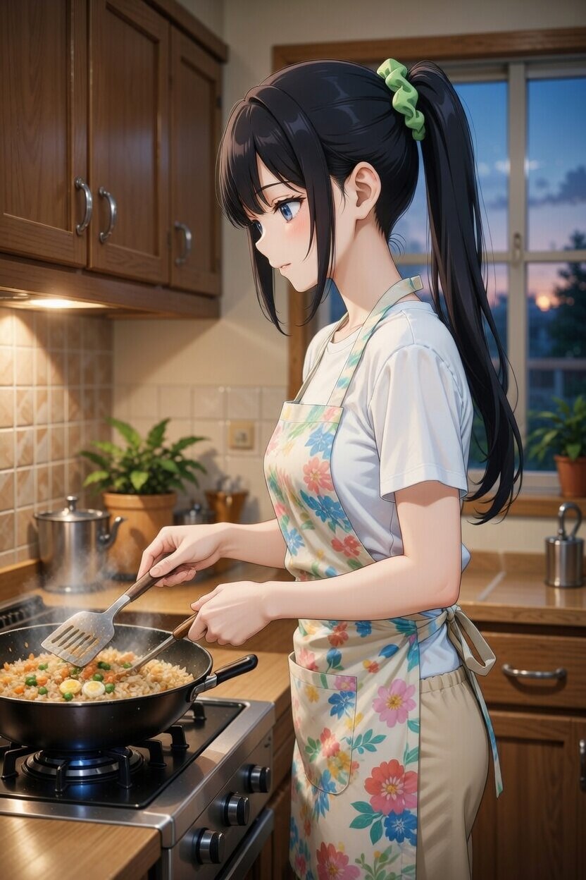 日本人女性24歳のデジタルイラスト。側面からの構図。自宅のキッチンで夕食作り。炒飯を作っている。カジュアルな服装をして、エプロンをつけている。グリーンのシュシュをつけている。