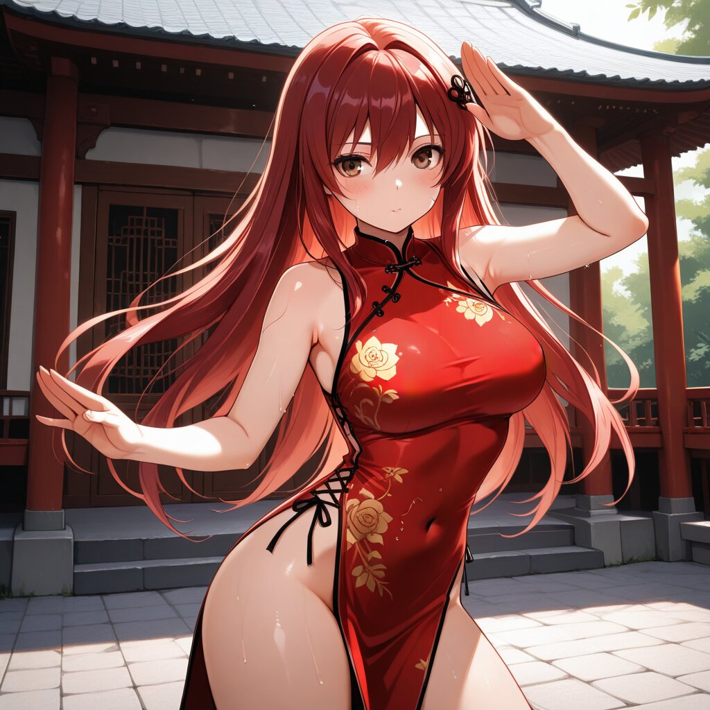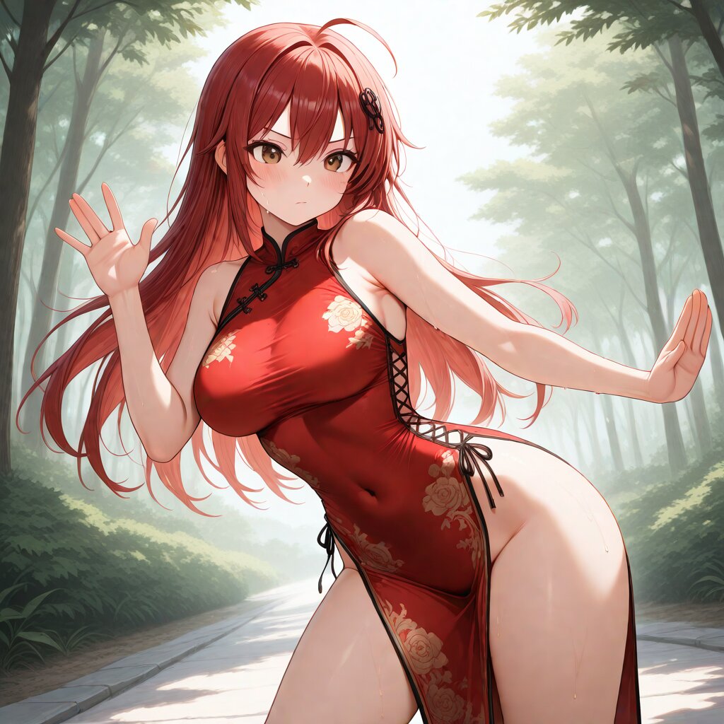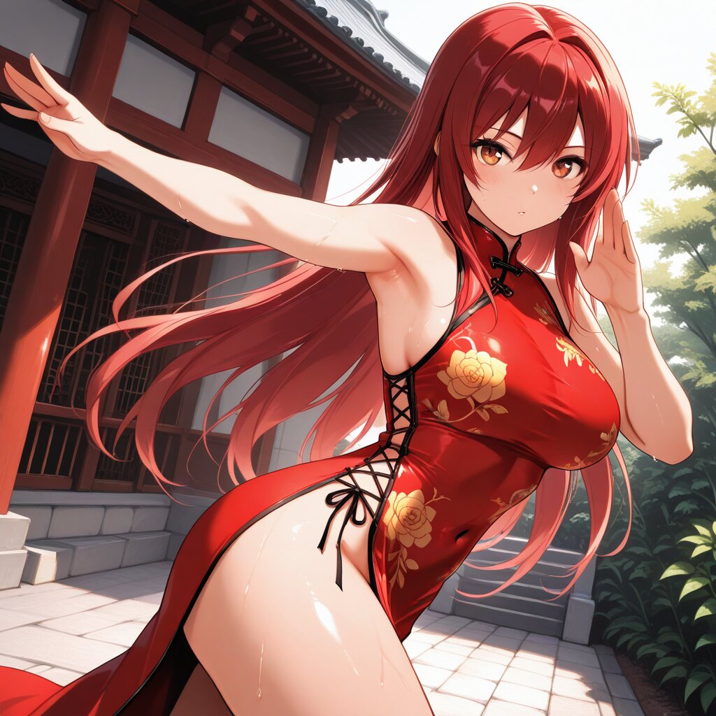 masterpiece,best quality,amazing quality, single_layout,single_view,single_angle,,1girl, long hair, breasts, blush, large breasts, red eyes, dress, hair between eyes, bare shoulders, medium breasts, brown eyes, standing, thighs, cowboy shot, red hair, sleeveless, day, armpits, bare arms, sleeveless dress, covered navel, no panties, chinese clothes, floral print, red dress, sunlight, china dress, pelvic curtain, side slit, contrapposto, waving, cross-laced clothes, taut clothes, armpit crease, print dress, side cutout, impossible dress, taut dress,rina-san, matte_eyedetail, hairdetail, detailed background, at the garden, outdoors, side slit, contrapposto, cross-laced clothes, taut clothes, armpit crease, print dress, side cutout, impossible dress, taut dress, kung fu, practicing, martial arts, fighting stance, sweat,