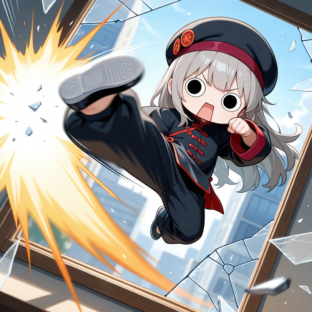 masterpiece,best quality,highres,ultra-detailed,highly detailed,general,chibi,1girl,solo,<o> <o>,round eyes,black eyes,rectangular mouth,grey hair,long hair,v-shaped eyebrows,black hat,beret hat,black chinese clothes,long chinese clothes,long chinese pants,oversized clothes,full body,aura,BREAK (speed lines, motion lines, motion blur,kicking,flying kick,incoming attack,incoming kick,jumping,floating:1.4),(broken glass,Break the window and come in,in the air,Glass shards are flying:1.2),broken window,dutch angle,