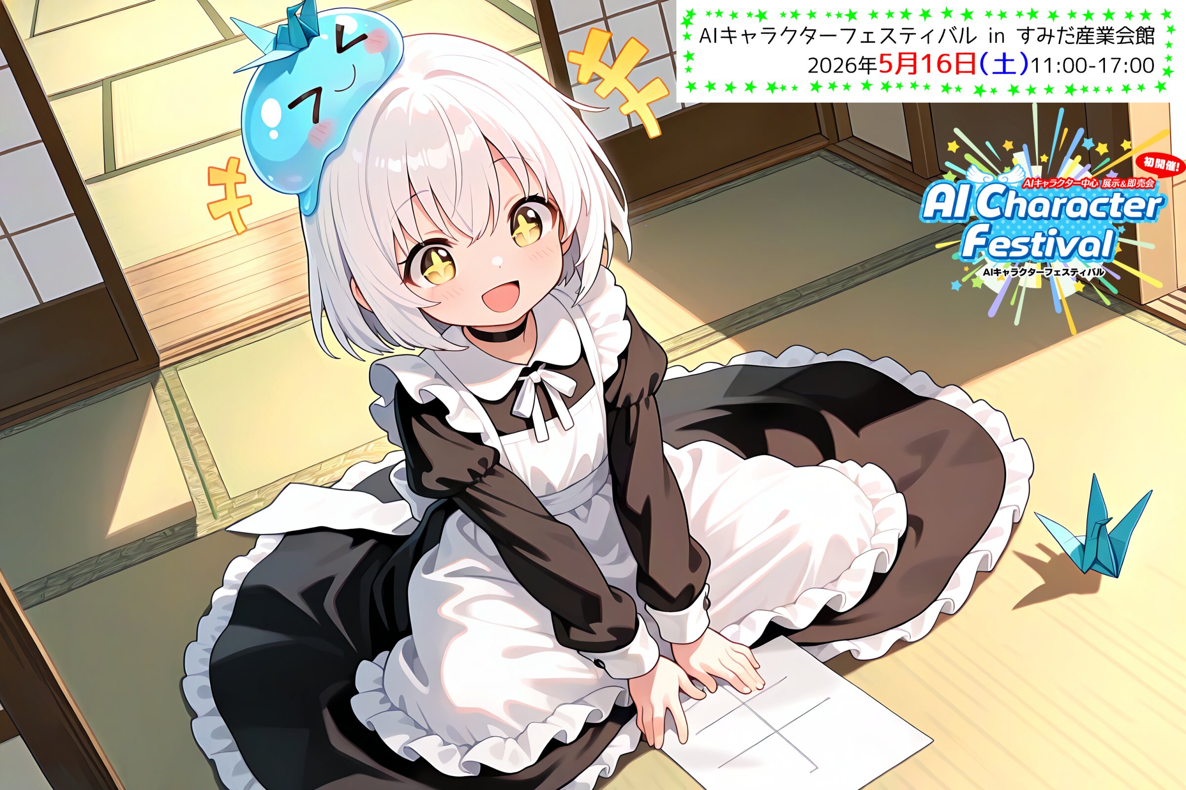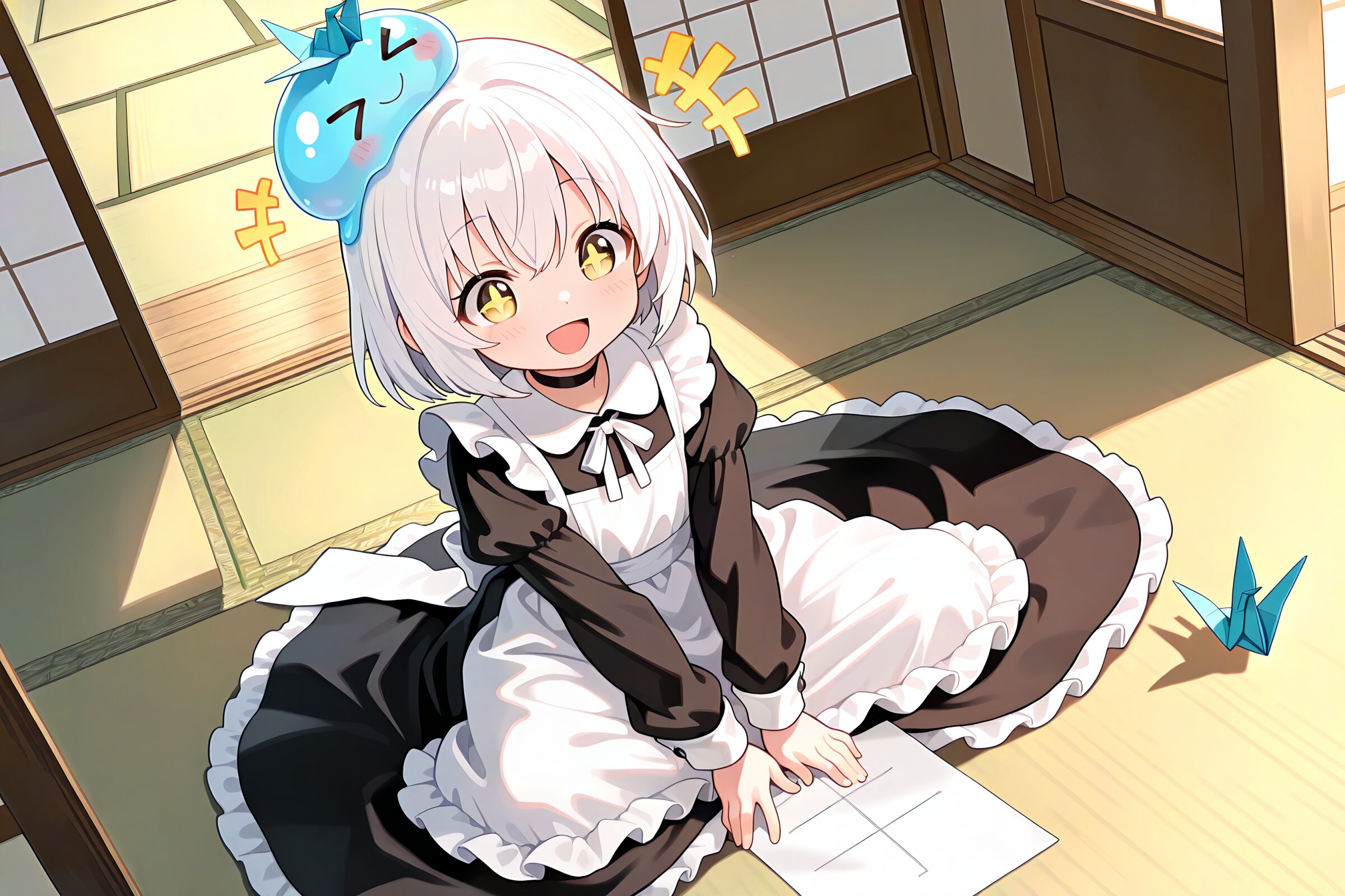 1 little girl, solo, diagonal angle, masterpiece, best quality, amazing quality, very aesthetic, white hair, short hair, yellow eyes, +_+, open mouth, smile, cheerful, +++, notice lines, choker, maid outfit, long skirt, slime on her head, > <, paper crane, making origami, sitting, tatami,