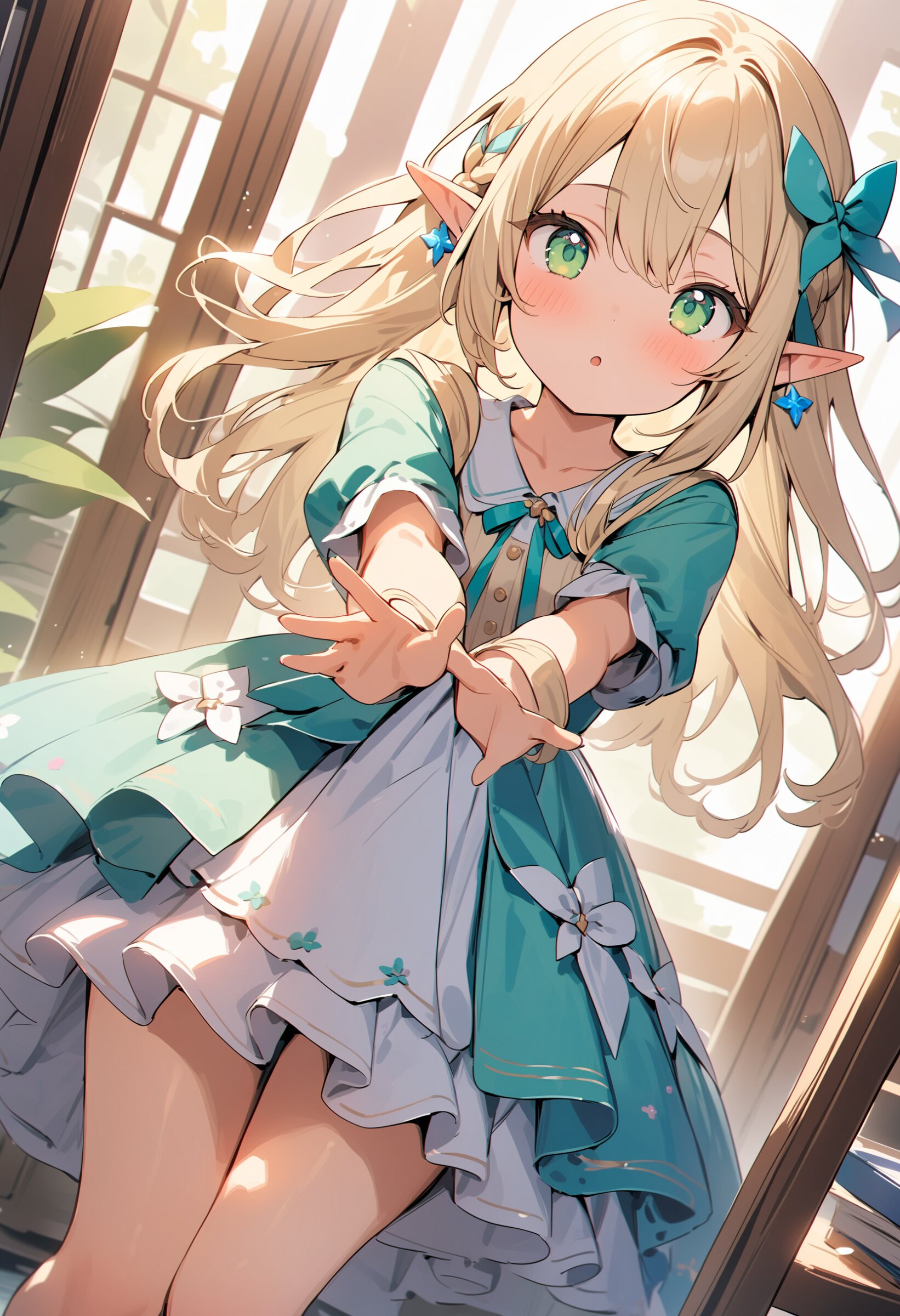 ((masterpiece)), ((best quality)), ((kawaii)), cute, (lovely), ((extremely detailed)), (beautiful), dynamic angle, a cute girl, 1girl, solo, ((elf)),beautiful blond hair, beautiful green eyes, ((beautiful eyes)), long hair, fantasy clothes,