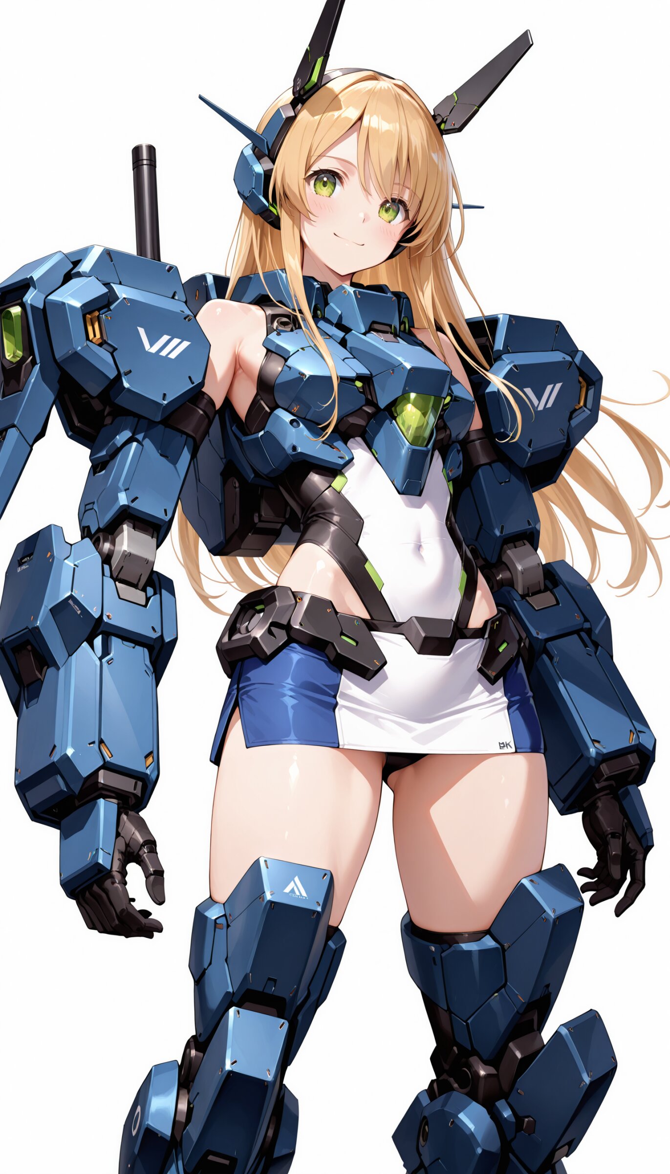 1girl, ((white background)), ultra detailed 8k cg render, masterpiece, high resolution, extremely detailed, mecha musume,mecha shoulder, mech leg, headgear, mecha armor, ((mini skirt)),long blonde hair, dropping green eyes, smile, dynamic posing,