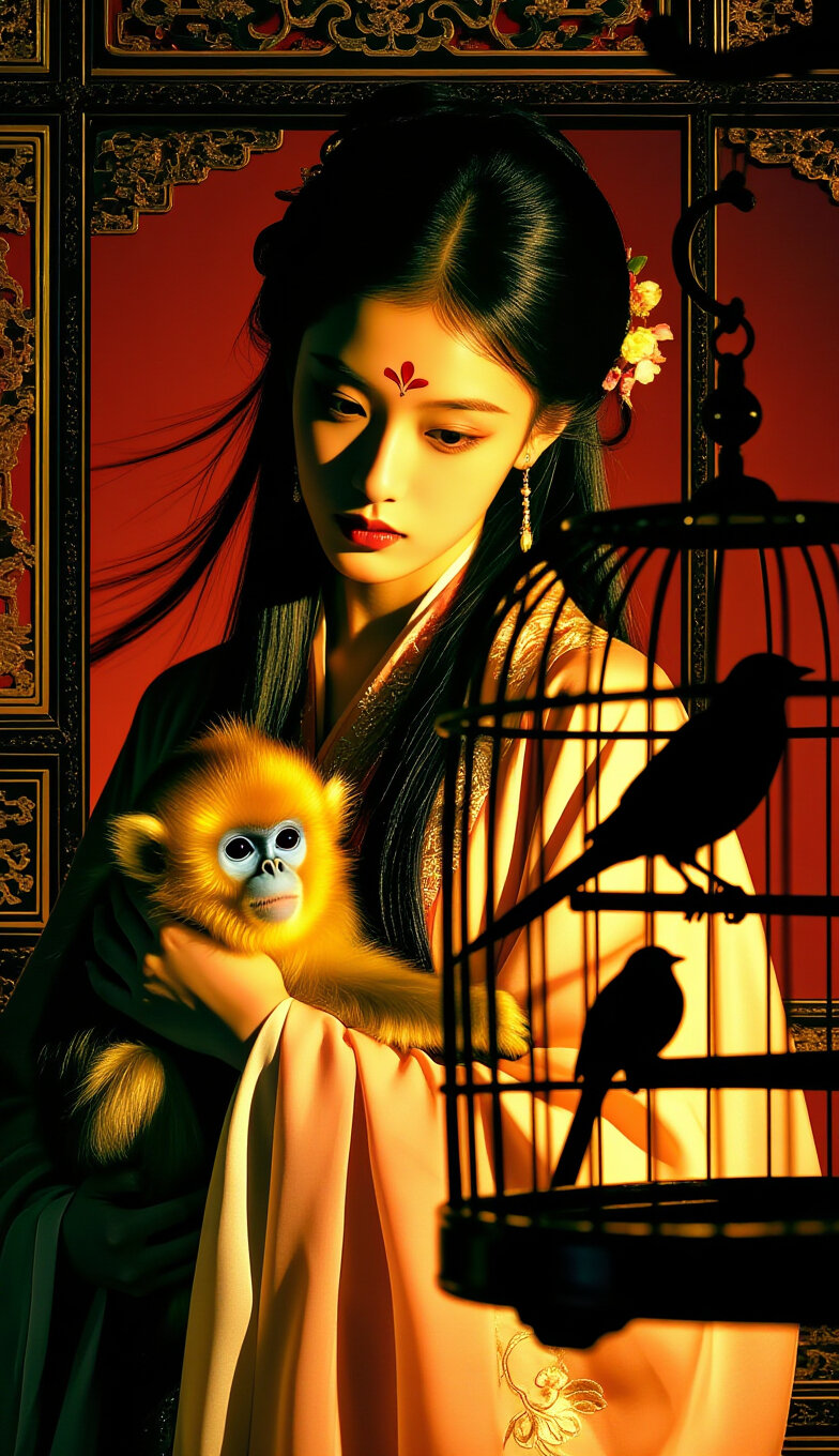 可憐な少女は瑞獣に微笑み、金糸猴は華やかな窓辺で無邪気に遊ぶ。
