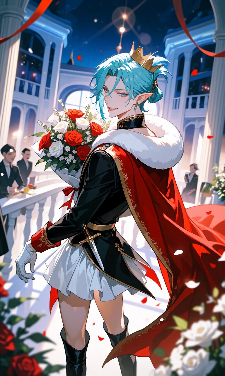 a strikingly handsome male elf with a beautiful, delicate face, pointed elven ears, and a visible Adam's apple. He has light blue hair styled with long, crossed bangs and a folded ponytail, complemented by piercing blue eyes with long lower eyelashes. His lips have a soft pink gradient at the center. He wears elegant earrings and a (luxurious crown:1.3), enhancing his regal appearance. His attire consists of a (Black luxurious Prince costume:1.5) with long sleeves, a (luxurious Red Cape:1.4) flowing behind him, and a (luxurious White mini skirt:1.5) that contrasts with his bare thighs. His footwear includes (Black luxurious Boots:1.3), and he wears (luxurious White gloves:1.2). A (dagger on waist:1.3) adds a hint of danger to his princely elegance. He stands in a (Palace:1.2) ballroom with (mid-century modern architecture:1.2), surrounded by (lots of flowers) and bathed in soft lighting. The scene is set at night, with a dreamy, romantic academia atmosphere enhanced by lens flares and bloom effects. He holds a (bouquet in hand:1.8) and wears a calm, intelligent smile, exuding happiness. (Surrounded by friends:1.8), the heartwarming birthday celebration radiates a chill yet luxurious vibe, blending fantasy and classic elegance in an insanely detailed masterpiece.