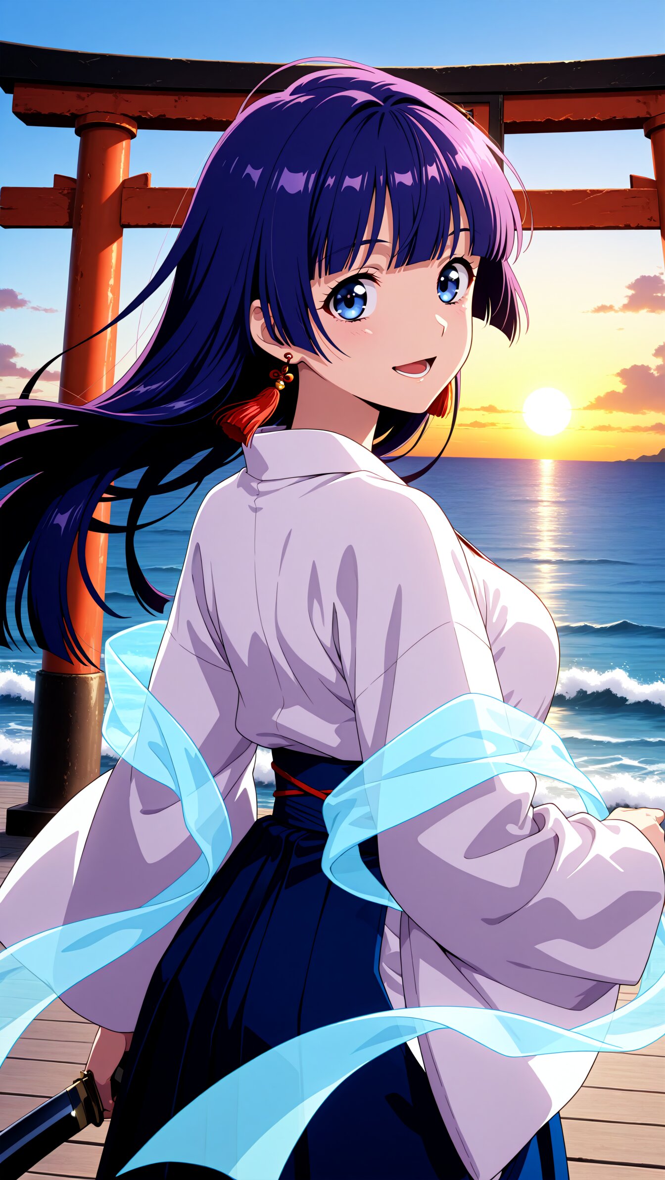 <lora:MeMax6-noob-vpred:1>,memaxl6_a,memaxl6_b,memaxl6_c,memaxl6_d,memaxl6_e, (light-blue hagoromo:1.6), Full HD,32K, 1girl, standing, multicolored clothes, layered clothes, detailed clothes, exquisite clothes, solo, (floating hair, wind:1.2, showing forehead), (from behind, looking back, ), upper body, (smile, happy, ), looking at viewer, open mouth, (teenage :1.3), (large breast), (skinny), (tareme):1.2, beautiful hair, shiny hair, straight hair, (dark-navy blue hair):1.2, crossed bangs, (hime cut, long hair:1.1), ahoge, dark-blue eyes, (Celestial Maiden:1.8), (japanese clothes, red-white miko:1.1, long sleeves, tassel earrings, no headwear, blue long hakama skirt:1.6), (outdoors, morning, sunrise, torii, ocean, waves, lighting back, high contrase:1.6), water drop:1.2, masterpiece, best quality, super fine illustration, very aesthetic, newest, hyper detailed, intricate, beautiful, aesthetic, highly decorative, HDR, yume kawaii, ,anime screencap,anime,no gradients, 2D flat design, bold outlines, 10's anime style,