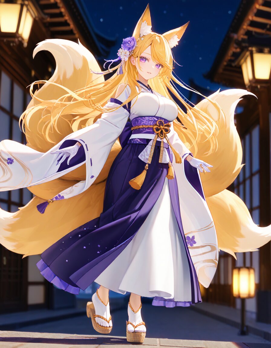 masterpiece, best quality, amazing quality, very aesthetic, high resolution, ultra-detailed, absurdres, newest, scenery BREAK 1girl, fox girl, gold Blond Hair, large breasts and fox ears, (swept bangs:1.2), (perfect purple eyes:1.3), long eyelashes aristocratic features tall girl has, (Blond Hair long hair over ears:1.3), fox 9tails, (wearing White Japanese Cloth straw sandal silk gloves purple long skirt Obi boots:1.3), hair ornament flower, tabi BREAK depth of field, volumetric lighting