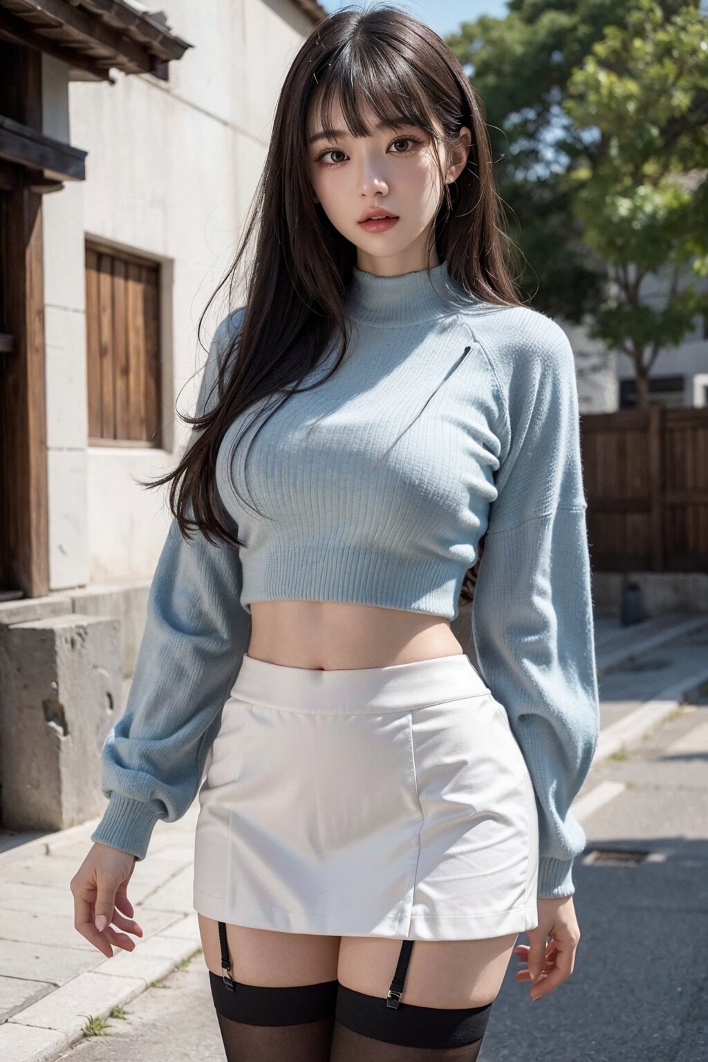 masterpiece, hyper detailed, 8K, hyper detailed illustration,extremely detailed CG, Japanese woman, 23yo,bishojo,idol face, (cute:1.1), (pretty:1.1), hyper detailed face, hyper detailed eye, beautiful eye, eyeshadow, natural makeup, extremely detailed, medium hair,(bangs:1.1), thin, tall, perfect anatomy, perfect proportions, extremely detailed body, blouse, crop top,short skirt, thighhighs, hyper detailed background,