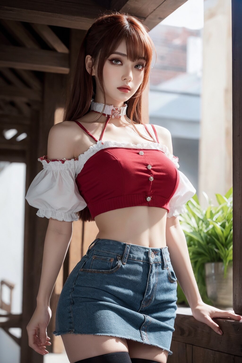 masterpiece, hyper detailed, 8K, hyper detailed illustration,extremely detailed CG, Japanese woman, 23yo, (cute:1.1), (pretty:1.1), hyper detailed face, hyper detailed eye, beautiful eye,red eyeshadow, natural makeup, extremely detailed, medium hair,(bangs:1.1), thin, tall, perfect anatomy, perfect proportions, extremely detailed body, blouse, crop top,short skirt, thighhighs, hyper detailed background,