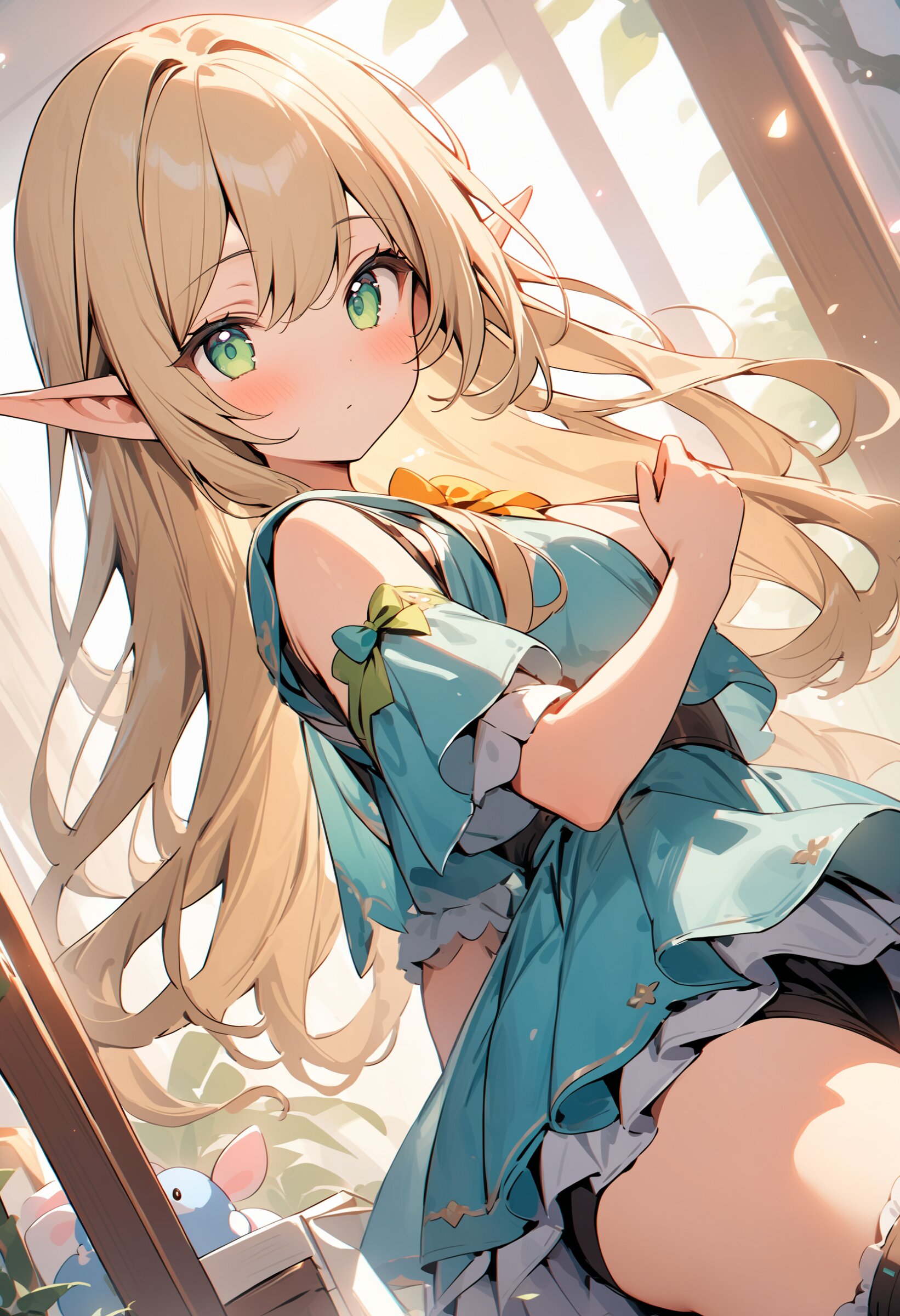 ((masterpiece)), ((best quality)), ((kawaii)), cute, (lovely), ((extremely detailed)), (beautiful), dynamic angle, a cute girl, 1girl, solo, ((elf)),beautiful blond hair, beautiful green eyes, ((beautiful eyes)), long hair, fantasy clothes,