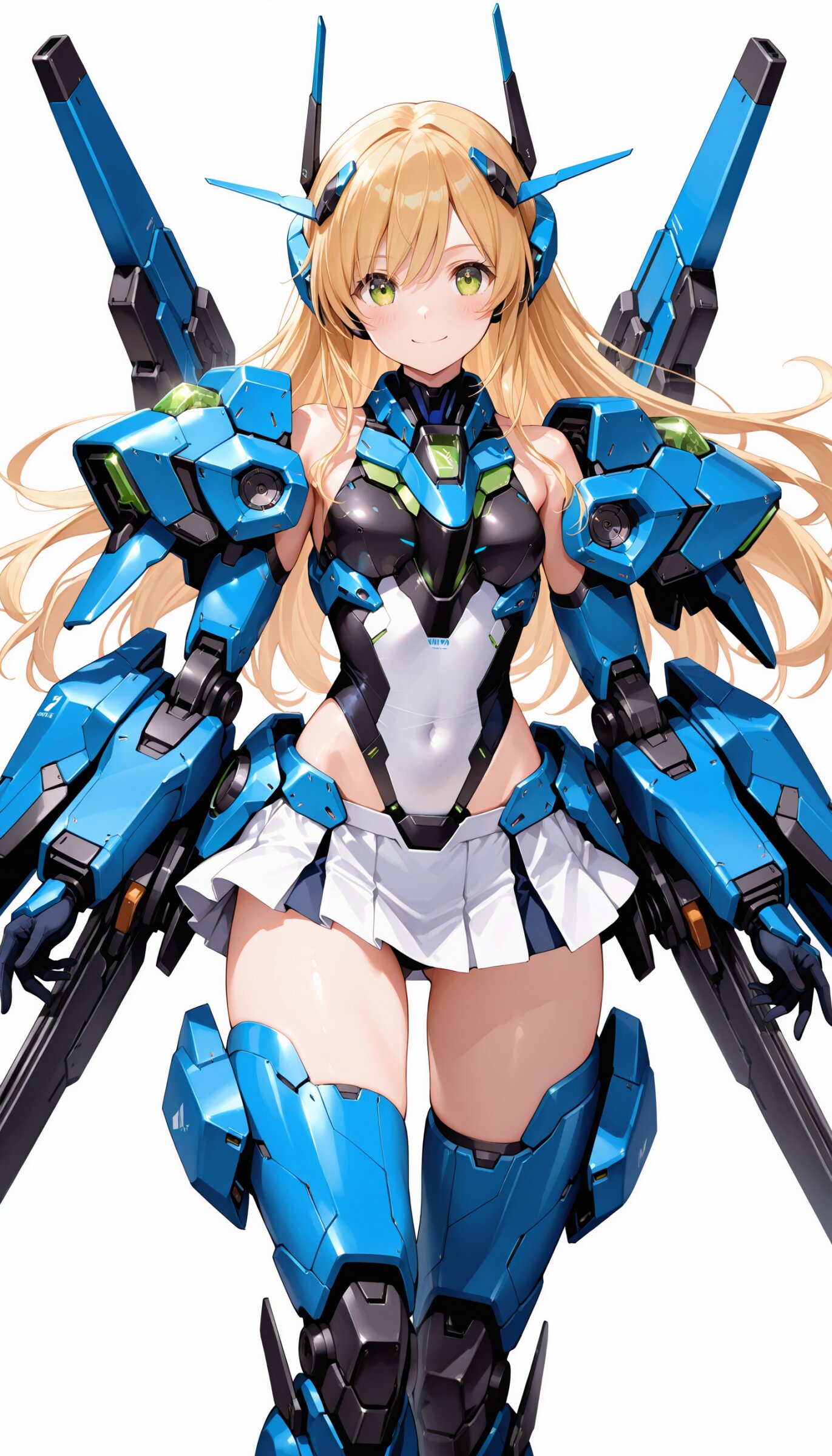 1girl, ((white background)), ultra detailed 8k cg render, masterpiece, high resolution, extremely detailed, mecha musume,mecha shoulder, mech leg, headgear, mecha armor, ((mini skirt)),long blonde hair, dropping green eyes, smile, dynamic posing,