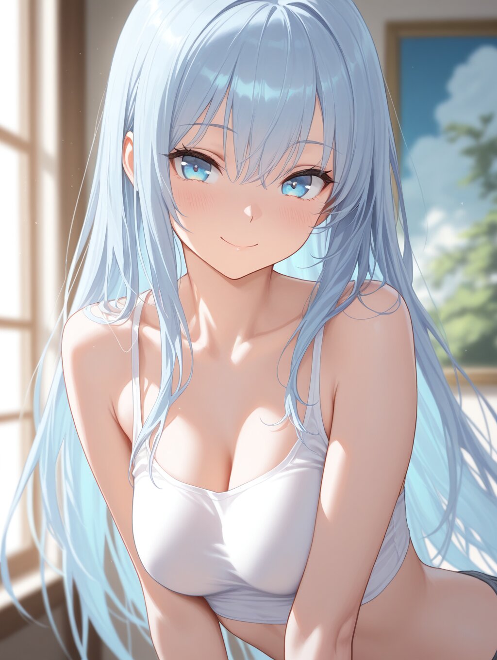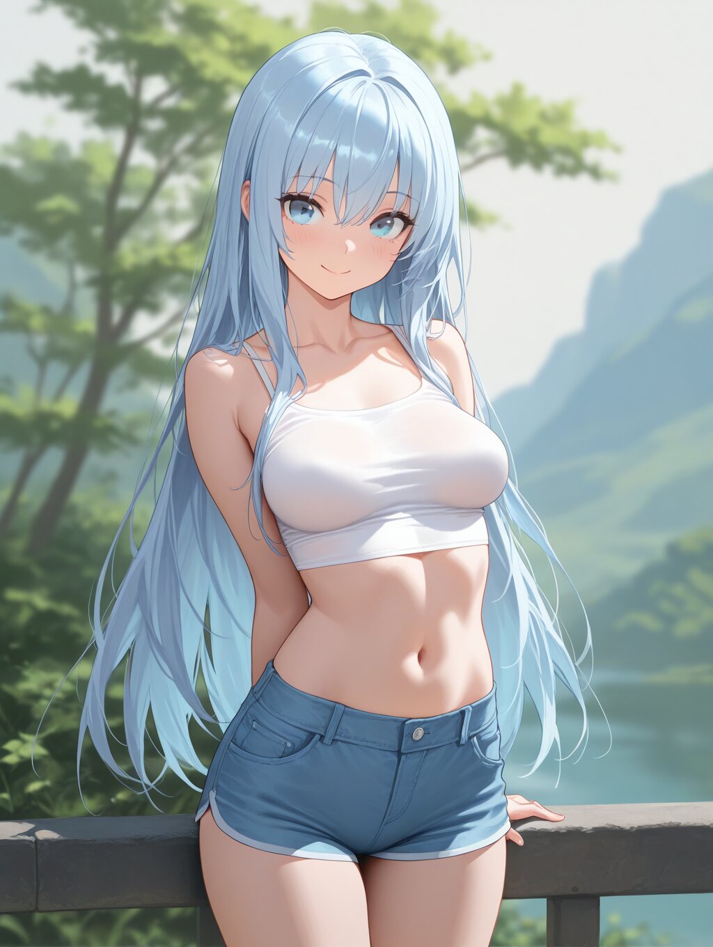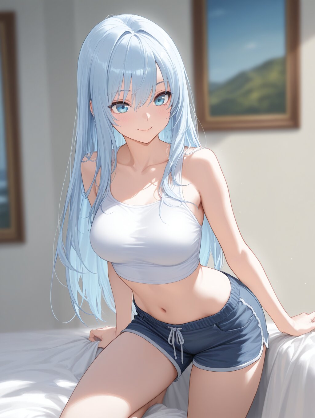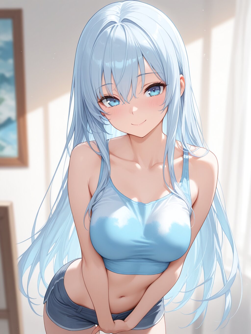 masterpiece,best quality,amazing quality,ultra detailed,(thick painting:1.2),detailed skin texture,(detailed eyes:1.2),(eye highlights:1.2), (1girl:1.2),depth of field,medium breasts,light blue long hair,bishoujo,blue eyes,smile,pose,bare shoulders,collarbone,crop top