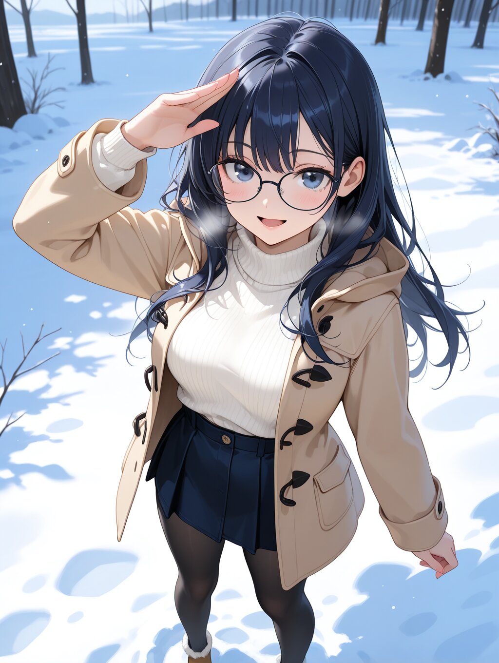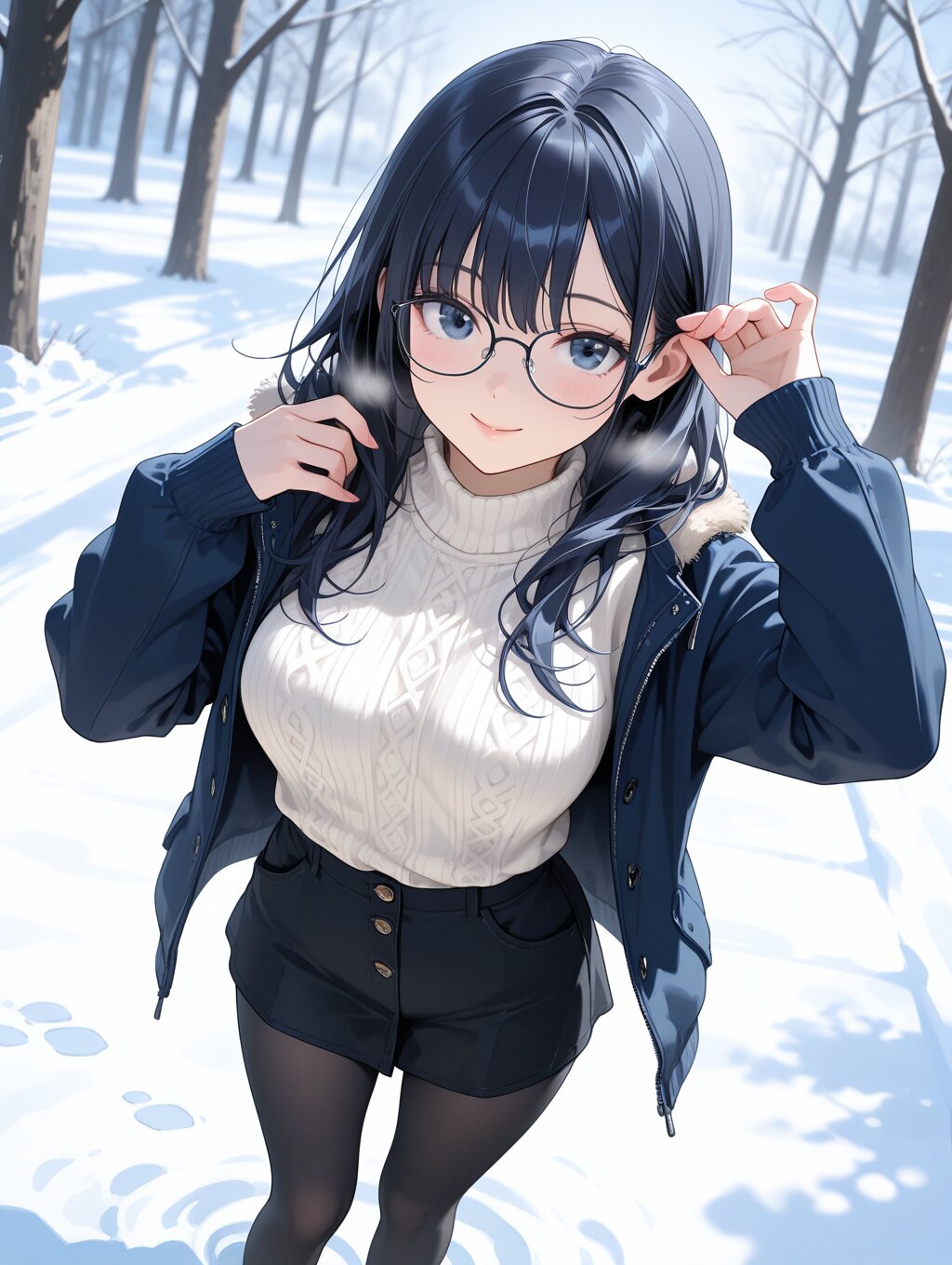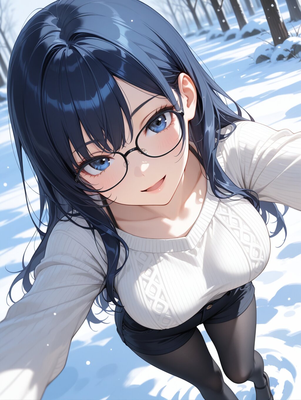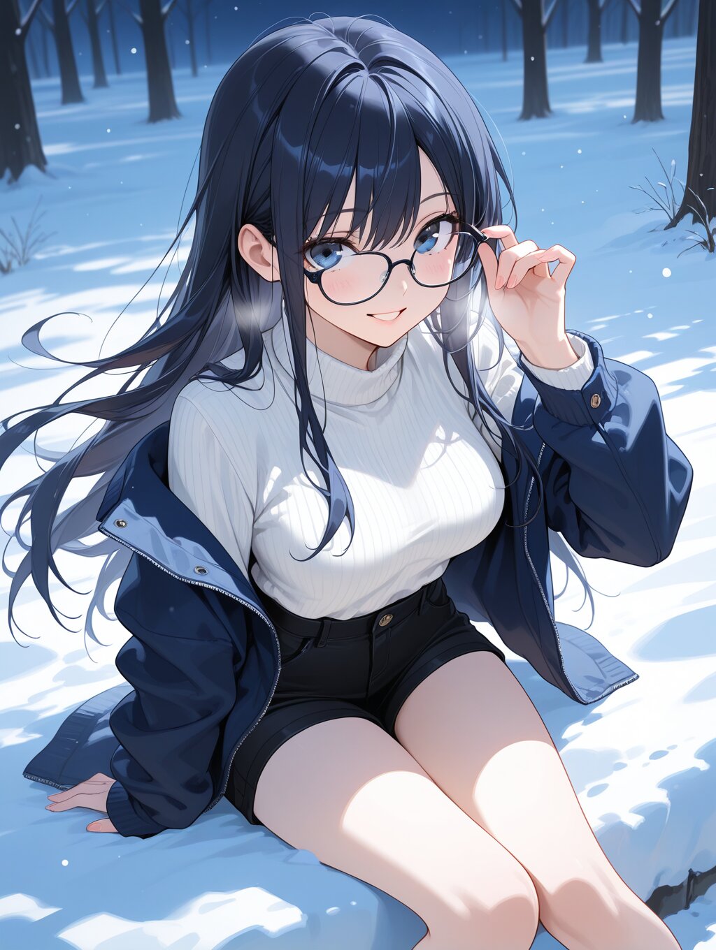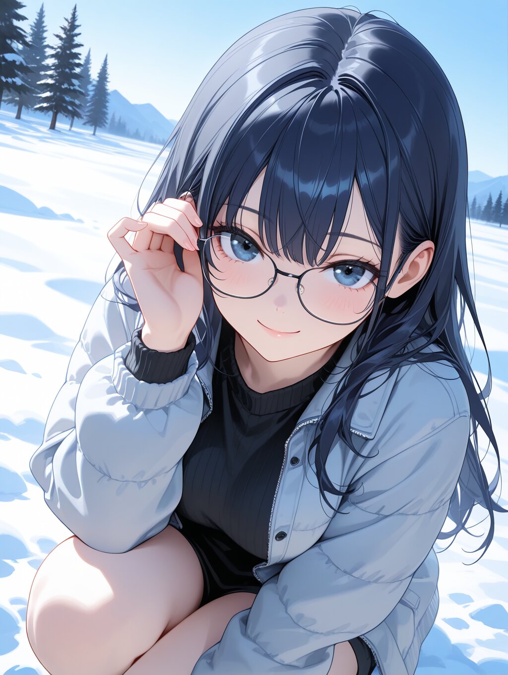 masterpiece,ultra detailed,detailed shading,detailed texture,(catchlight:1.3),highly detailed eyes,watery eyes,<lora:cveb6c5e878c739bt83g:0.4>, full head, smile,full_shot,knees,(dynamic_angle:0.6),kind_smile,open_mouth,pose,(close-up:0.6),seductive_smile, 1girl,black long hair,dark blue eyes,glasses,big breasts,medium breasts,casual,in winter,