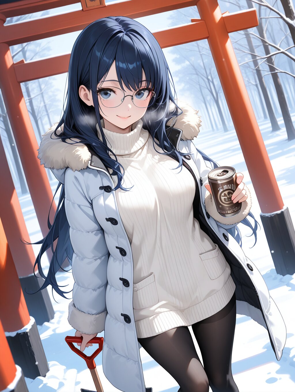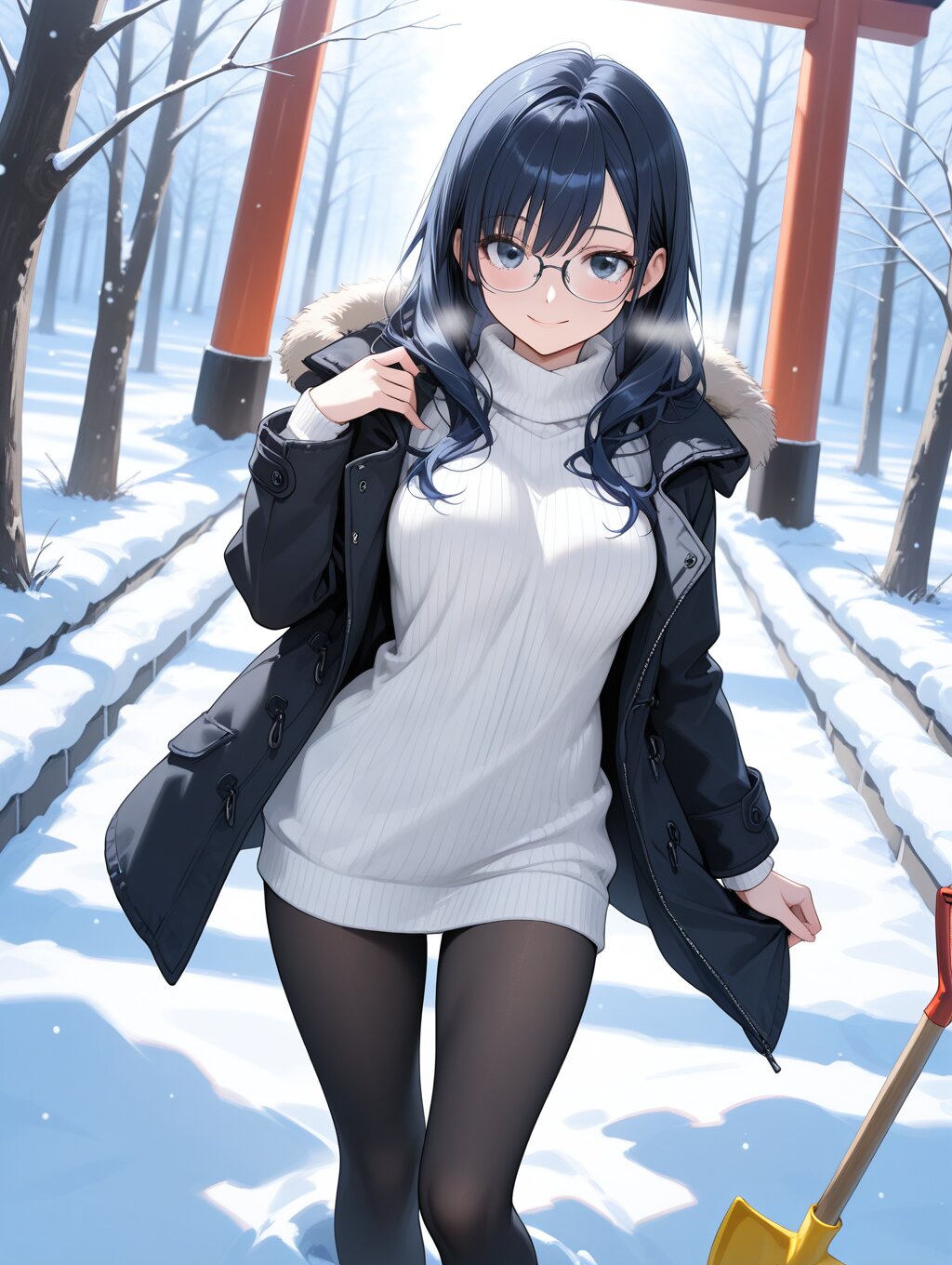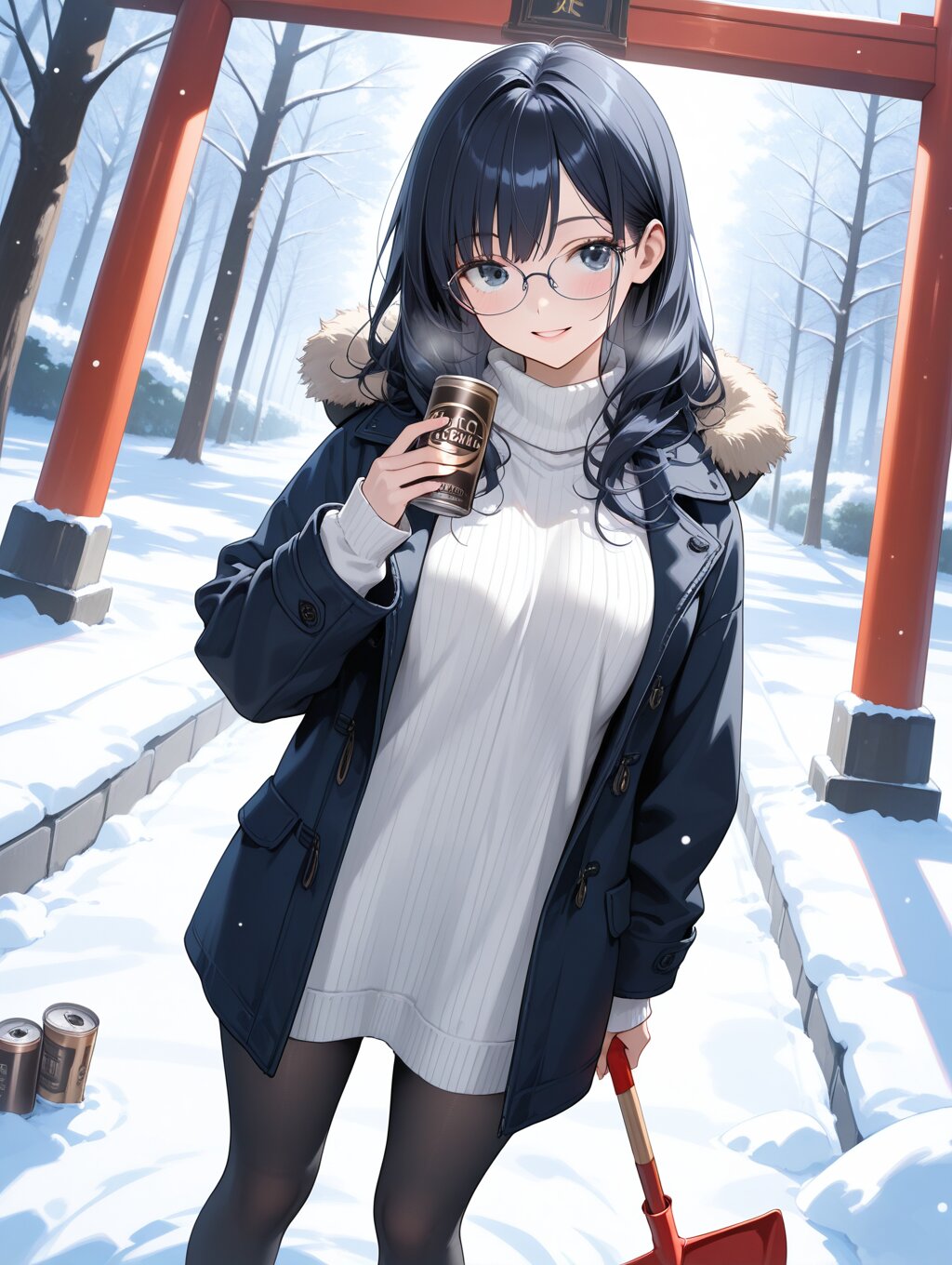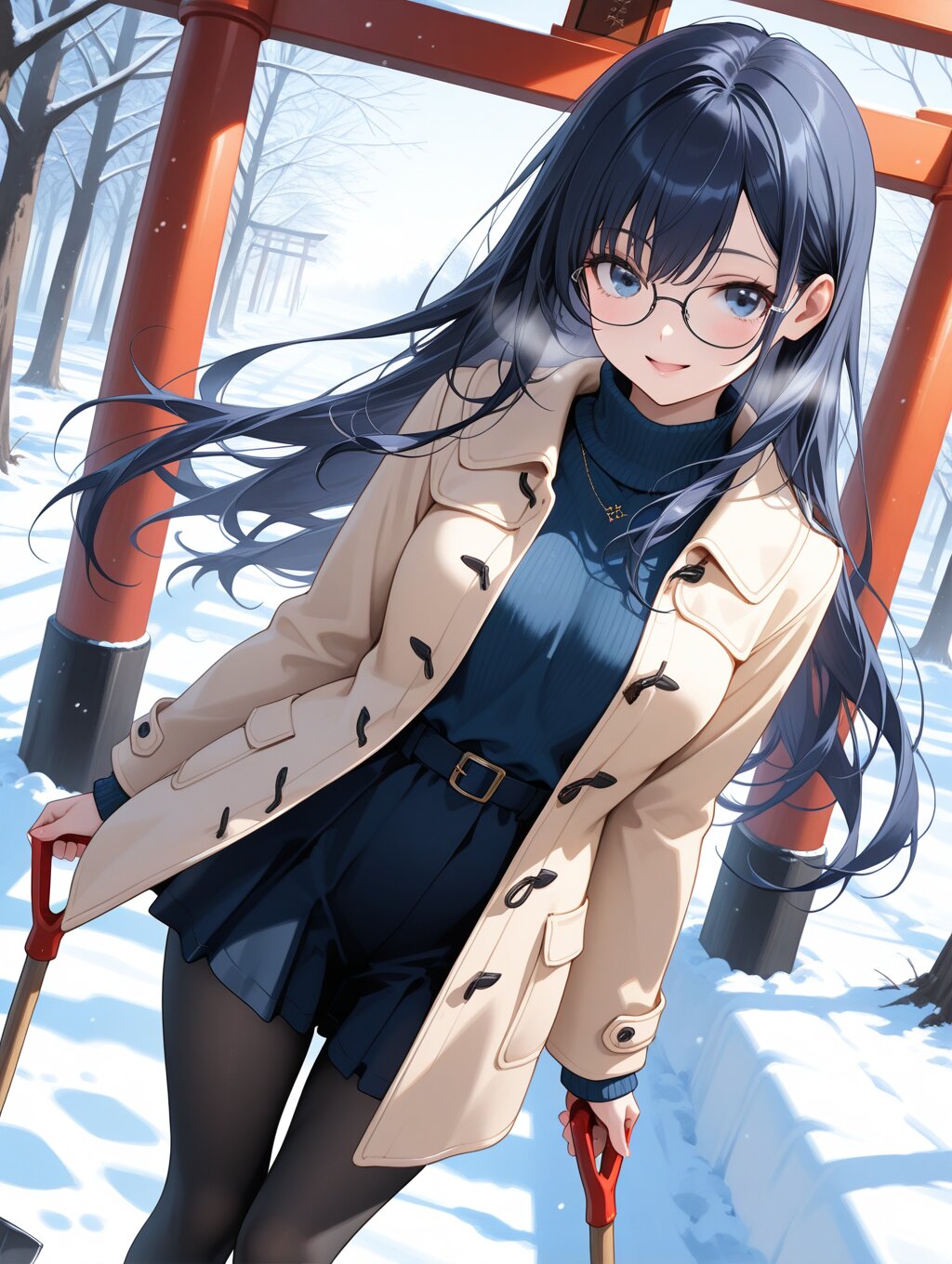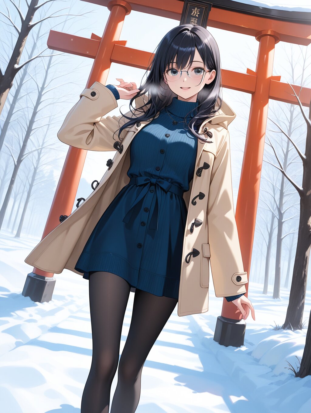 masterpiece,ultra detailed,detailed shading,detailed texture,(catchlight:1.3),highly detailed eyes,watery eyes,<lora:cveb6c5e878c739bt83g:0.4>, full head, smile,full_shot,knees,(dynamic_angle:0.6),kind_smile,open_mouth,pose,(close-up:0.6),seductive_smile, 1girl,black long hair,dark blue eyes,glasses,big breasts,medium breasts,casual,in winter,