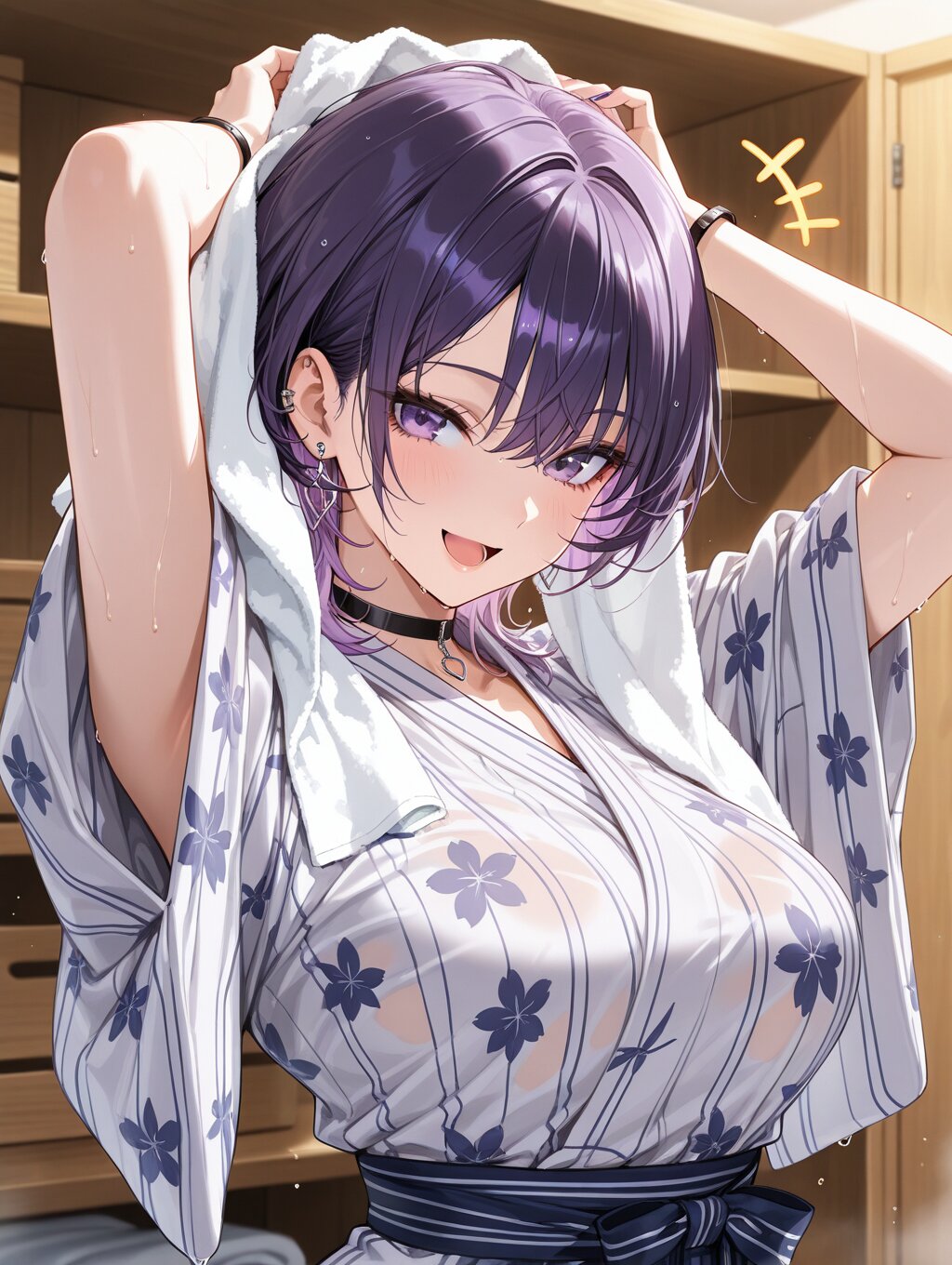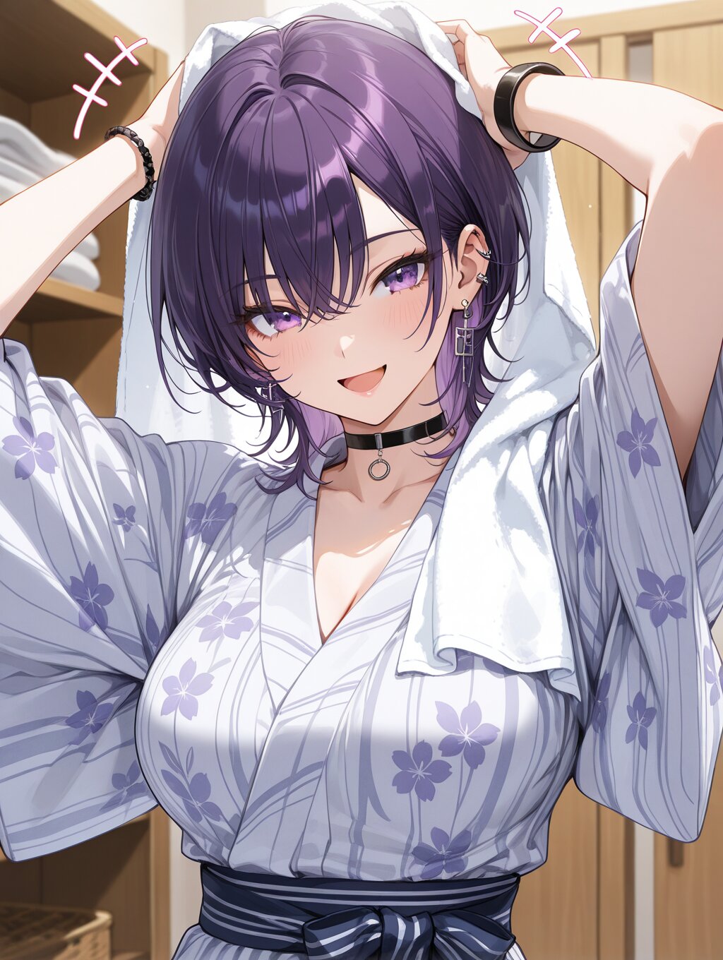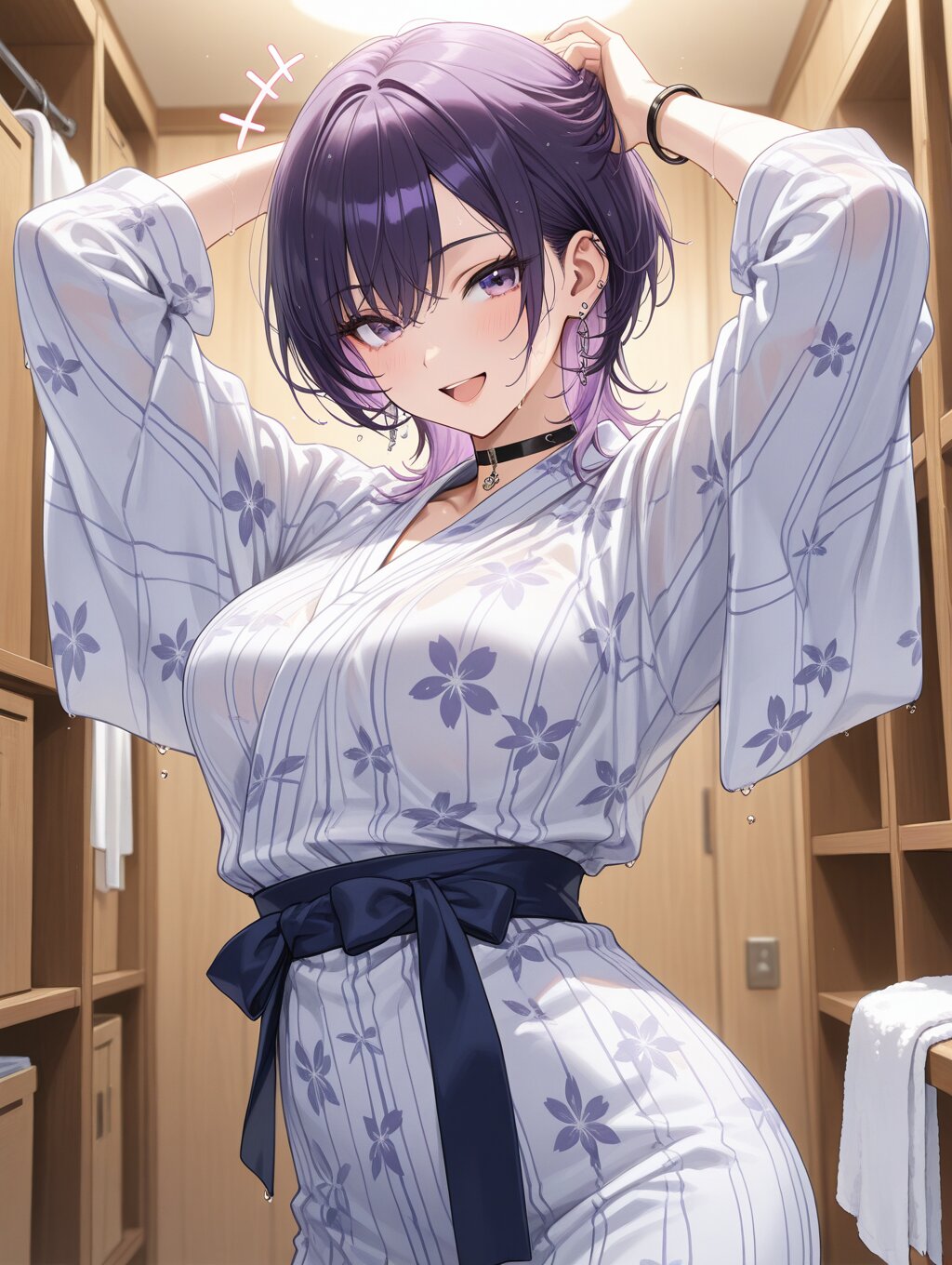 masterpiece,ultra detailed,detailed shading,detailed texture,(catchlight:1.3),highly detailed eyes,watery eyes,<lora:cveb6c5e878c739bt83g:0.4>, full head, :d,1girl,medium breasts,big breasts,purple hair,wolf cut,purple eyes,gyaru,black choker,earrings, black bracelet, wood changing room,curl own hair with a towel,arms above head,upper_body,ryokan yukata,+++,seductive_smile,closed clothes,