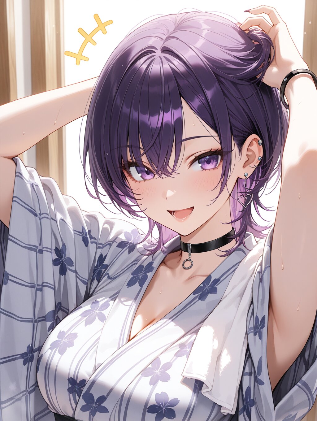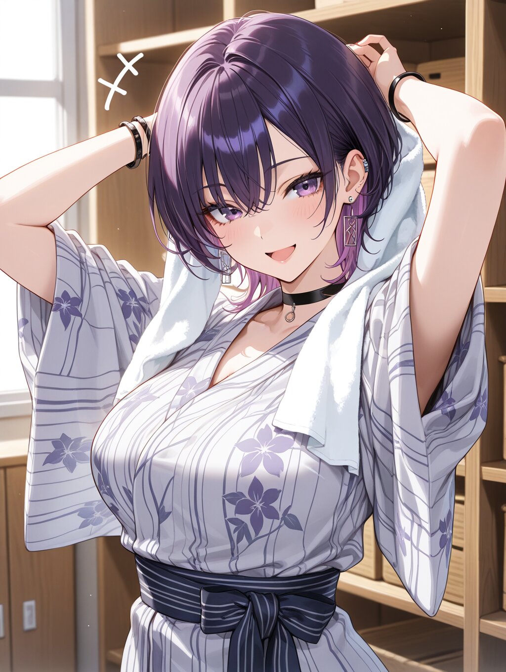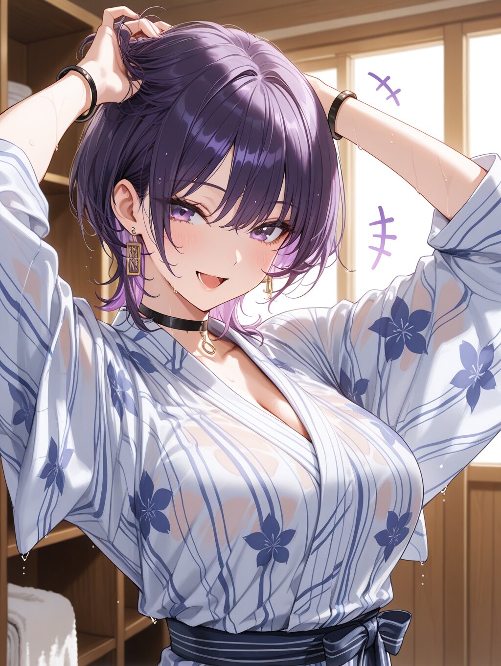 masterpiece,ultra detailed,detailed shading,detailed texture,(catchlight:1.3),highly detailed eyes,watery eyes,<lora:cveb6c5e878c739bt83g:0.4>, full head, :d,1girl,medium breasts,big breasts,purple hair,wolf cut,purple eyes,gyaru,black choker,earrings, black bracelet, wood changing room,curl own hair with a towel,arms above head,upper_body,ryokan yukata,+++,seductive_smile,closed clothes,