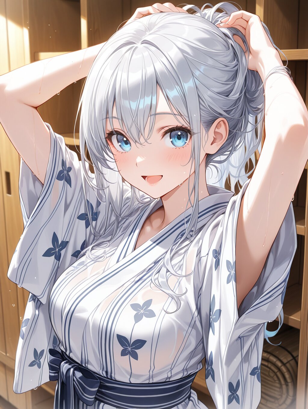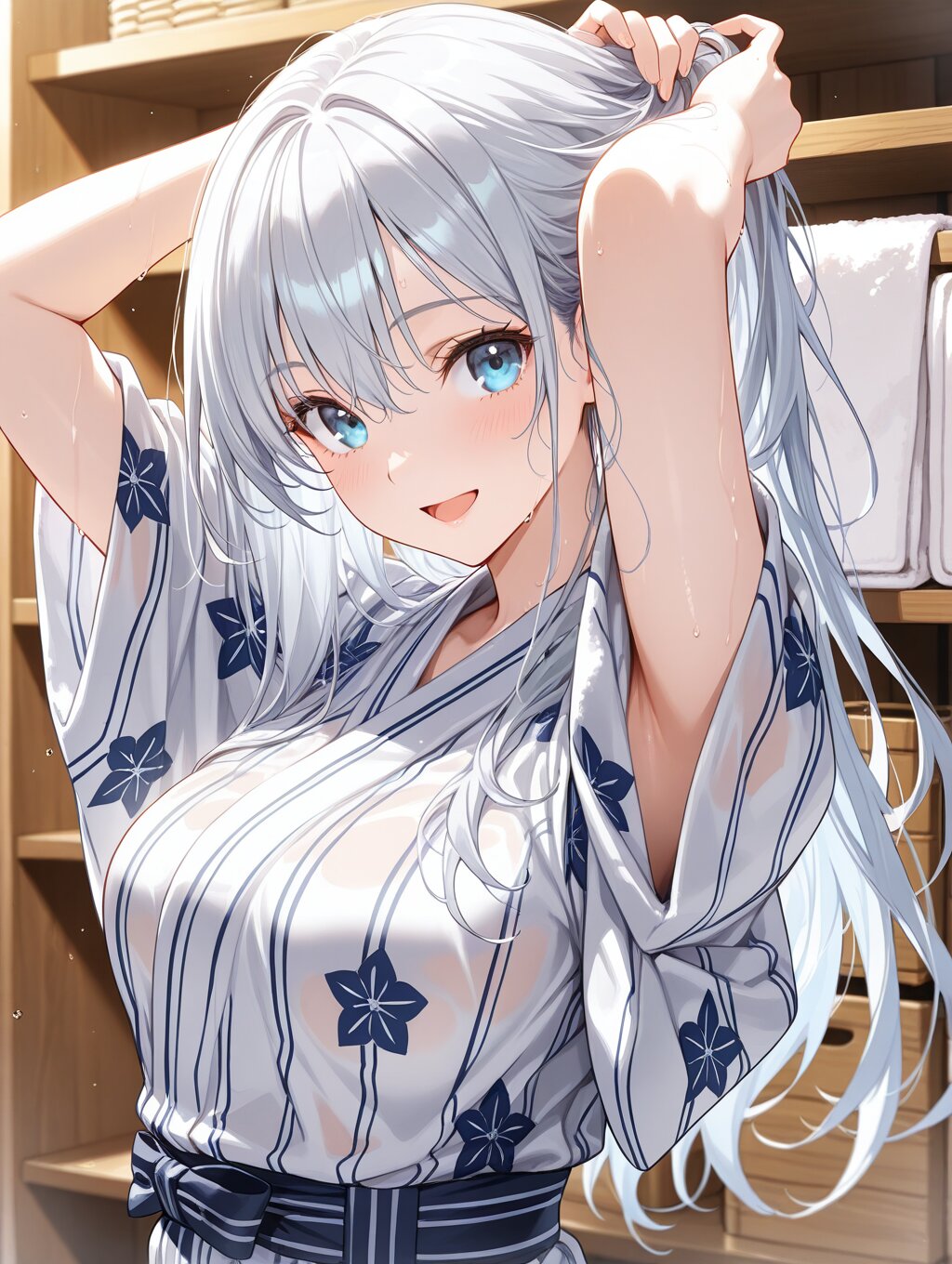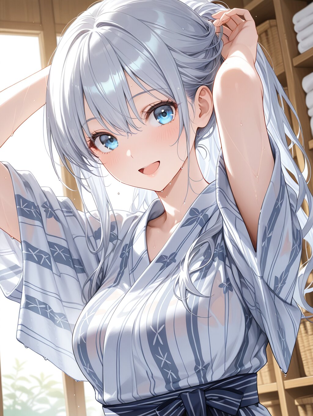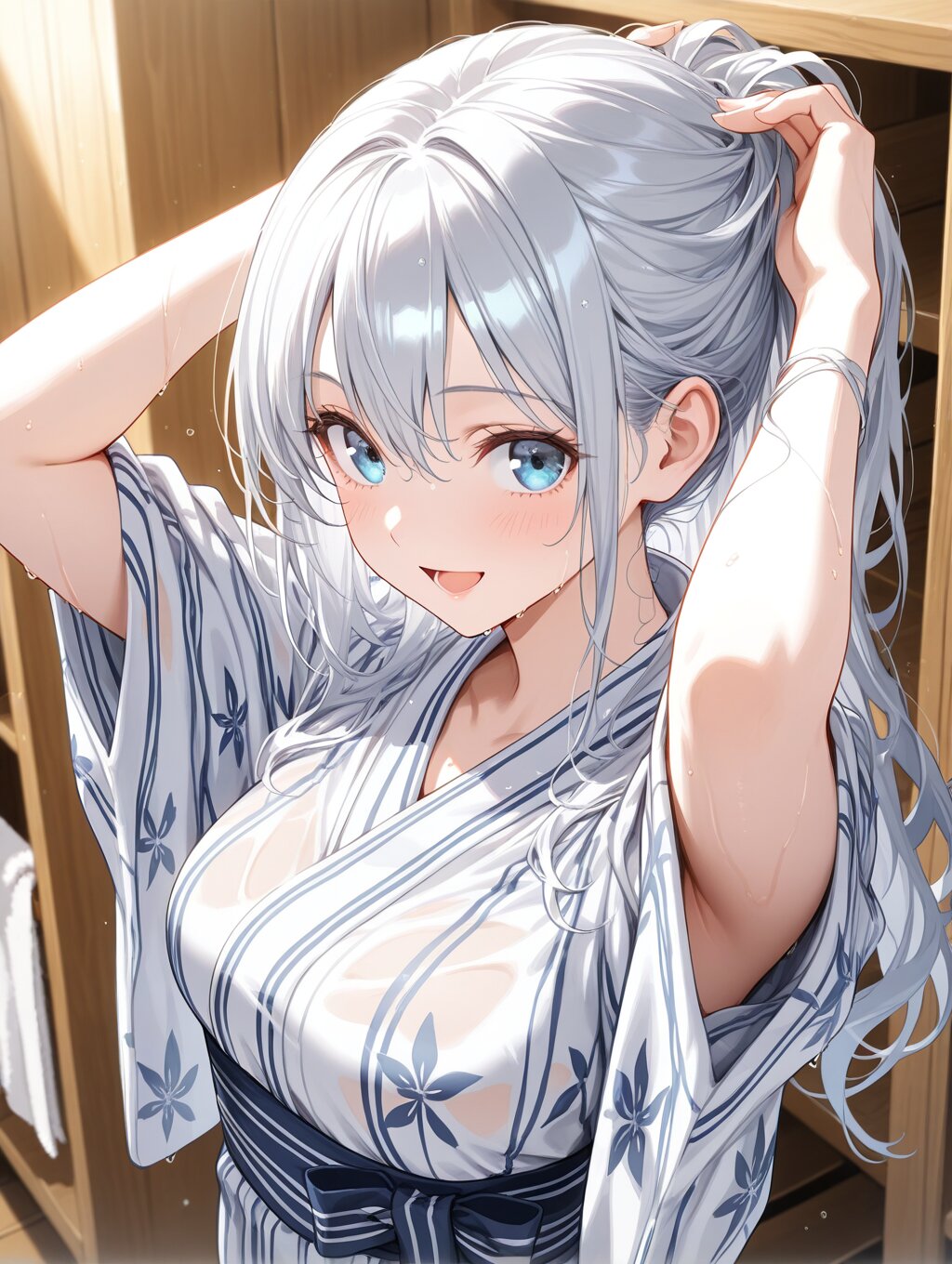 masterpiece,ultra detailed,detailed shading,detailed texture,(catchlight:1.3),highly detailed eyes,watery eyes,<lora:cveb6c5e878c739bt83g:0.4>, full head, :d,1girl,blue eyes,blue silver long hair,medium breasts,open mouth, wood changing room,curl own hair with a towel,arms above head,upper_body,closed ryokan yukata,(close-up:0.6),(dynamic_angle:0.6),adult,wet,