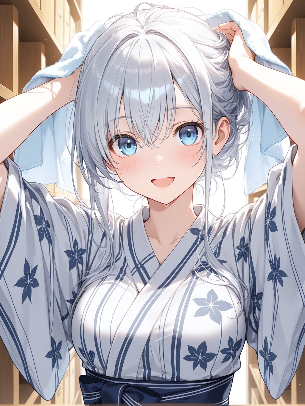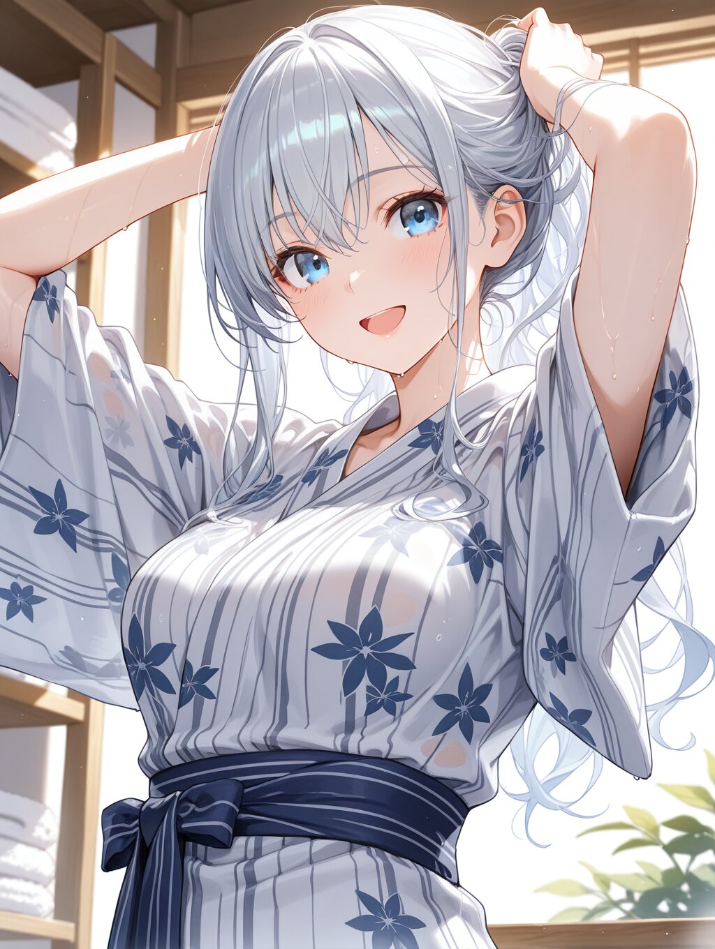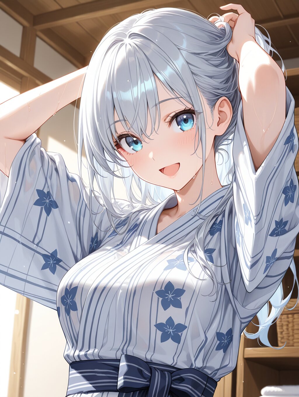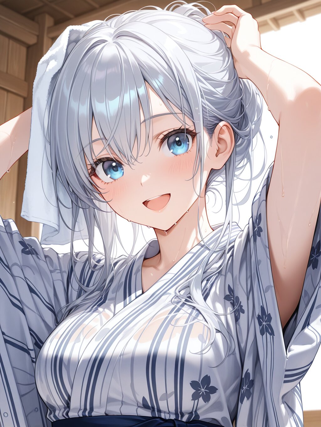 masterpiece,ultra detailed,detailed shading,detailed texture,(catchlight:1.3),highly detailed eyes,watery eyes,<lora:cveb6c5e878c739bt83g:0.4>, full head, :d,1girl,blue eyes,blue silver long hair,medium breasts,open mouth, wood changing room,curl own hair with a towel,arms above head,upper_body,closed ryokan yukata,(close-up:0.6),(dynamic_angle:0.6),adult,wet,