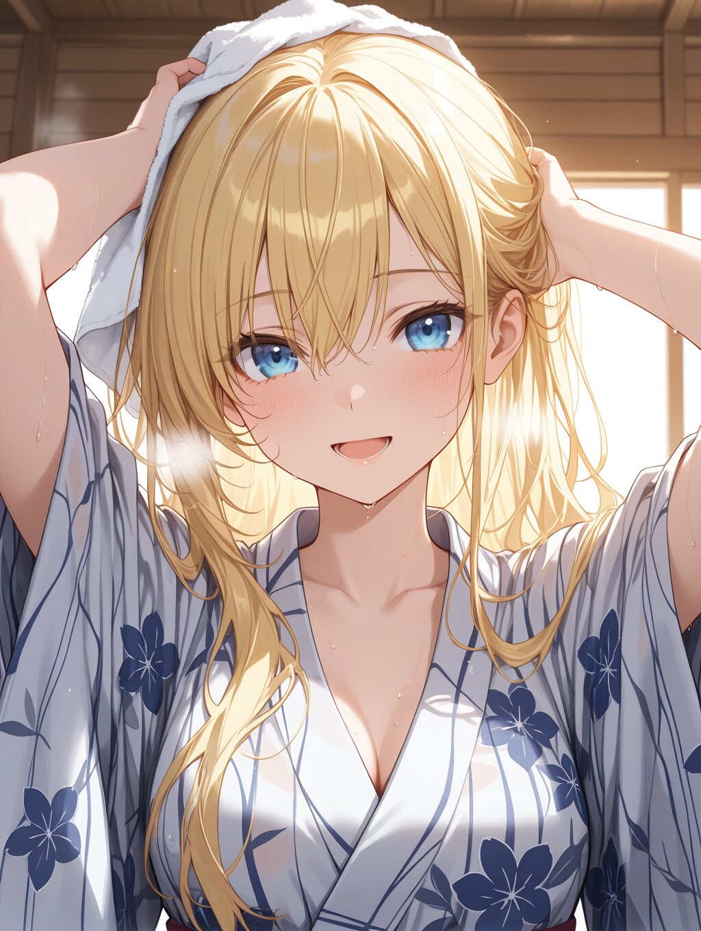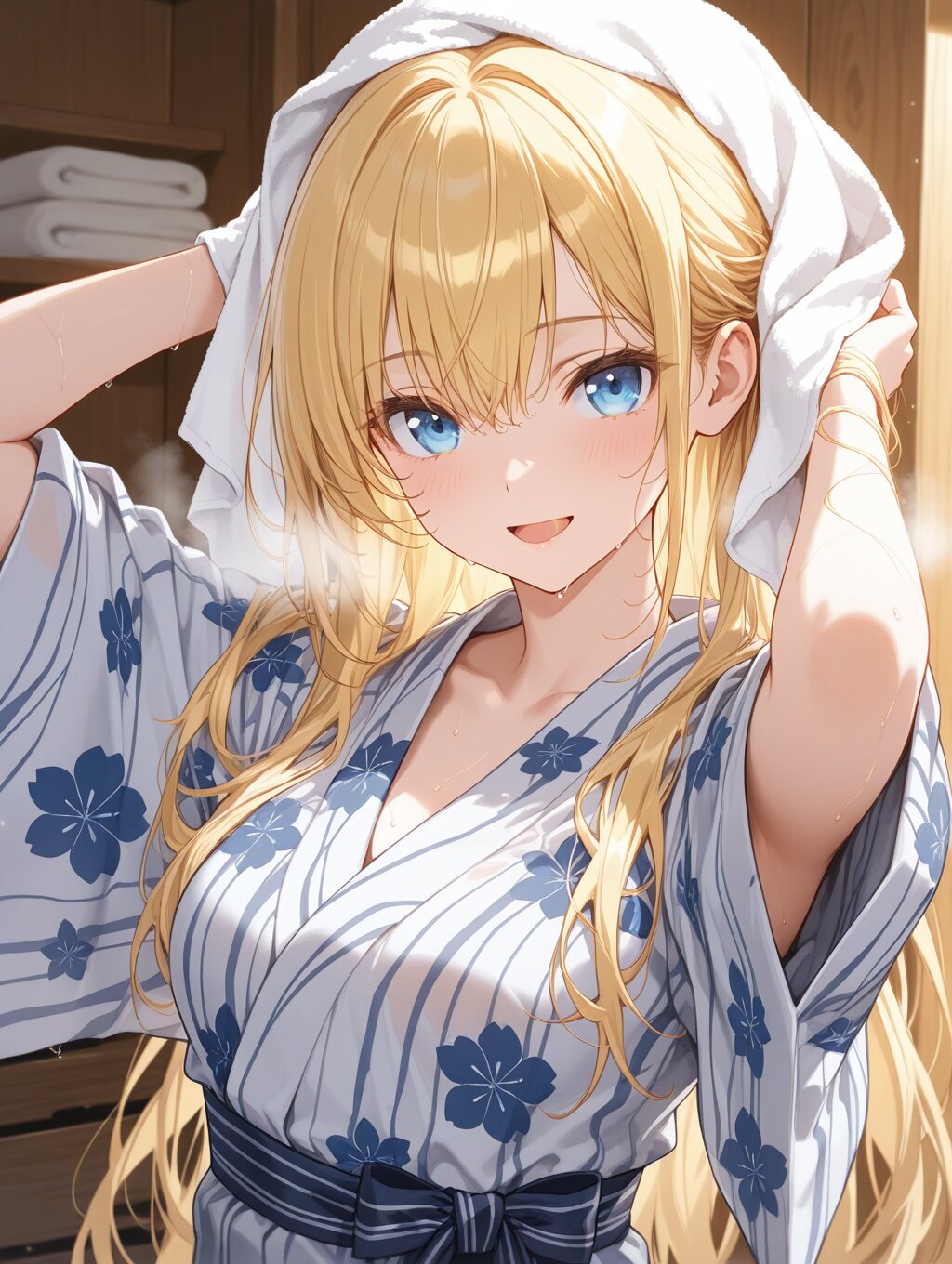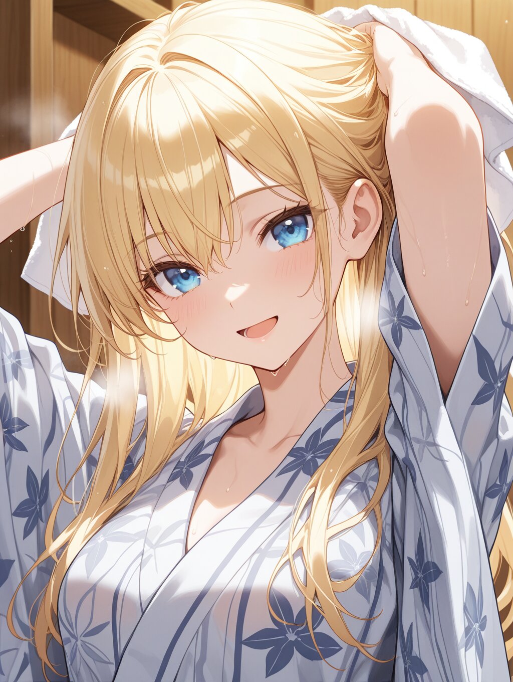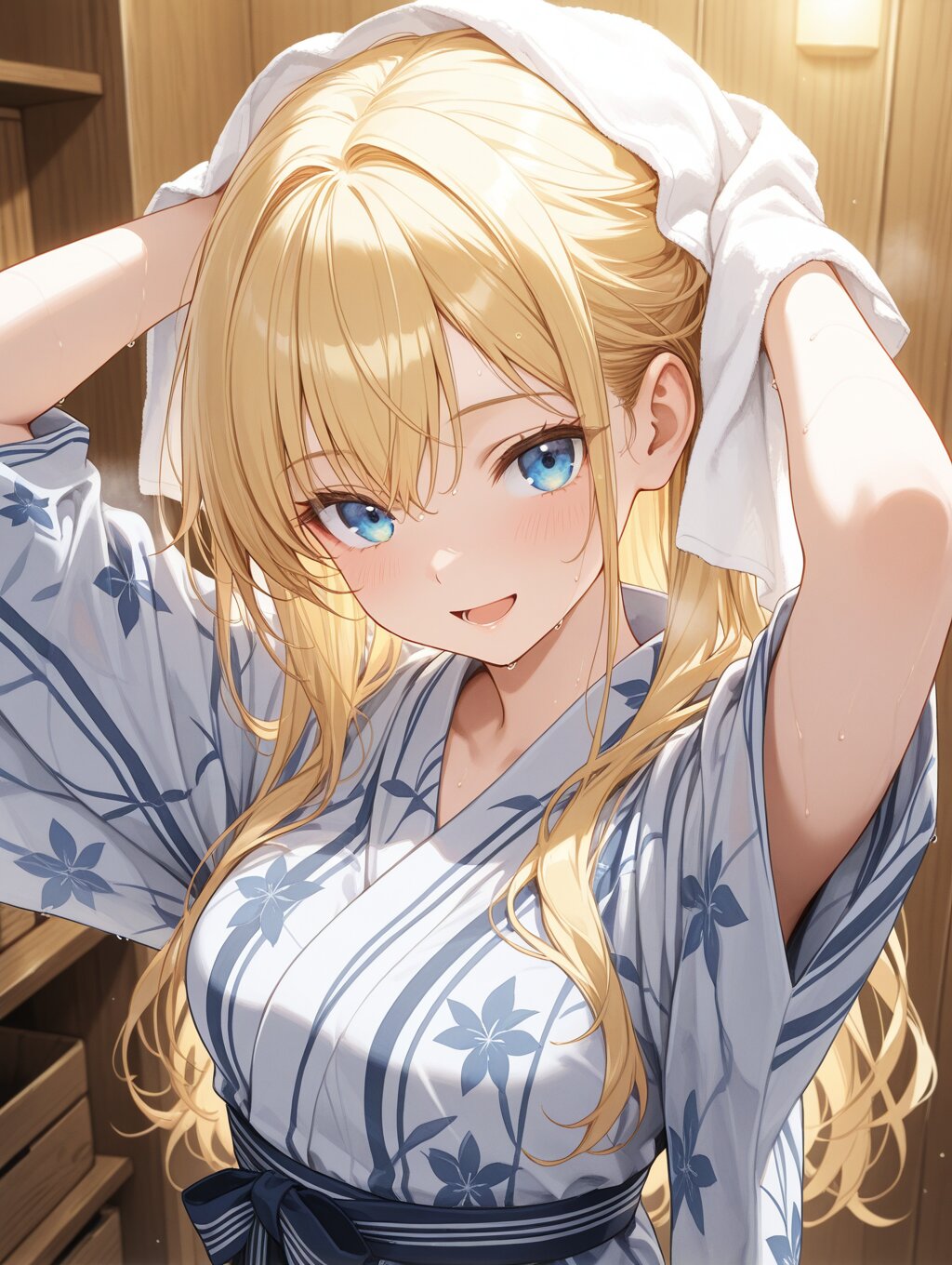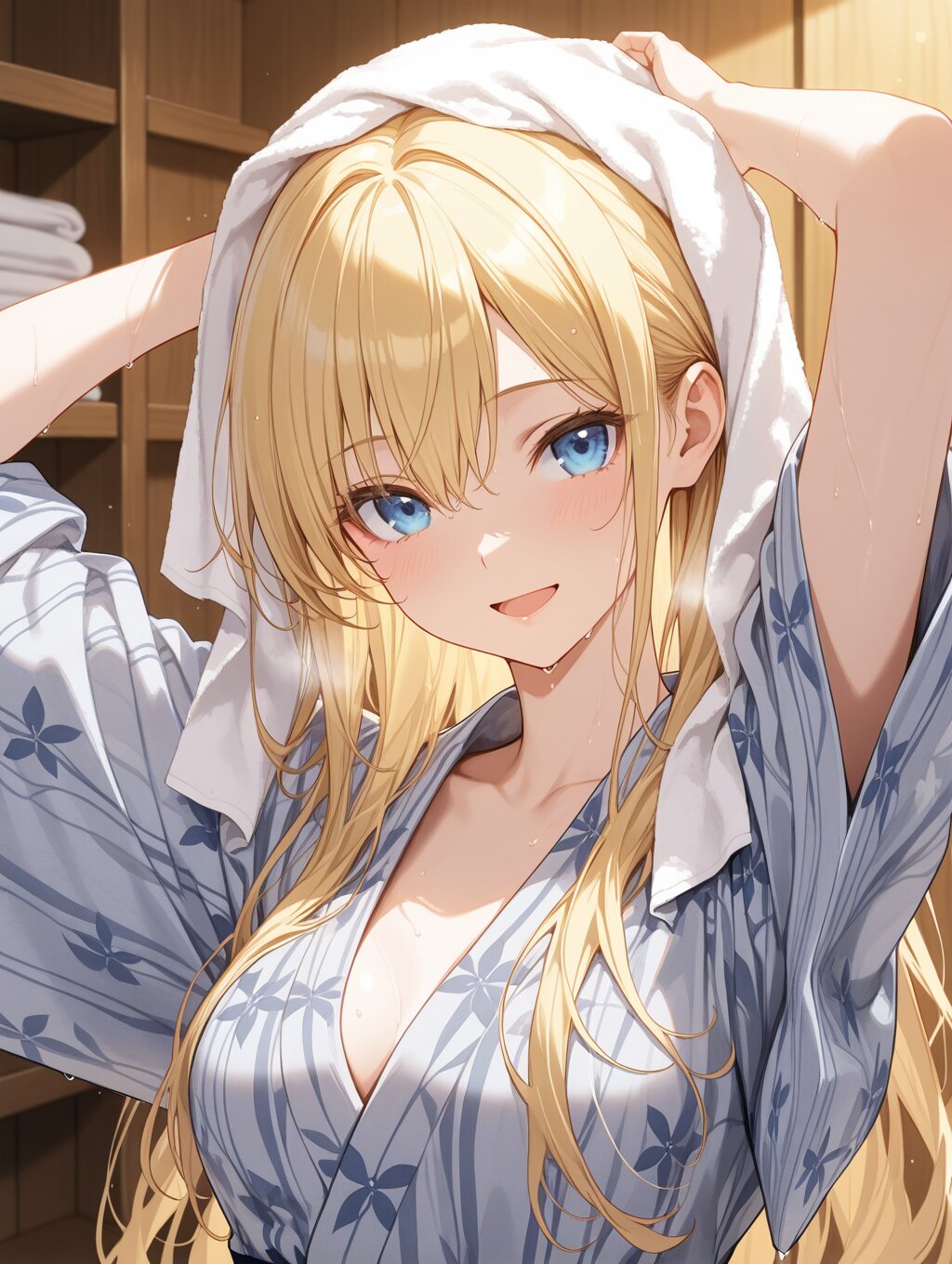 masterpiece,ultra detailed,detailed shading,detailed texture,(catchlight:1.3),highly detailed eyes,watery eyes,vivid,<lora:cveb6c5e878c739bt83g:0.4>, full head, (close-up:0.6),front view, wood changing room,upper_body,wet,steam,ryokan yukata,curl own hair with a towel,arms above head, 1girl,blue eyes,yellow long hair,medium breasts,open mouth,smile,seductive_smile,(closeing yukata:1.1),