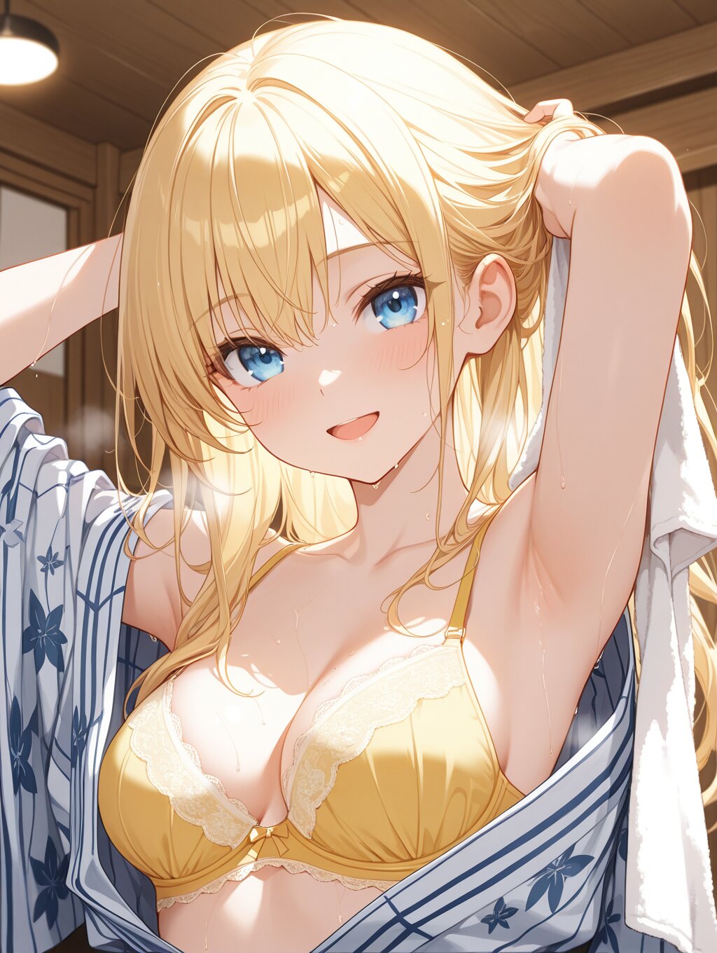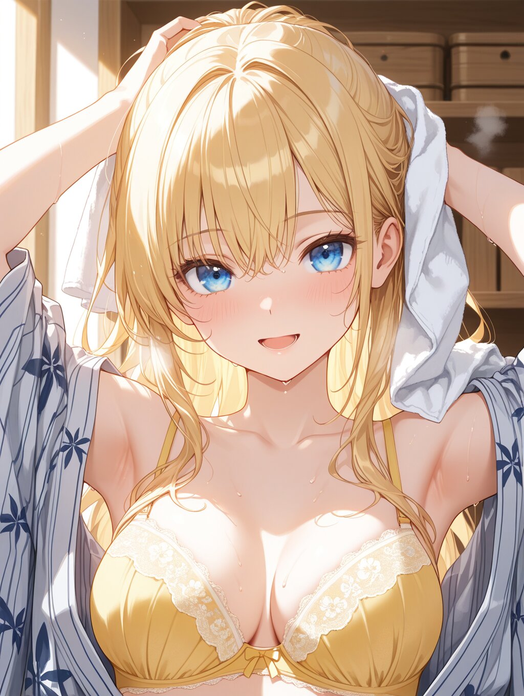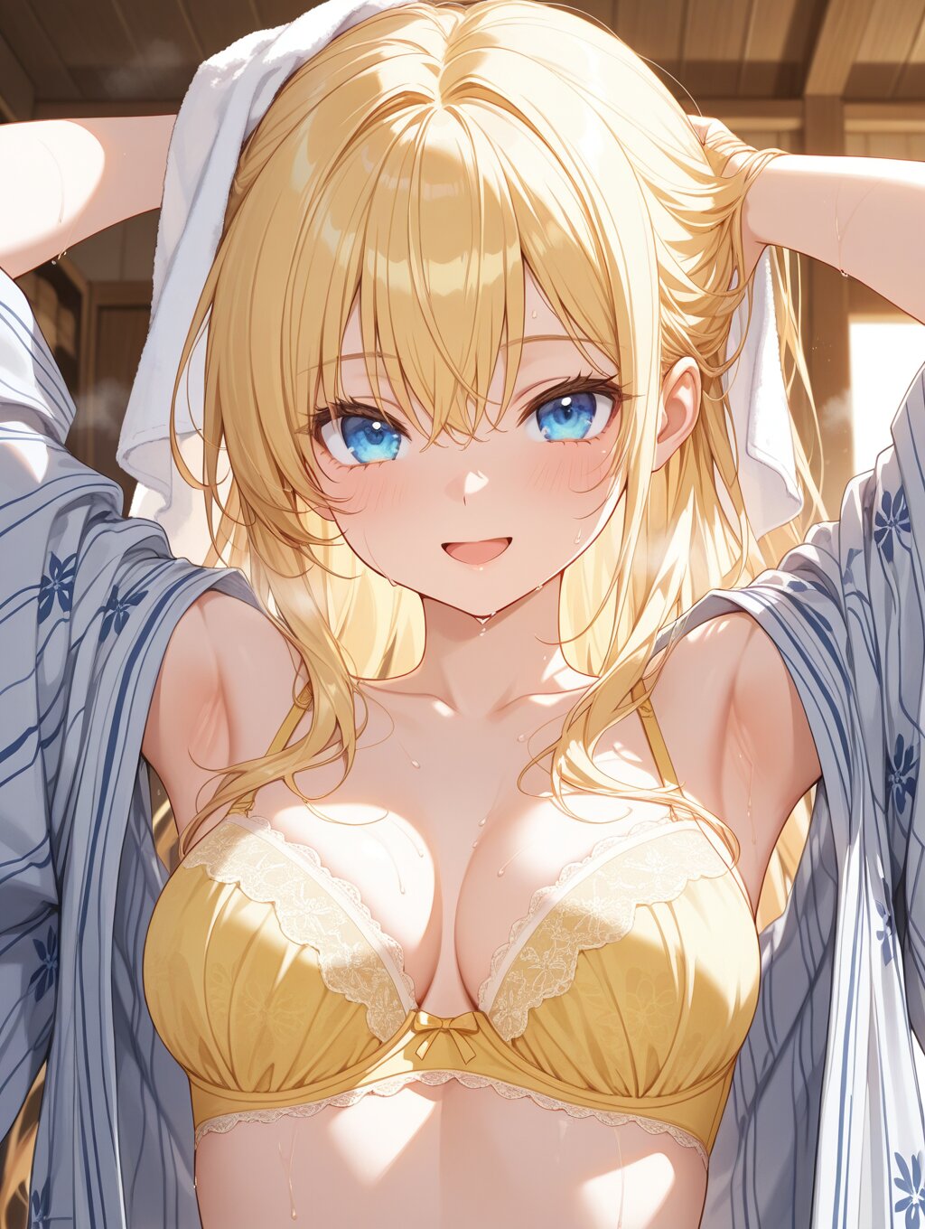 masterpiece,ultra detailed,detailed shading,detailed texture,(catchlight:1.3),highly detailed eyes,watery eyes,vivid,<lora:cveb6c5e878c739bt83g:0.4>, full head, (close-up:0.6),front view, wood changing room,upper_body,wet,steam,opened ryokan yukata,curl own hair with a towel,arms above head, 1girl,blue eyes,yellow long hair,medium breasts,(big breasts:0.8),open mouth,smile,armpits,seductive_smile,young,lace-trimmed detailed yellow bra,