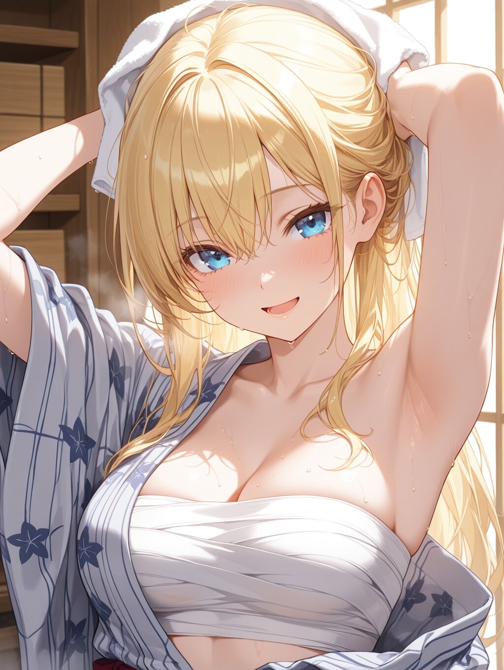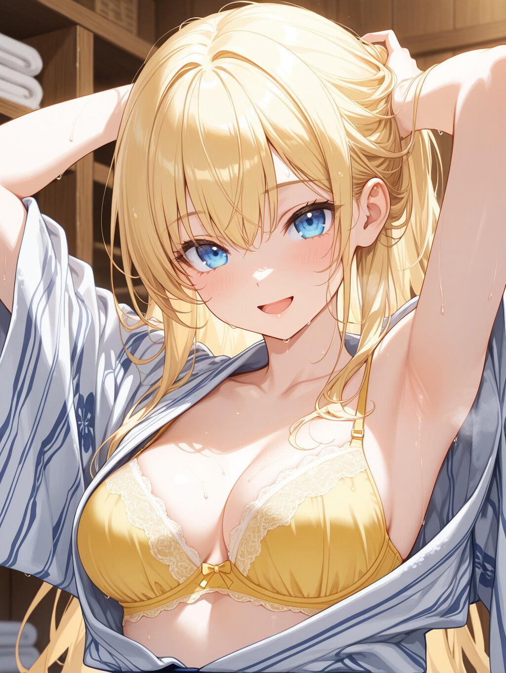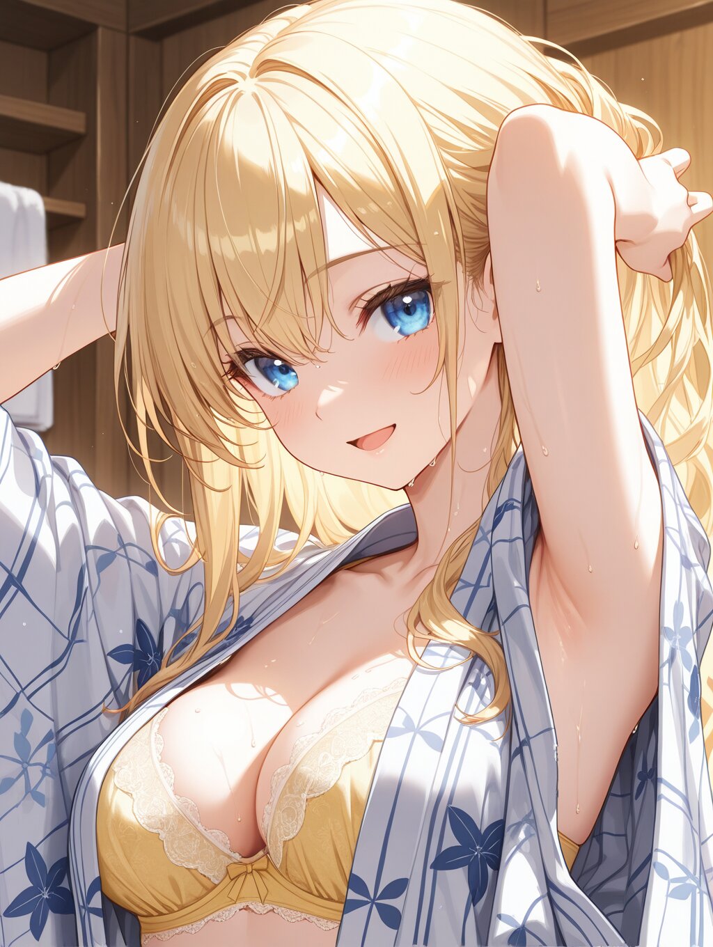 masterpiece,ultra detailed,detailed shading,detailed texture,(catchlight:1.3),highly detailed eyes,watery eyes,vivid,<lora:cveb6c5e878c739bt83g:0.4>, full head, (close-up:0.6),front view, wood changing room,upper_body,wet,steam,opened ryokan yukata,curl own hair with a towel,arms above head, 1girl,blue eyes,yellow long hair,medium breasts,(big breasts:0.8),open mouth,smile,armpits,seductive_smile,young,lace-trimmed detailed yellow bra,