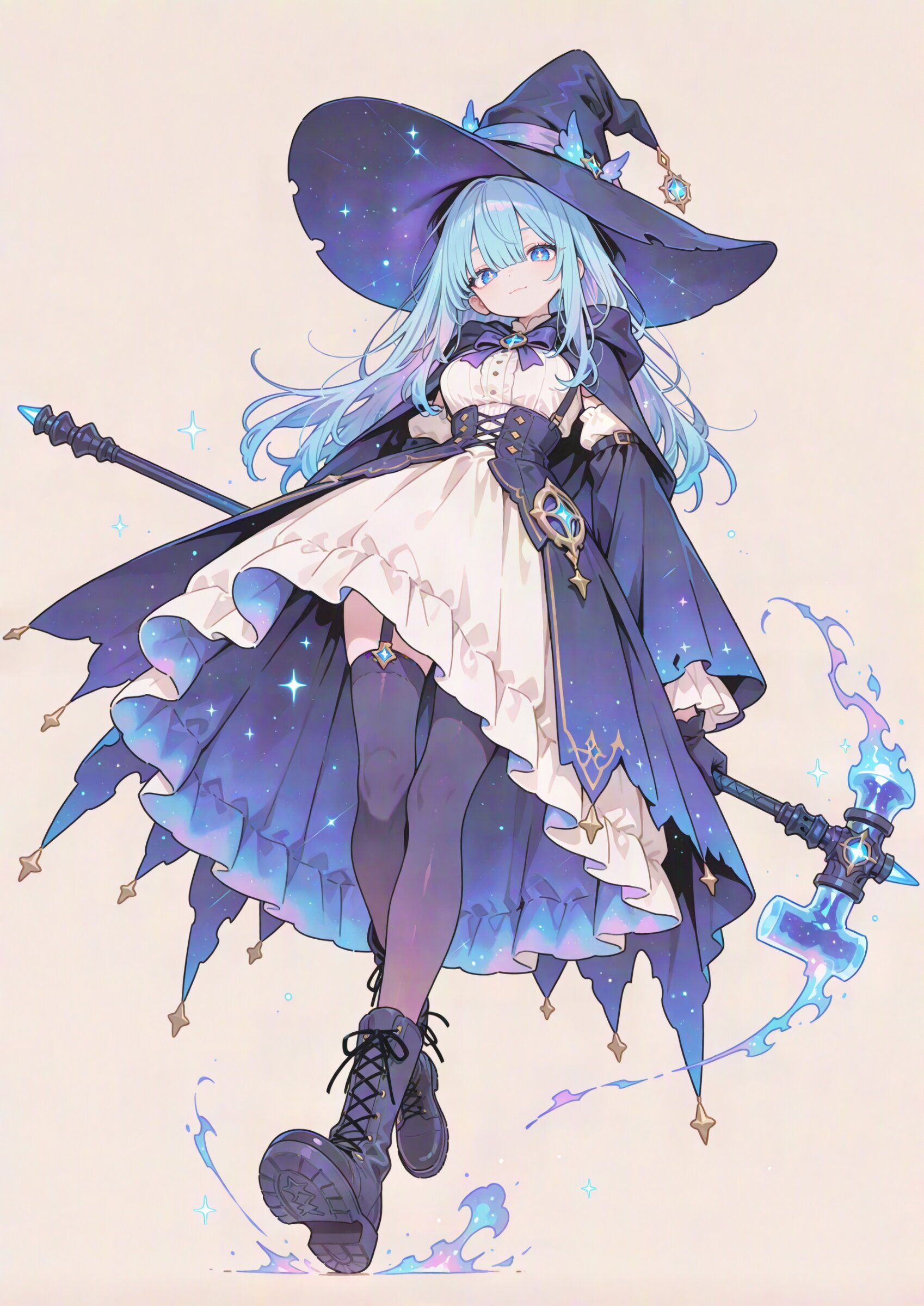 fullbody from below, looking down looking at viewer, 1girl, witch girl, blue eyes, beautiful iridescence eyes, beautiful detailed eyes, beautiful light blue hair, long bangs, long disheveled beautiful hair, first-rate female bodies, perfect body, beautiful breasts, framed breasts, cool face, (Beautiful Lips:0.7),, long hair, (stylish beautiful witch dress:1.2), detached sleeves, (cute dark blue and white witch girl costume:0.9), (white blouse:1.3), bow tie, witch long skirt (overskirt:1.1) black cloak, (blue galaxy witch hat:1.1), lace-up boots on feet, stockings and suspenders, under white long coat, pastel colors sepia scarf, glove, , mysterious face, significant smile,warm , (transparent energy swirls around body:1.1), floating huge hammer, flaming weapon, dramatic lighting, pastel colors sepia theme, spring atmosphere, spring \(season\), fleeing, midair, flying, masterpiece, best quality, amazing quality, very aesthetic, absurdres, newest, professional art lots of details, , overexposure, shiny-glistening, (watercolor style:0.0), (pastel color style:1.0) 4ur4_illu,shiny, glowing, glowing particles, glowing light particles, light particles, <lora:noline (1):1.0> <lora:sdxl2-flat2-512b:-0.2> <lora:facelightup_xl_v10:0.5> <lora:V2_yakumo_alchemy:0.5> <lora:Aura_illu:0.1>