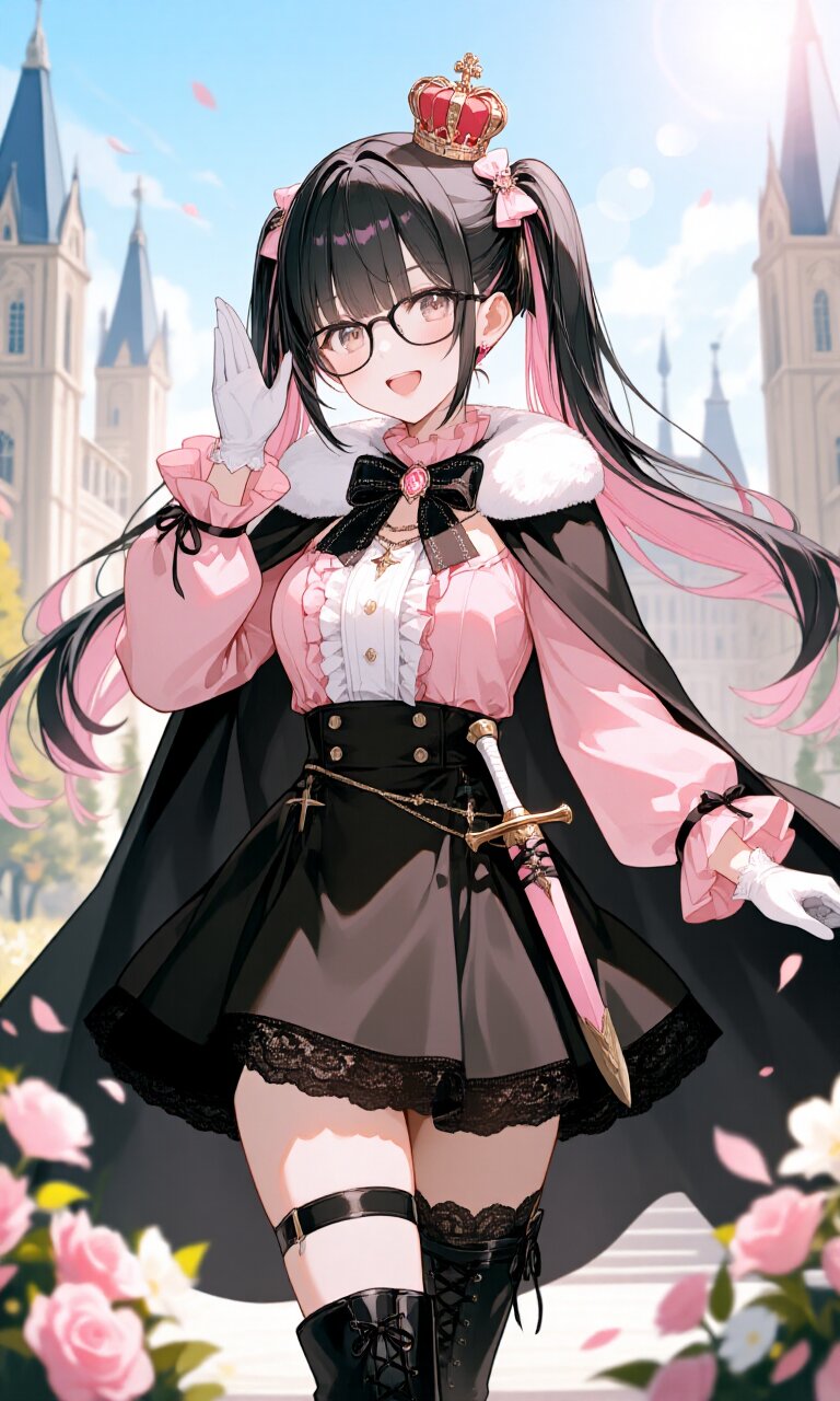 1girl, a 20-year-old woman with healthy skin, a delicate face, and a cheerful smile, wearing black frame glasses. She has long black hair styled in twin tails with pastel pink inner color, detailed and delicate. Her outfit is a (Pink luxurious Prince costume with ruffle-trimmed cuffs and high ruffle collar:1.6), featuring long sleeves and a detachable black grosgrain ribbon bow at the collar. She wears a (luxurious Black Cape:1.3), a (luxurious Black high waist mini skirt with Black lace hem:1.4), (luxurious Black Boots:1.3), and (luxurious White gloves:1.3). A (dagger on waist:1.3) and a (luxurious crown:1.4) complete her royal look. She poses happily in a cute stance, with an open-mouth smile and blush on her cheeks. The background is a grand Palace with Gothic architecture, set outside in the afternoon with flowers, lens flare, sunlight, and soft lighting creating a romantic academia atmosphere. The style is insanely detailed, masterpiece quality with beautiful 16k resolution, capturing every intricate detail of her clothes, skin, and hair.
