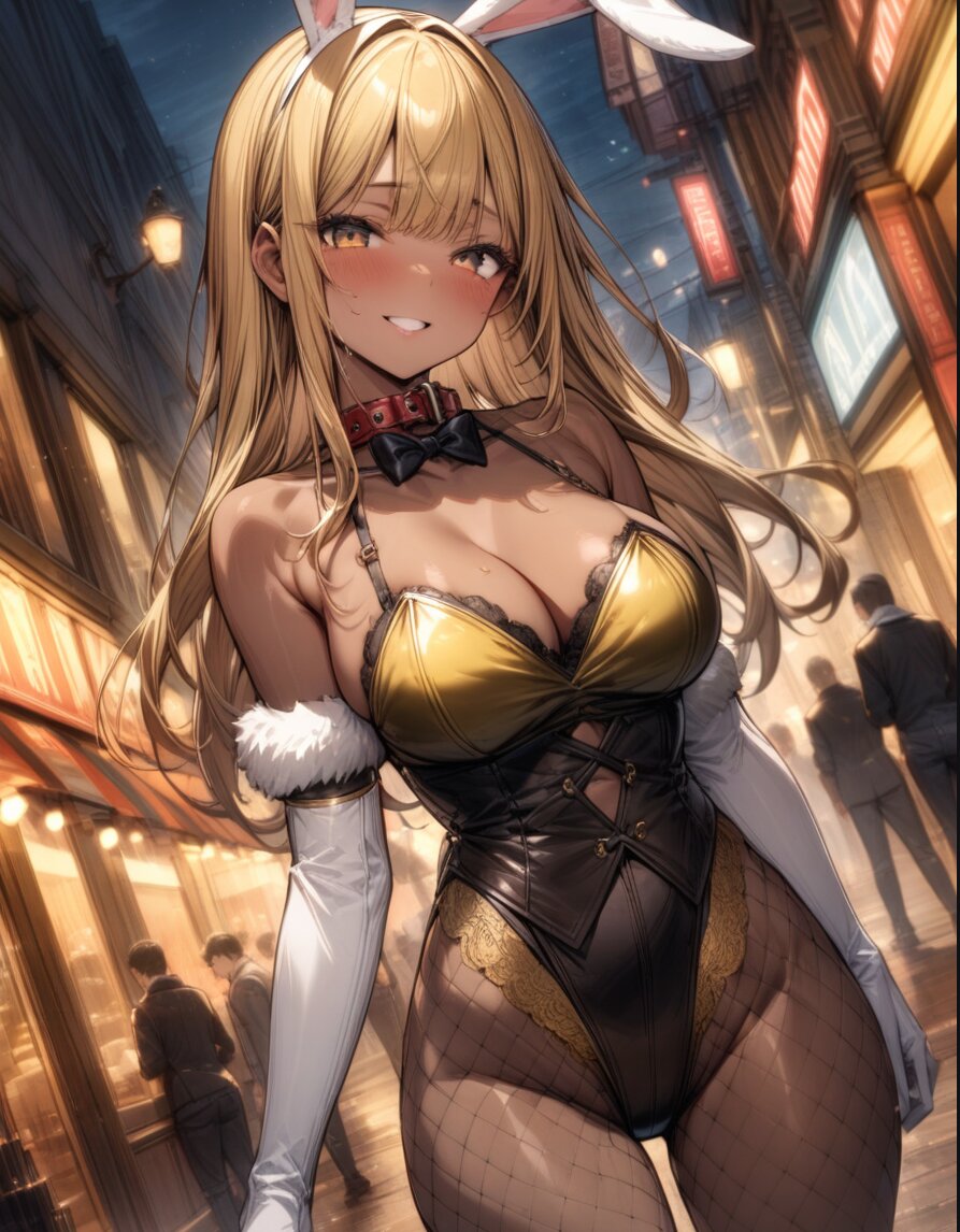 explicit,NSFW,((1 girl)), ((dark yellow bob hair)),[[[ahoge]]],(((very dark cupper eyes))),((bangs )),(long legs:1.2),(large breast and hips:1.2),(18 years old), (collar :1.4),smile, (gold and white Bunny suit1.5),(white rabbit ears:1.5), (Fishnet tights:1.2),bustier,bow tie,(gold garter belt:1.2),(fur :1.3),(high legs:1.7),,(elbow gloves:1.3),(brown skin:1.3), (standing), (owntown at night), ((looking at viewer),(upper body),(dynamic angle), ((masterpiece)),(best quality)),(Absurdres),(very aesthetic), <<lora:sdxl2-flat2-512b:-1.5> <lora:XDetail_light:1>
