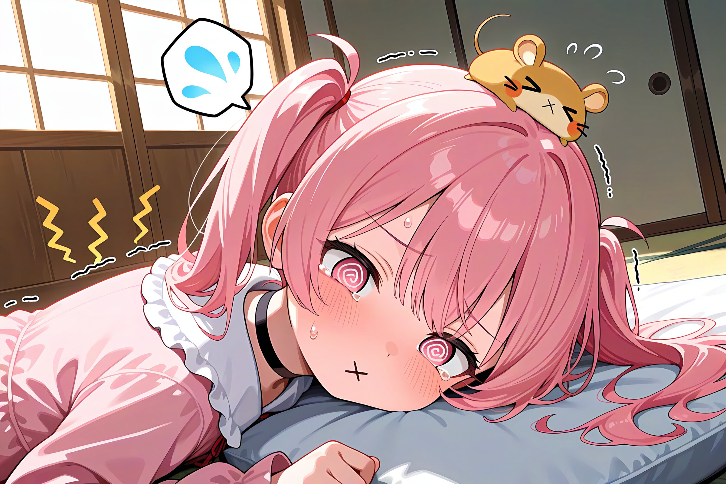 1 little girl, solo, upper body, diagonal angle, masterpiece, best quality, amazing quality, very aesthetic, pink hair, twintails, pink eyes, @_@, (:x:1.2), tears, tearful, choker, pink pajamas, lying, waist pain, (shout lines from back:1.2), trembling, comedic sweatdrop, flying sweatdrop, spoken flying sweatdrops, hamsters on head, > <, in japanese room,