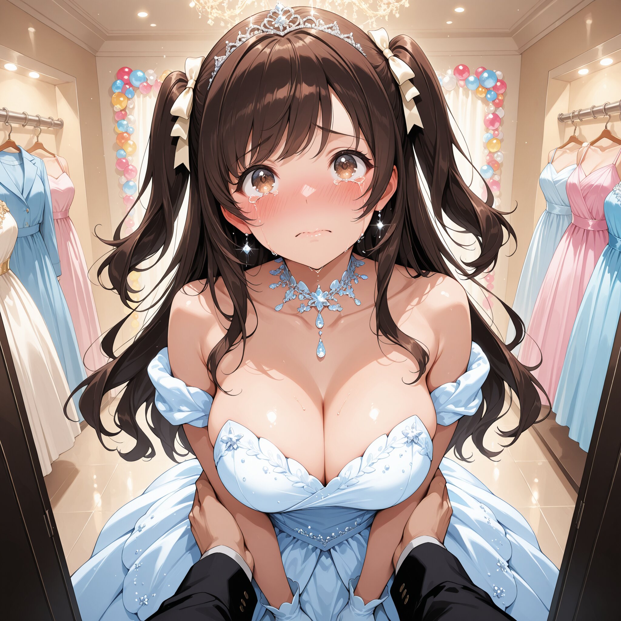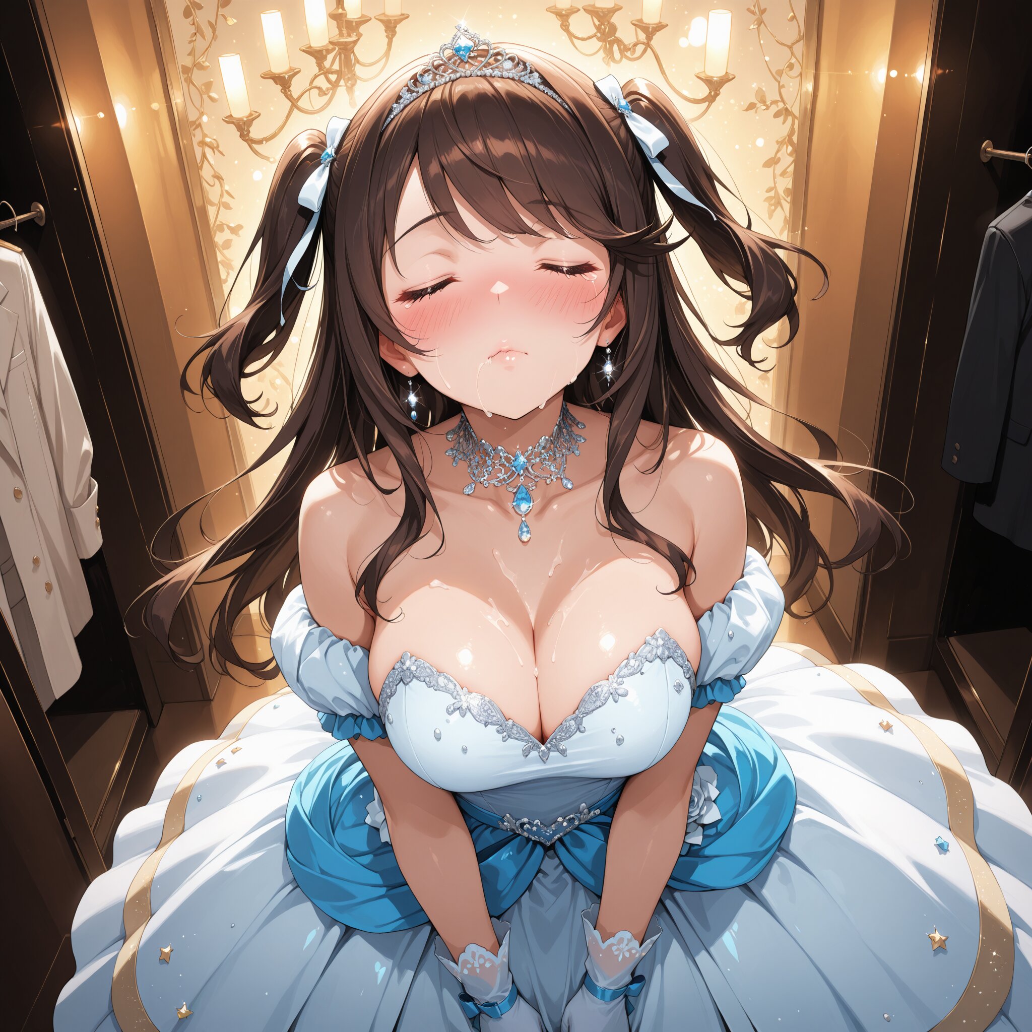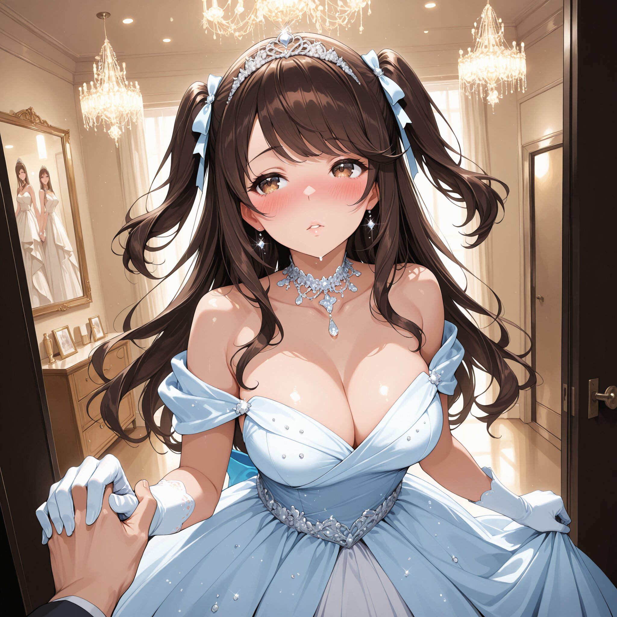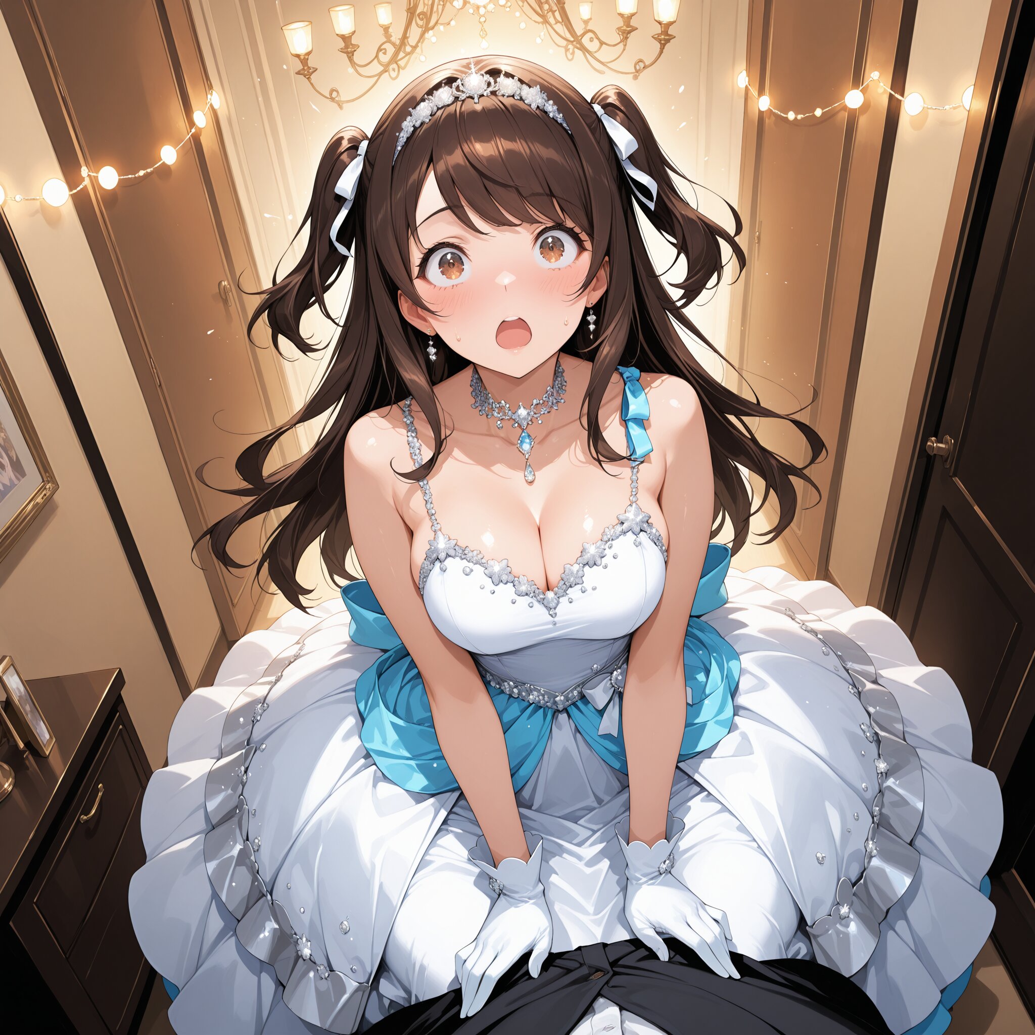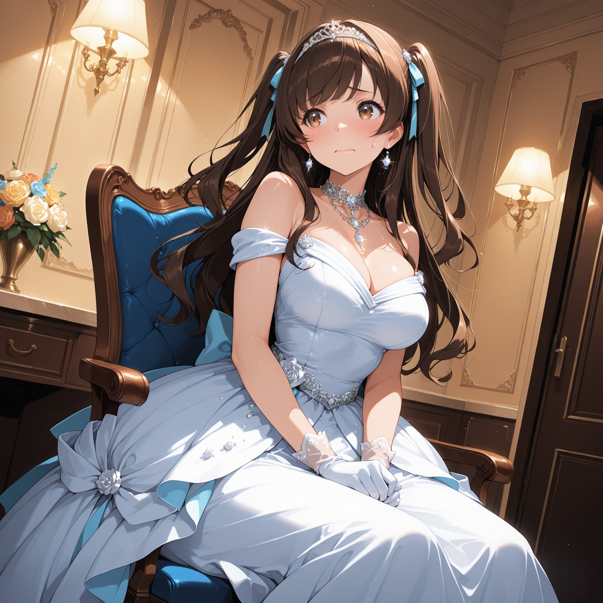 Masterpiece, top quality, superb quality, extremely beautiful, exquisite skin detail, captivating high resolution, exquisite detail, 8K, (beautiful breasts), curves, hairstyle (brown, flipped bangs, two side up), idol dress (beige, princess gown dress, glittery decorations, puffy dress and decorations on the shoulders, ribbon at the chest), glittery headband, sitting with her back against a chair, gloves, woman's expression (nervous), background (not a fancy dressing room), cinematic lighting, Dutch angle, side angle