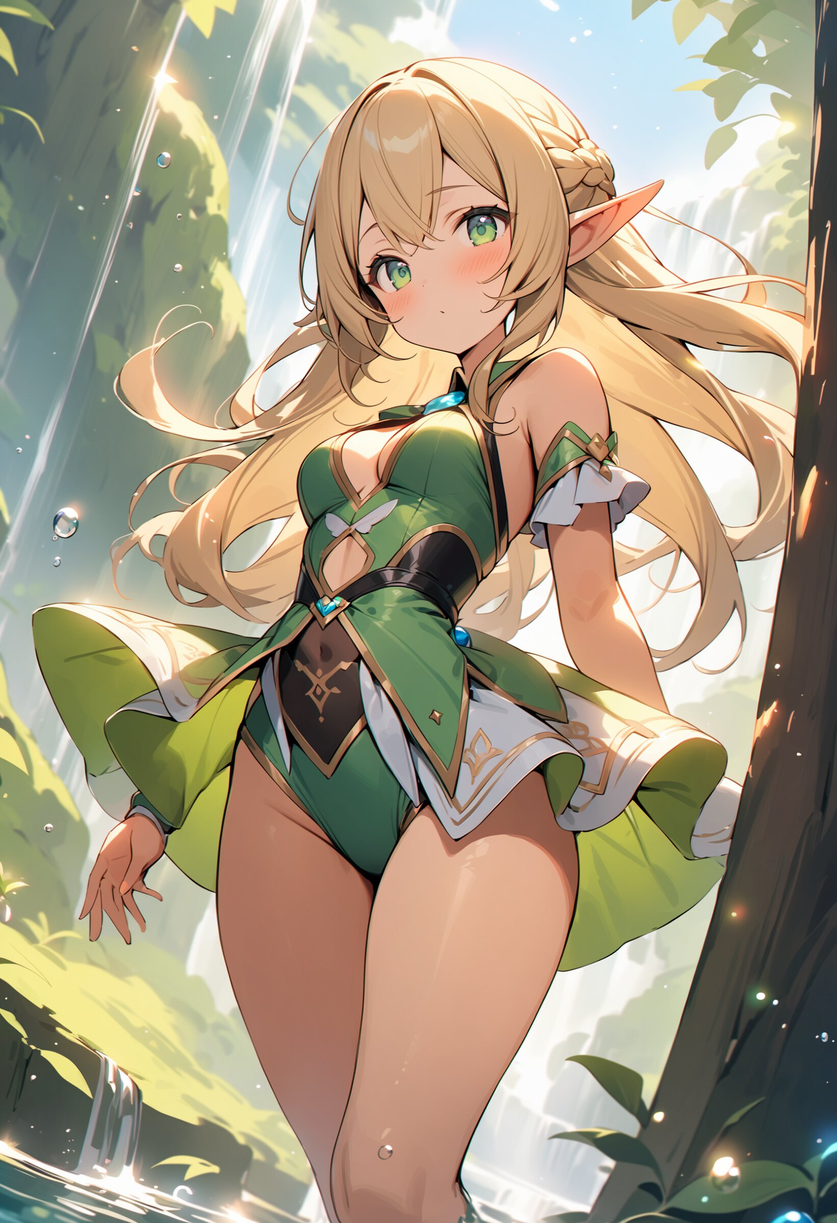 ((masterpiece)), ((best quality)), ((kawaii)), cute, (lovely), ((extremely detailed)), (beautiful), dynamic angle, a cute girl, 1girl, solo, ((elf)),beautiful blond hair, beautiful green eyes, ((beautiful eyes)), long hair, fantasy clothes,
