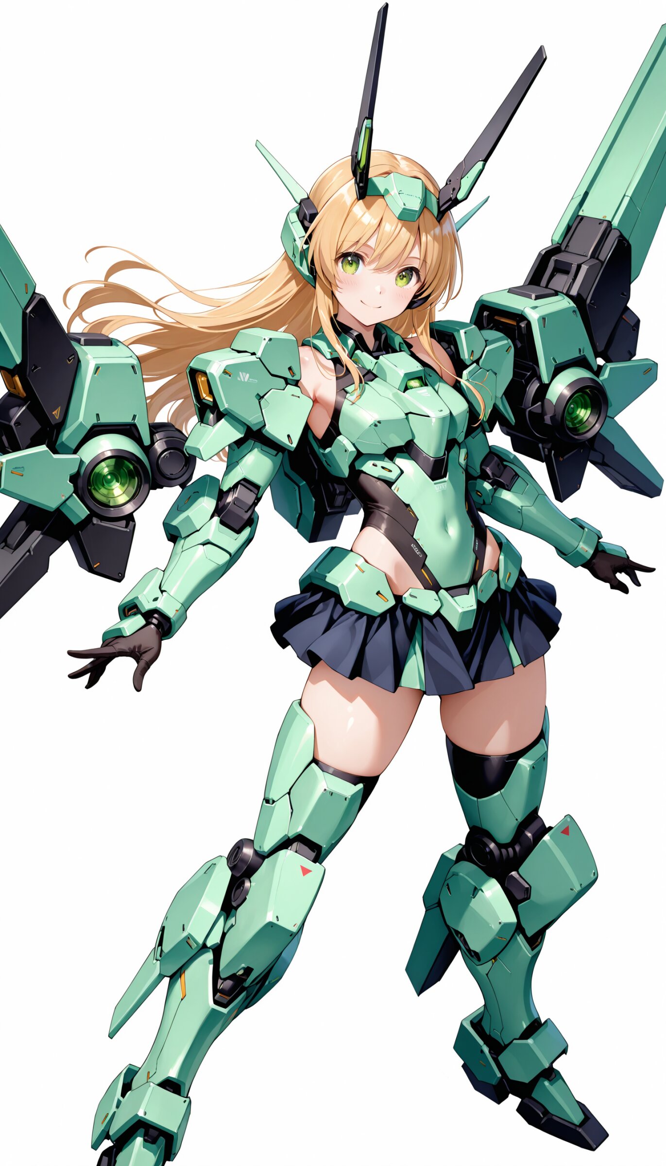 1girl, ((white background)), ultra detailed 8k cg render, masterpiece, high resolution, extremely detailed, mecha musume,mecha shoulder, mech leg, headgear, mecha armor, ((mini skirt)),long blonde hair, dropping green eyes, smile, dynamic posing,