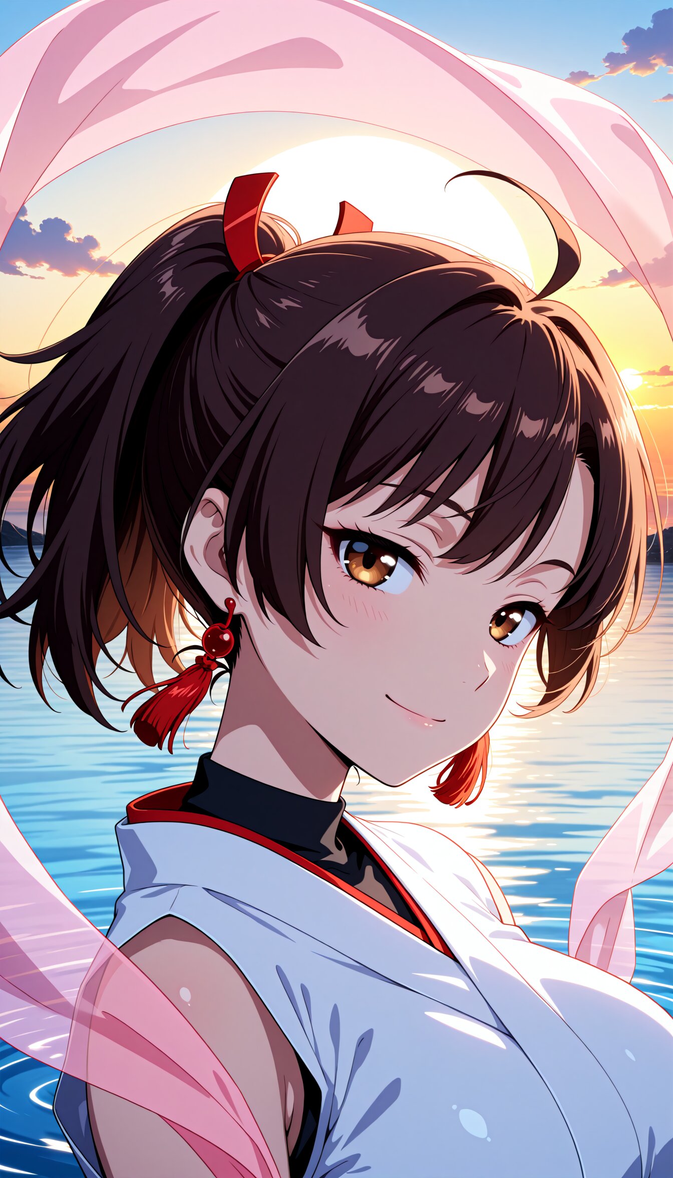 <lora:MeMax6-noob-vpred:1>,memaxl6_a,memaxl6_b,memaxl6_c,memaxl6_d,memaxl6_e, Full HD,32K, 1girl, solo, (portrait:2.0), from side, (closed mouth, smile, half-closed eyes:1.2, sideways glance:1.2, looking at viewer, ), (head tilt:1.2), (pink hagoromo:1.6), (teenage), (large breast:1.6), (slender):1.2, (tsurime):1.2, beautiful hair, shiny hair, dark-brown hair, (asymmetrical bangs:1.2), high ponytail, short ponytail, ahoge, (brown eyes:1.2), (sleeveless, japanese clothes:1.6, hair ornament, crop top, navel, midriff-baring outfit, white‑red miko, tassel earrings, black undershirt), (wind, morning, sunrise, water, ripples, ):1.2, (natural lighting:1.4, high contrast:1.3), masterpiece, best quality, super fine illustration, very aesthetic, newest, hyper detailed, intricate, beautiful, aesthetic, highly decorative, HDR, yume kawaii, ,anime screencap,anime,no gradients, 2D flat design, bold outlines, 10's anime style,