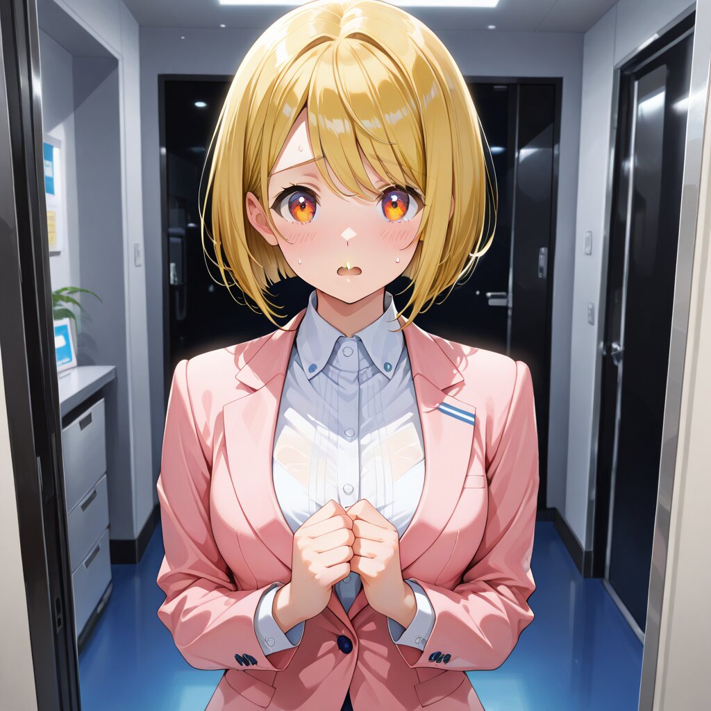 (masterpiece,high resolusion,illustration,ultra detailed 8k art,extremely detailed CG,official art,clothes reflecting light,detailed shiny skin,detailed background:1.3), ((highly detailed beautiful face and eyes)),1girl,beautiful blonde hair,beautiful blue eyes,open mouth,looking at viewer,race Queen costume,(fullbody shot:1.4), masterpiece, best quality, anime style, 1woman, solo, adult office lady, upper body, medium shot, standing indoors, office background, soft indoor lighting, short bob hair, soft pinkish lime yellow hair, slightly rounded bob cut, side-swept bangs, smooth hair texture, amber eyes, fair skin, worried expression, slightly confused face, small open mouth, subtle sweat drop on cheek, looking forward, light pink business blazer, fitted office jacket, white inner blouse, simple formal office wear, neat and clean appearance, hands gently clasped in front of lower abdomen, modest posture, feminine silhouette, calm composition, clean lineart, soft pastel colors, smooth shading, polished anime illustration, simple modern office interior, natural atmosphere