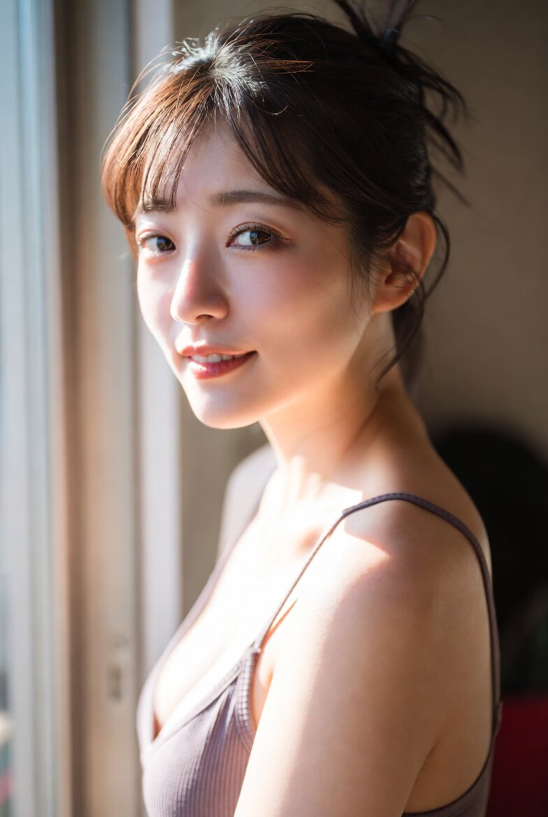 日本人女性25歳のリアルなフォト。プロのカメラマンによる撮影の仕上がり。キャミソールを着けている。窓際で自然光。表情は笑顔で撮影者に顔を向けている。横からの構図。