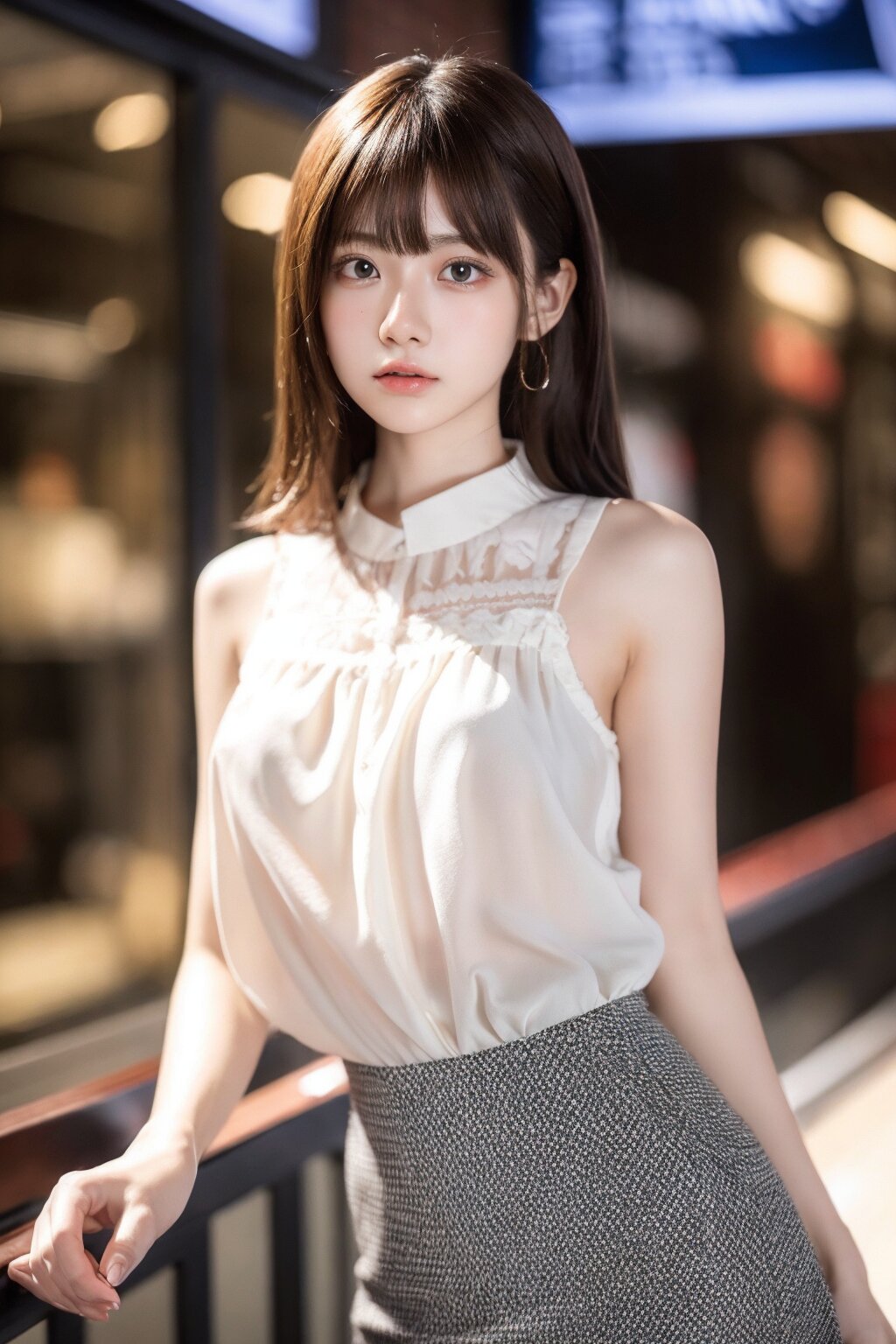 masterpiece, RAW photo, hyper detailed, 16K, extremely detailed CG, Japanese woman, 23yo, ((solo)), cute, pretty, hyper detailed eye, hyper detailed face, medium hair, bangs, extremely detailed, thin, tall, perfect anatomy, good proportion, extremely detailed body, perfect proportion, blouse,short skirt, extremely detailed blouse and skirt, hyper detailed background,